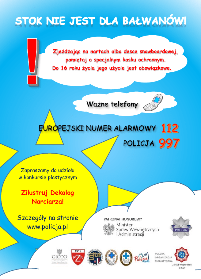 Zjeżdżając na nartach albo desce snowboardowej, pamiętaj o specjalnym kasku ochronnym. Do 16 roku życia jego użycie jest obowiązkowe. Ważne telefony EUROPEJSKI NUMER ALARMOWY POLICJA Zapraszamy do udziału w konkursie plastycznym Zilustruj Dekalog Narciarza! Szczegóły na stronie www.policja.pl 1 3 WZGLĄD NA INNE OSOBY Na stoku zachowuj się tak, by nie stwarzać niebezpieczeństwa dla innych. 2 WYBÓR TORU JAZDY Zjeżdżaj z szybkością dostosowaną do swoich umiejętności, rodzaju trasy i warunków atmosferycznych. Zjeżdżając z góry, musisz ustalić taki tor jazdy, aby nie zderzyć się z osobą jadącą przed Tobą. 4 5 7 9 PANOWANIE NAD SZYBKOŚCIĄ I SPOSOBEM JAZDY WYPRZEDZANIE Wyprzedzając, zachowaj odległość, która nie ograniczy wyprzedzanemu swobody poruszania się. RUSZANIE Z MIEJSCA I PORUSZANIE SIĘ W GÓRĘ STOKU Wjeżdżając na oznakowaną drogę zjazdu, ruszając ponownie po zatrzymaniu się, czy też poruszając się w górę stoku, musisz spojrzeć i w górę i w dół stoku, żeby upewnić się, że możesz to uczynić bez zagrożenia dla siebie i innych. 6 ZATRZYMANIE NA TRASIE Unikaj zatrzymania się na trasie zjazdu, zwłaszcza w miejscach zwężeń i miejscach o ograniczonej widoczności. Po ewentualnym upadku usuń się jak najszybciej z toru jazdy. PODCHODZENIE I SCHODZENIE Podchodzić lub schodzić na nogach możesz wyłącznie skrajem trasy. ZACHOWANIE SIĘ W RAZIE WYPADKU W razie wypadku każdy, kto znajdzie się w pobliżu powinien poszkodowanemu spieszyć z pomocą. 8 10 8 PRZESTRZEGANIE ZNAKÓW NARCIARSKICH Stosuj się do znaków narciarskich ustawionych na trasach. OBOWIĄZEK UJAWNIENIA TOŻSAMOŚCI Będąc uczestnikiem wypadku, musisz podać swoje dane osobowe.