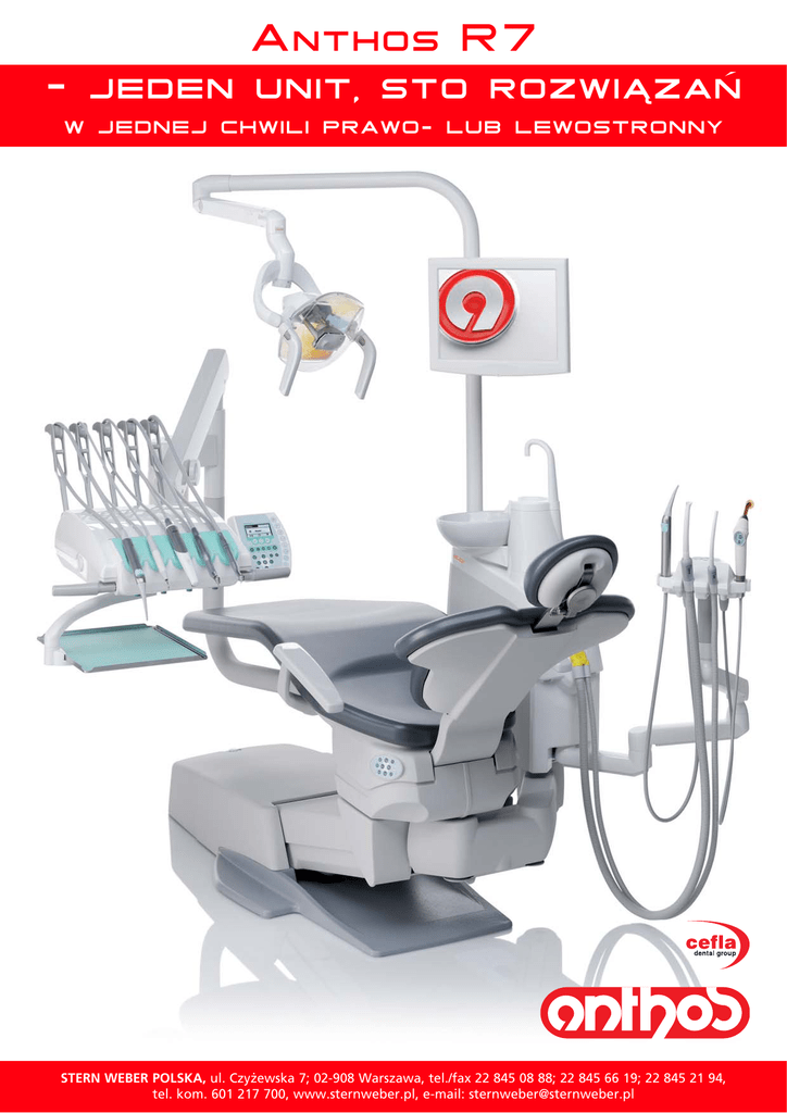 Anthos R7 - jeden unit, sto rozwiàzaƒ w jednej chwili prawo- lub lewostronny STERN WEBER POLSKA, ul. Czy˝ewska 7; 02-908 Warszawa, tel./fax 22 845 08 88; 22 845 66 19; 22 845 21 94, tel. kom. 601 217 700, www.sternweber.pl, e-mail: [email protected] R7 continental b∏yskawiczne dostosowanie dzi´ki systemowi quickswitch concept - w jednej chwili prawo- lub lewostronny Staranny dobór materia∏ów gwarancjà jakoÊci i optymalnej funkcjonalnoÊci R7 international (r´kawy od do∏u) Zastosowanie elektroniki najnowszej generacji minimalizuje awaryjnoÊç urzàdzenia Quickswitch concept Mo˝liwoÊç szybkiej zmiany po∏o˝enia stolika lekarza i bloku spluwaczki po prawej lub lewej stronie fotela w trzech krokach 1. 2. 3. inspiruje nas Tw Lampa operacyjna Venus Plus • p∏ynna regulacja intensywnoÊci oÊwietlenia w zakresie 8000–35000 luksów • praca g∏owicy w trzech p∏aszczyznach • owalny kszta∏t oÊwietlanego pola • zdejmowalne uchwyty z mo˝liwoÊcià zmiany ustawienia (do góry/do do∏u) Panel asysty • na potrójnym ramieniu i miejscem na 4 instrumenty Misa spluwaczki • porcelanowa, zdejmowana, obrót o 270º, nap´d elektryczny (opcja) Zag∏ówek • z blokadà pneumatycznà i pracà w 3 p∏aszczyznach (opcja) • dodatkowe sterowanie funkcjami fotela Nap´d hyd • zmiana po∏o˝enia • udêwig – 240 kg Wielofunkcyjny naciskowy sterownik · ny (standard) noz (opcja) wój talent obrotowy fotel (+/- 30°) Obieg wody destylowanej z ∏atwo dost´pnym zbiornikiem Panel sterowania • du˝y, czytelny wyÊwietlacz • bezpoÊredni dost´p do wszystkich funkcji Elektryczny mikromotor Cefla • indukcyjny (bezszczotkowy), wysoka moc (4 N/cm2) • funkcja autorewersu i autoforwardu i regulacja momentu obrotowego (opcja) Ustawienie dla lewor´cznego operatora Obrotowy fotel (+/- 30°) Reklama nie jest ofertà handlowà w Êwietle rozumienia prawa drauliczny fotela a siedziska – 38÷82 cm Obrazy mówià g∏oÊniej ni˝ s∏owa Profesjonalna kamera wewnàtrzustna CU-2 w standardzie wyposa˝enia R7 (z oryginalnym uchwytem i monitorem LCD) Mo˝liwoÊç monta˝u kamery na stoliku lekarza lub panelu asysty Unit Anthos R7 pozwala na nieograniczonà liczb´ ustawieƒ stolika lekarza i bloku spluwaczki wzgl´dem pola operacyjnego. Daje to maksymalnà swobod´ operatorowi i asyÊcie bez wzgl´du na dotychczasowe doÊwiadczenia i warunki zabiegu. dost´pne kolory tapicerki: 102 106 113 136 134 135 115 103 138 123 133 101 137 121 130 Kompletny system higieny aktywnej i pasywnej gwarantuje bezpieczeƒstwo. Elementy unitu majàce kontakt z pacjentem lub lekarzem w trakcie zabiegu mo˝na zabezpieczyç os∏onami jednorazowymi lub ∏atwo zdemontowaç do pe∏nej dezynfekcji. Na ka˝dym etapie produkcji wszystkie starannie dobrane komponenty unitu Anthos podlegajà rygorystycznym testom jakoÊci tak, aby zaoferowaç stomatologowi doskona∏e narz´dzie. Cykl produkcji zakoƒczony jest pe∏nà, udokumentowanà, czterogodzinnà symulacjà pracy. anatomiczny kszta∏t tapicerki krzese∏ko asysty i lekarza amplituda wysokoÊci siedziska 38-82 cm Odchylany prawy pod∏okietnik fotela. Cienkie oparcie fotela umo˝liwia lekarzowi optymalny dost´p do pola operacyjnego. Unit Anthos R7 zaprojektowano tak, aby lekarz i asystent mogli pracowaç bez ˝adnych przeszkód. Uk∏ad hudrauliczny fotela zapewnia p∏ynnà, cichà prac´, delikatne ruszanie i zatrzymywanie. Stern Serwis - profesjonalne wsparcie techniczne dla u˝ytkowników i serwisu lokalnego pon.-pt. w godzinach 9-19, tel. 602 319 809 Stern Kredyt - wygodny sposób finansowania zakupu sprz´tu stomatologicznego i nie tylko... Ró˝nica w wysokoÊci miesi´cznej raty za unit producenta „X” o wartoÊci 40.000 z∏ (oko∏o 650 z∏ miesi´cznie) i za unit Anthos o wartoÊci 60.000 z∏ (rata oko∏o 950 z∏) to jedynie oko∏o 300 z∏! Czy jest to kwota, dla której nale˝y rezygnowaç z ergonomii, funkcjonalnoÊci i bezawaryjnoÊci, którà oferuje firma Stern Weber? Awarie, przerwy w pracy powodujà, ˝e unit taƒszy w zakupie mo˝e okazaç si´ radykalnie dro˝szy w eksploatacji. Pami´taj! Prawdziwà cen´ unitu poznaje si´ po kilku latach jego u˝ytkowania! Firma STERN WEBER POLSKA umo˝liwia swoim klientom dokonanie zakupu sprz´tu stomatologicznego (unity STERN WEBER, ANTHOS, CASTELLINI i sprz´t radiologiczny MYRAY i QR) oraz urzàdzeƒ niemedycznych takich jak: klimatyzacja, meble i inne w po˝yczce z∏otówkowej. Jednym z podstawowych za∏o˝eƒ tej oferty jest maksymalne uproszczenie procedur, zminimalizowanie formalnoÊci przy zachowaniu atrakcyjnoÊci finansowania. Do za∏atwienia formalnoÊci (po˝yczka do 500.000 PLN) niezb´dne jest posiadanie ni˝ej wymienionych dokumentów (dla osób fizycznych i spó∏ek osobowych): 1. ZaÊwiadczenie o prowadzonej dzia∏alnoÊci gospodarczej – w przypadku spó∏ek dodatkowo umowa i dokumenty rejestracyjne. Zadzwoƒ! Skontaktujemy Ciebie z u˝ytkownikiem unitu Anthos w Twoim regionie w celu uzyskania opinii o sprz´cie i wspó∏pracy z firmà Stern Weber Polska w okresie gwarancji i podczas obs∏ugi pogwarancyjnej. Ponad 90% unitów sprzedajemy z rekomendacji u˝ytkowników. 2. Dowód osobisty osoby reprezentujàcej podmiot gospodarczy (i wspó∏ma∏˝onka). 3. Decyzja nadania NIP i REGON. 4. Pieczàtka firmy i prawo wykonywania zawodu. • Zabezpieczeniem jest weksel i umowa przew∏aszczenia. • Wszystkie procedury dla wygody za∏atwiane sà w gabinecie. • Mo˝liwy „zerowy” udzia∏ nabywcy • Jedyny dodatkowy koszt to ubezpiecznie sprz´tu (0,7% od wartoÊci) Informacje: Grzegorz Wolak, 509 141 179, [email protected] STERN KREDYT – wspólny produkt STERN WEBER POLSKA i SIEMENS FINANCE JesteÊmy do Paƒstwa us∏ug! jak do nas trafiç: Na zdj´ciach reklamowych wszystkie unity wyglàdajà podobnie. Zapraszamy do naszego salonu, gdzie sta∏a ekspozycja 12 zestawów pozwoli zaprezentowaç przewagi naszych unitów! Sadyba Best Mall Wilanów Cen