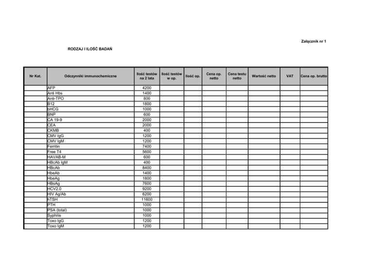 Załącznik nr 1 RODZAJ I ILOŚĆ BADAŃ Nr Kat. Odczynniki immunochemiczne AFP Anti Hbs Anti-TPO B12 bHCG BNP CA 19-9 CEA CKMB CMV IgG CMV IgM Ferritin Free T4 HAVAB-M HBcAb IgM HBcAb HbeAb HbeAg HBsAg HCV2.0 HIV Ag/Ab hTSH PTH PSA (total) Syphilis Toxo IgG Toxo IgM Ilość testów na 2 lata 4200 1400 800 1800 1000 600 2000 2000 400 1200 1200 7400 5600 600 400 8400 1400 1800 7600 9200 6200 11600 1000 1000 1000 1200 1200 Ilość testów Ilość op. w op. Cena op. netto Cena testu netto Wartość netto VAT Cena op. brutto Troponin-l Urine NGAL Valproic Acid 8800 200 200 91400 Razem: Materiały zużywaIne Razem: Kalibratory i kontrole Razem: Ogółem: Nr Kat. Odczynniki biochemiczne Albumina Amoniak Alkohol (Ethanol) ALT AST ASO Amylaza CRP Białko całkowite Białko/mocz Bilirubina całkowita Bilirubina bezpośrednia Chlorki Cholesterol całkowity Cholesterol HDL Czynnik reumatoidalny (RF) Fosfataza alkaliczna Fosfor nieorganiczny Gammaglutamylotrasnpeptydaza Glukoza Hemoglobina glikowana (HbA1C) Immunoglobuliny A Immunoglobuliny G Ilość testów 13000 1900 3400 45000 61000 600 12000 65000 16400 800 24000 600 90000 12000 7200 800 18000 11200 30000 69000 800 2900 3400 Ilość testów Ilość op. w op. Cena op. netto Cena testu netto Wartość netto VAT Cena op. brutto Immunoglobuliny IgE Immunoglobuliny M Kinaza kreatynowa (CK) Kreatynina Kwas moczowy Magnez Mocznik Potas Sód Karbamazepina Triglicerydy Wapń całkowity Żelazo Kwas walproinowy Kreatynina enzymatyczna Razem: 1500 2200 800 90000 4400 9000 84000 106000 104000 400 12000 12000 7300 400 4200 927200 Materiały zużywaIne Razem: Kalibratory i kontrole Razem: Ogółem: Nr Kat. Dzierżawa aparatów Ilość analizatorów Ilość miesięcy Razem: SUMA Ogółem: Cena/mieś. netto Wartość netto VAT Wartość brutto 1 Wartość brutto Wartość brutto Wartość brutto