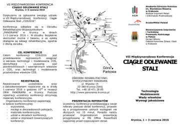 VII MIĘDZYNARODOWA KONFERENCJA CIĄGŁE ODLEWANIE STALI Akademia Górniczo-Hutnicza im. Stanisława Staszica w Krakowie Wydział Inżynierii Metali i Informatyki Przemysłowej Krynica, 1÷3 czerwca 2016 Dziękujemy za zgłoszenie swojego udziału w VII Międzynarodowej Konferencji Ciągłe Odlewanie Stali „COS2016”. ArcelorMittal Poland Konferencja odbędzie się w Ośrodku Rehabilitacyjno-Wypoczynkowym „PANORAMA” w Krynicy w dniach 1÷3 czerwca 2016 r. W ośrodku bezpłatnie skorzystać można z basenu, a za opłatą dostępne są zabiegi rehabilitacyjne, zgodnie z ofertą ośrodka. Stowarzyszenie Inżynierów i Techników Przemysłu Hutniczego w Polsce Zarząd Główny Oddział Hutnictwa Żelaza i Stali w Krakowie CEL KONFERENCJI Celem konferencji COS2016 jest przedstawienie najnowszych osiągnięć w zakresie technologii i modelowania COS, identyfikacji i usuwania wad powierzchniowych i wewnętrznych wlewków z COS, oraz technologii i modelowania przetwórstwa wlewków COS. REJESTRACJA Rejestrowanie uczestników wraz z zakwaterowaniem rozpocznie się w środę 1 czerwca 2016 o godzinie 1000 w recepcji ORW PANORAMA w Krynicy. Podczas rejestracji uczestnicy konferencji otrzymają materiały konferencyjne. Organizatorzy konferencji zapewniają w opłacie konferencyjnej: - wyżywienie, - noclegi w dwuosobowych pokojach, - materiały konferencyjne, - udział w obradach konferencji, - udział w imprezach towarzyszących konferencji. VII Międzynarodowa Konferencja CIĄGŁE ODLEWANIE STALI OŚRODEK REHABILITACYJNOWYPOCZYNKOWY PANORAMA ul. Wysoka 15 33-380 Krynica Zdrój Tel. +48 18 471 28 85 http://www.panorama.krynica.pl PREZENTACJA REFERATÓW Uczestnicy konferencji przedstawiający swoje referaty podczas obrad konferencji, proszeni są o przygotowanie ustnych wystąpień nie dłuższych niż 15 minut. Ponadto należy przekazać Organizatorom prezentację przygotowaną w MS Office PowerPoint najpóźniej przed rozpoczęciem obrad. Technologia Modelowanie Wady wlewków Wymogi jakościowe Krynica, 1 ÷ 3 czerwca 2016 PROGRAM KONFERENCJI COS2016 1 czerwca /środa/ 2016 r. 10:00–13:00 Rejestracja uczestników w recepcji O.R.W. „PANORAMA” 13:00 Obiad (jadalnia, parter) 14:30–18:30 Obrady (sala konferencyjna, I p.) 14:30 Otwarcie konferencji 14:45 Marcin Rywotycki Wpływ błędu pomiaru wybranych parametrów modelu na dokładność metody wyznaczenia współczynnika wymiany ciepła przy kontakcie rolek z pasmem COS 15:00 Oliver Hofmann, Krzysztof Warzecha, Jochen Wans, Martin Klein Innowacyjne produkty i koncepcje dla wlewków wysokiej jakości 15:15 Artur M. Hutny, Marek Warzecha, Włodzimierz Derda, Paweł Wieczorek Segregacja pierwiastków w stalach węglowych we wlewkach ciągłych przeznaczonych na wyroby długie 15:30 Gniewko Kwinta, Stefan Kara, Barabara Kalandyk, Renata Zapała, Paweł Pałka Analiza mikrostruktury w narożach kęsisk płaskich stali niskowęglowej otrzymywanej metodą ciągłego odlewania 15:45 Marcin Kwiecień, Paulina Graca, Krzysztof Muszka, Janusz Majta Wybrane problemy w rozwoju mikrostruktury w procesie wytwarzania walcówki ze stali mikrostopowej do dalszego przerobu na zimno 16:00 Adam Cwudziński, Jan Jowsa, Piotr Przegrałek Interakcja ciekłej stali z zasypką żużlową w krystalizatorze do odlewania wlewków prostokątnych symulacje numeryczne i doświadczenia przemysłowe 16:15–16:45 Przerwa kawowa 16:45 Andreas Eichinger, Gerald Hrazdera Wyższa jakość przy niższych kosztach – ciągłe odlewanie produktów długich jako odpowiedź na potrzeby rynku 17:00 Andrzej Gołdasz, Zbigniew Malinowski Identyfikacja strumienia ciepła na powierzchni wsadu nagrzewanego w piecu komorowym 17:15 Paweł Krajewski, Sebastian Michelic Nowe technologie w procesie ciągłego odlewania stali 17:30 Tomasz Kargul Badania temperatury i entalpii przemian fazowych niskostopowej stali zbrojeniowej B500SP www.cos.agh.edu.pl 17:45 Jan Jowsa, Marcin Bielnicki, Adam Cwudziński Fizyczne i numeryczne badania modelowe porywania żużla krystalizatorowego do ciekłej stali 12:30 Katja Vrbek, Jakob Lamut, Matjaž Knap Wpływ parametrów odlewania na jakość kęsów 12:45 Jacek Pieprzyca, Piotr Warzecha, Tomasz Merder, 18:00 Beata Hadała, Zbigniew Malinowski, Tadeusz Telejko Analiza temperatury, naprężeń cieplnych i kryterium pękania wlewka płaskiego wyznaczonych na podstawie lokalnego i średniego warunku brzegowych w strefach chłodzenia wtórnego 18:15–18:30 Dyskusje. Podsumowanie obrad 20:00 Uroczysta kolacja (jadalnia, parter) 2 czerwca /czwartek/ 2016 r. 8:00–10:00 Śniadanie (jadalnia, parter) 10:00–13:45 Obrady (sala konferencyjna, I p.) 10:00 Luka Krajnc, Jaka Burja, Matjaž Knap, Jožef Medved Termodynamiczne modelowanie i automatyczna analiza EDS wtrąceń niemetalicznych w stalach z dodatkiem siarki i ich wpływ na lejność 10:15 Wojciech Węgrzyn Czynniki wpływające na zawartości wolnego wodoru w stali w kadzi pośredniej maszyny COS Marek Warzecha Weryfikacja wyników symulacji numerycznych przepływu stali przez kadź pośrednią metodami doświadczalnymi 13:00 Jacek Pieprzyca, Tomasz Merder Modernizacja laboratorium badań modelowych w instytucie technologii metali Politechniki Śląskiej 13:15–13:45 Dyskusje. Podsumowanie obrad 14:00 Obiad (jadalnia, parter) 15:00–18:00 Spotkania kuluarowe 20:00 Ognisko 3 czerwca /piątek/ 2016 r. 8:00–10:00 Śniadanie (jadalnia, parter) 10:00–12:30 Obrady (sala konferencyjna, I p.) 10:00 Paweł Leszek Żak, Dorota Kalisz, Grzegorz Rączkowski Mechanizm oddziaływania cząstki niemetalicznej z frontem krystalizacji 10:30 Jan Falkus Ocena stabilności właściwości zasypki krystalizatorowej w procesie ciągłego odlewania stali 10:15 Markus Feldmann Niskonakładowe modernizacje maszyn COS dla produktów długich 10:45 Nejc Drofelnik, Jakob Lamut, Martin Debelak, Matjaž Knap Inwestycje w jakość, nowe urządzenie do ciągłego odlewania stali w Štore Steel 11:00 Dorota Kalisz, Paweł Leszek 
