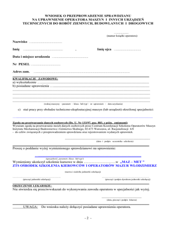 WNIOSEK O PRZEPROWADZENIE SPRAWDZIANU NA UPRAWNIENIE OPERATORA MASZYN I INNYCH URZĄDZEŃ TECHNICZNYCH DO ROBÓT ZIEMNYCH, BUDOWLANYCH I DROGOWYCH ….................. (numer książki operatora) Nazwisko Imię ….............................................. …........................................................ Data i miejsce urodzenia , Imię ojca …..................................... …................................................... Nr PESEL …......................................... Adres zam. …............................................................................................................................................. _____________________________________________________________________________ KWALIFIKACJE ZAWODOWE: a) wykształcenie ….......................................................................................................................... b) posiadane uprawnienia …............................................................................................................ ........................................................................................................................................................... ........................................................................................................................................................... ........................................................................................................................................................... ........................................................................................................................................................... (rodzaj maszyny - parametr - klasa /lub typ/ - nr uprawnień - data uzyskania) c) staż pracy przy obsłudze techniczno-eksploatacyjnej maszyn (lub urządzeń) określonej specjalności: ….......................................................................................................................................................... Zgoda na przetwarzanie danych osobowych (Dz. U. Nr 133/97, poz. 883, z późn. zmianami) Wyrażam zgodę na przetwarzanie moich danych osobowych przez Centrum Koordynacji Szkolenia Operatorów Maszyn Instytutu Mechanizacji Budownictwa i Górnictwa Skalnego, 02-673 Warszawa, ul. Racjonalizacji 6/8 - do celów związanych z przeprowadzeniem sprawdzianu oraz rejestrowaniem wydanych uprawnień. ................................................................................................ (data i podpis uczestnika szkolenia) _____________________________________________________________________________ Proszę o poddanie wyżej wymienionego sprawdzianowi na uprawnienie: ….................................................................................................................... (specjalność, parametr, klasa /lub typ/) Wymieniony ukończył szkolenie kursowe w dniu ………………………w „MAZ – MET ” ZTS OŚRODEK SZKOLENIA KIEROWCÓW I OPERATORÓW MAZUR WŁODZIMIERZ (nazwa i siedziba jednostki szkolącej) ……………………………………………………. (pieczęć jednostki szkolącej) …………………………………………………… (pieczęć i podpis dyrektora jednostki szkolącej) _____________________________________________________________________________ ORZECZENIE LEKARSKIE: Nie stwierdza się przeciwwskazań do wykonywania zawodu operatora w specjalności jak wyżej. ............................................. (data, pieczęć i podpis lekarza) _____________________________________________________________________________ UWAGA: Do wniosku należy dołączyć posiadane uprawnienia operatora. -2 - _____________________________________________________________________________ ARKUSZ OCEN wystawionych przez Komisję Egzaminacyjną Specjalność lub typ maszyny: …................................................................... Nominalny parametr ….................................................................... Klasa (lub typ) ….................................................................... _____________________________________________________________________________ Ocena ze sprawdzianu praktycznego: .................................................................................... Ocena ze sprawdzianu teoretycznego: 1 1. Budowa maszyny określonej specjalności ..................................................................... 2 2. Obsługa i eksploatacja maszyn .................................................................................... 3. Napędy: - spalinowe ................................................................................................ - hydrauliczne ................................................................................................ - elektryczne ................................................................................................ 4. Technologia robót i organizacja pracy ........................................................................ 5. Umiejętności odczytywania i posługiwania się dokumentacją ........................................................................ 6. Bezpieczeństwo i higiena pracy .................................................................................... KLASA II - dodatkowo: 7. Zasady kierowania zespołem roboczym (wybrane zagadnienia) ................................................................................................ KLASA I – dodatkowo: 8. Organizacja budowy (wybrane zagadnienia) ............................................................. 9. Prawo budowlane (wybrane zagadnienia) ......................................................................... ............................................................. (ocena ogólna) (Skala ocen: celujący, bardzo dobry, dobry, dostateczny, dopuszczający, niedostateczny). _____________________________________________________________________________ Decyzją Komisji Egzaminacyjne