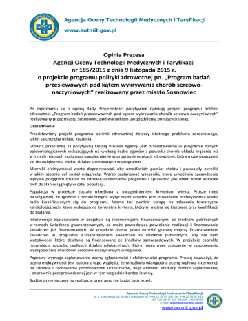 Agencja Oceny Technologii Medycznych i Taryfikacji www.aotmit.gov.pl Opinia Prezesa Agencji Oceny Technologii Medycznych i Taryfikacji nr 185/2015 z dnia 9 listopada 2015 r. o projekcie programu polityki zdrowotnej pn. „Program badań przesiewowych pod kątem wykrywania chorób sercowonaczyniowych” realizowany przez miasto Sosnowiec Po zapoznaniu się z opinią Rady Przejrzystości pozytywnie opiniuję projekt programu polityki zdrowotnej „Program badań przesiewowych pod kątem wykrywania chorób sercowo-naczyniowych” realizowany przez miasto Sosnowiec, pod warunkiem uwzględnienia poniższych uwag. Uzasadnienie Przedstawiony projekt programu polityki zdrowotnej dotyczy istotnego problemu zdrowotnego, jakim są choroby układu krążenia. Główną przesłanką za pozytywną Opinią Prezesa Agencji jest przedstawienie w programie danych epidemiologicznych wskazujących na większą liczbę zgonów z powodu chorób układu krążenia niż w innych rejonach kraju oraz uwzględnienie w programie edukacji zdrowotnej, która może przyczynić się do zwiększenia efektu działań stosowanych w programie. Mierniki efektywności warto doprecyzować, aby umożliwiały pomiar efektu i pozwalały określić w jakim stopniu cel został osiągnięty. Warto zaplanować wskaźniki, które umożliwią sprawdzenie wpływu podjętych działań na zdrowie uczestników programu i sprawdzić jaki efekt został wskutek tych działań osiągnięty w całej populacji. Populacja w projekcie została określona z uwzględnieniem kryterium wieku. Proszę mieć na względzie, że zgodnie z odnalezionymi wytycznymi zasadne jest rozważenie podwyższenia wieku osób kwalifikujących się do programu. Warto też zwrócić uwagę na zalecenia towarzystw kardiologicznych, które wskazują na konkretne kryteria, którymi można się kierować przy kwalifikacji do badania. Interwencje zaplanowane w projekcie są interwencjami finansowanymi ze środków publicznych w ramach świadczeń gwarantowanych, co może powodować powielanie realizacji i finansowania świadczeń już finansowanych. W projekcie proszę jasno określić granicę między finansowaniem świadczeń w programie a finansowaniem świadczeń ze środków publicznych, aby nie było wątpliwości, które działania są finansowane ze środków samorządowych. W projekcie zabrakło rozwinięcia sposobu realizacji działań edukacyjnych, które mogą mieć znaczenie w zapobieganiu występowania chorobom sercowo-naczyniowym w regionie. Poprawy wymaga zaplanowanie oceny zgłaszalności i efektywności programu. Proszę zauważyć, że ocena efektywności jest istotna z tego względu, że umożliwia wiarygodną ocenę wpływu interwencji na zdrowie i zachowania prozdrowotne uczestników, więc element edukacji dobrze zaplanowanej i poprawnie przeprowadzonej jest w tym względzie bardzo istotny. Budżet przeznaczony na realizację programu nie budzi zastrzeżeń. Agencja Oceny Technologii Medycznych i Taryfikacji ul. I. Krasickiego 26, 02-611 Warszawa tel. +48 22 56 67 200 fax +48 22 56 67 202 NIP 525-23-47-183 REGON 140278400 e-mail: [email protected] www.aotmit.gov.pl Opinia Prezesa AOTMiT nr 185/2015 z dnia 9 listopada 2015 r. Przedmiot opinii Przedmiotem opinii jest projekt programu polityki zdrowotnej dotyczący wykrywania chorób układu sercowo-naczyniowego. Program realizowany będzie w latach 2015-2018, zaś budżet przeznaczony na jego realizację wynosi 541 000zł. Ocena projektu programu polityki zdrowotnej Znaczenie problemu zdrowotnego Przedstawiony projekt programu porusza istotny problem zdrowotny, jakim są choroby układu krążenia. Problem zdrowotny został opisany w sposób dokładny. Planowane działania z zakresu badań profilaktycznych, edukacji prozdrowotnej oraz prewencji wtórnej chorób sercowonaczyniowych są zgodne z celem strategicznym nr 1 Narodowego Programu Zdrowia na lata 20072015 (NPZ 2007-2015), tj. zmniejszeniem zachorowalności i przedwczesnej umieralności z powodu chorób naczyniowo-sercowych, w tym udarów mózgu. Program może stanowić uzupełnienie Programu Profilaktyki Chorób Układu Krążenia finansowanego ze środków Narodowego Funduszu Zdrowia. Głównym celem tego programu jest obniżenie o ok. 20% zachorowalności i umieralności z powodu chorób układu krążenia populacji objętej programem poprzez wczesne wykrywanie i redukcję występowania natężenia czynników ryzyka. Analizując lokalne dane epidemiologiczne można stwierdzić, że liczba zgonów z powodu chorób układu krążenia w Sosnowcu jest większa niż w analogicznej grupie osób w województwie śląskim i w Polsce. Dodatkowo na podstawie danych opisanych w projekcie można zaobserwować, że na przestrzeni ostatnich lat na terenie miasta Sosnowiec liczba stwierdzonych schorzeń układu krążenia wzrostła i przewyższa wskaźniki dla całego województwa śląskiego. Cele i efekty programu Głównym celem programu jest zwiększenie dostępności do wysokospecjalistycznych badań kardiologicznych. Dodatkowo wskazano 9 celów szczegółowych, które stanowią uzupełnienie celu głównego. Oczekiwanym efektem programu jest zwiększenie liczby wykonywanych świadczeń z zakresu kardiologii. Efekt ten pozostaje w spójności z postawionymi celami. W projekcie określono mierniki efektywności, którymi są: odsetek osób uczestniczących w programie; liczba osób przebadanych w programie; liczba wykonanych badań USG tętnic szyjnych oraz badań USG-Doppler kończyn dolnych poza programem, liczba podjętych interwencji polegających na kontynuacji leczenia w przypadku osób, u których stwierdzono zaburzenia kardiologiczne na podstawie przeprowadzonych badań w ramach programu. Proszę mieć na uwadze, że mierniki efektywności warto zaplanować z zachowaniem spójności z określonymi oczekiwanymi efektami i celami. W tym przypadku warto odwołać się do liczby osób w populacji z chorobami sercowo-naczyniowymi przed i po realizacji 
