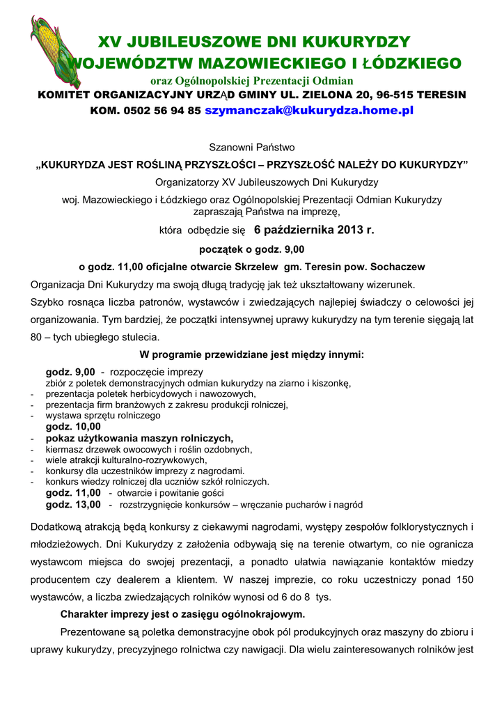 XV JUBILEUSZOWE DNI KUKURYDZY WOJEWÓDZTW MAZOWIECKIEGO I ŁÓDZKIEGO oraz Ogólnopolskiej Prezentacji Odmian KOMITET ORGANIZACYJNY URZĄD GMINY UL. ZIELONA 20, 96-515 TERESIN KOM. 0502 56 94 85 [email protected] Szanowni Państwo „KUKURYDZA JEST ROŚLINĄ PRZYSZŁOŚCI – PRZYSZŁOŚĆ NALEŻY DO KUKURYDZY” Organizatorzy XV Jubileuszowych Dni Kukurydzy woj. Mazowieckiego i Łódzkiego oraz Ogólnopolskiej Prezentacji Odmian Kukurydzy zapraszają Państwa na imprezę, która odbędzie się 6 października 2013 r. początek o godz. 9,00 o godz. 11,00 oficjalne otwarcie Skrzelew gm. Teresin pow. Sochaczew Organizacja Dni Kukurydzy ma swoją długą tradycję jak też ukształtowany wizerunek. Szybko rosnąca liczba patronów, wystawców i zwiedzających najlepiej świadczy o celowości jej organizowania. Tym bardziej, że początki intensywnej uprawy kukurydzy na tym terenie sięgają lat 80 – tych ubiegłego stulecia. W programie przewidziane jest między innymi: godz. 9,00 - rozpoczęcie imprezy - zbiór z poletek demonstracyjnych odmian kukurydzy na ziarno i kiszonkę, prezentacja poletek herbicydowych i nawozowych, prezentacja firm branżowych z zakresu produkcji rolniczej, wystawa sprzętu rolniczego - godz. 10,00 pokaz użytkowania maszyn rolniczych, - kiermasz drzewek owocowych i roślin ozdobnych, wiele atrakcji kulturalno-rozrywkowych, konkursy dla uczestników imprezy z nagrodami. konkurs wiedzy rolniczej dla uczniów szkół rolniczych. godz. 11,00 - otwarcie i powitanie gości godz. 13,00 - rozstrzygnięcie konkursów – wręczanie pucharów i nagród Dodatkową atrakcją będą konkursy z ciekawymi nagrodami, występy zespołów folklorystycznych i młodzieżowych. Dni Kukurydzy z założenia odbywają się na terenie otwartym, co nie ogranicza wystawcom miejsca do swojej prezentacji, a ponadto ułatwia nawiązanie kontaktów miedzy producentem czy dealerem a klientem. W naszej imprezie, co roku uczestniczy ponad 150 wystawców, a liczba zwiedzających rolników wynosi od 6 do 8 tys. Charakter imprezy jest o zasięgu ogólnokrajowym. Prezentowane są poletka demonstracyjne obok pól produkcyjnych oraz maszyny do zbioru i uprawy kukurydzy, precyzyjnego rolnictwa czy nawigacji. Dla wielu zainteresowanych rolników jest to wyjątkowa okazja do porównania upraw różnych odmian, a jest ich prawie 100. Porównania jakości pracy poszczególnych maszyn, czy różnych procesów technologicznych. Będzie, więc możliwość nie tylko do zapoznania się z najnowocześniejszymi rozwiązaniami, ale też do wymiany informacji pomiędzy uczestnikami. Zdobyta wiedza zaowocuje z pewnością nowymi technologiami i praktycznym ich wykorzystaniem w gospodarstwach rolnych. Zaproszeni zostali jak zawsze wspaniali goście między innymi Ambasador Ambasady Meksyku, Argentyny, USA, Patronat na imprezą objęli Minister Rolnictwa, Agencje z otoczenia rolnictwa, Marszałkowie, Wojewodowie i Starostowie. W skład komitetu organizacyjnego wchodzi wiele znaczących instytucji pracujących na rzecz rolnictwa. Na tę okoliczność wydana będzie również gazeta okolicznościowa, w której znajdą się informacje na temat firm wystawienniczych jak i kukurydzy, która - jest w tym dniu najważniejsza. Mamy również stronę www.kukurydza.home.pl Jeszcze raz serdecznie państwa zapraszamy na XV Jubileuszowe Dni Kukurydzy – Skrzelew 2013 6 października 2013 r. Skrzelew gm. Teresin pow. Sochaczew. Przewodniczący Komitetu Organizacyjnego XV Jubileuszowych Dni Kukurydzy Tadeusz Szymańczak