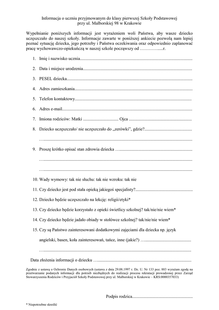 Informacja o uczniu przyjmowanym do klasy pierwszej Szkoły Podstawowej przy ul. Malborskiej 98 w Krakowie Wypełnianie poniższych informacji jest wyrażeniem woli Państwa, aby wasze dziecko uczęszczało do naszej szkoły. Informacje zawarte w poniższej ankiecie pozwolą nam lepiej poznać sytuację dziecka, jego potrzeby i Państwa oczekiwania oraz odpowiednio zaplanować pracę wychowawczo-opiekuńczą w naszej szkole począwszy od ………….....r. 1. Imię i nazwisko ucznia...................................................................................................... 2. Data i miejsce urodzenia................................................................................................... 3. PESEL dziecka.................................................................................................................. 4. Adres zamieszkania........................................................................................................... 5. Telefon kontaktowy.......................................................................................................... 6. Adres e-mail...................................................................................................................... 7. Imiona rodziców: Matki ................................ Ojca ......................................................... 8. Dziecko uczęszczało/ nie uczęszczało do „zerówki”, gdzie?........................................... …....................................................................................................................................... 9. Proszę krótko opisać stan zdrowia dziecka ….................................................................. …....................................................................................................................................... …....................................................................................................................................... 10. Wady wymowy: tak nie słuchu: tak nie wzroku: tak nie 11. Czy dziecko jest pod stała opieką jakiegoś specjalisty?.................................................... 12. Dziecko będzie uczęszczało na lekcję: religii/etyki* 13. Czy dziecko będzie korzystało z opieki świetlicy szkolnej? tak/nie/nie wiem* 14. Czy dziecko będzie jadało obiady w stołówce szkolnej? tak/nie/nie wiem* 15. Czy są Państwo zainteresowani dodatkowymi zajęciami dla dziecka np. język angielski, basen, koła zainteresowań, tańce, inne (jakie?) ….......................................... …...................................................................................................................................... Data złożenia informacji o dziecku …..................................................................................... Zgodnie z ustawą o Ochronie Danych osobowych (ustawa z dnia 29.08.1997 r. Dz. U. Nr 133 poz. 883 wyrażam zgodę na przetwarzanie podanych informacji dla potrzeb niezbędnych do realizacji procesu rekrutacji prowadzonej przez Zarząd Stowarzyszenia Rodziców i Przyjaciół Szkoły Podstawowej przy ul. Malborskiej w Krakowie – KRS:0000357033) Podpis rodzica....................................................... * Niepotrzebne skreślić