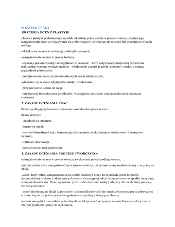 PLASTYKA SP 340 KRYTERIA OCEN Z PLASTYKI Ocena z plastyki podsumowuje wysiłek wkładany przez ucznia w proces twórczy, stopień jego zaangażowania oraz wywiązywanie się z obowiązków wynikających ze specyfiki przedmiotu. Ocenie podlega: -wkład pracy ucznia w realizację zadań plastycznych, -zaangażowanie ucznia w proces twórczy, -uzyskany poziom wiedzy i umiejętności w zakresie: - form aktywności plastycznej (ćwiczenia praktyczne, warsztat twórczy ucznia) - wiadomości z teorii plastyki (elementy wiedzy o sztuce, zagadnienia plastyczne). -podejmowanie przez ucznia dodatkowych zadań plastycznych, -włączanie się w życie artystyczne szkoły i środowiska, -przygotowanie ucznia do zajęć -umiejętność formułowania problemów, wyciągania wniosków oraz poszukiwania własnych rozwiązań. 2. ZASADY OCENIANIA PRAC: Ocenie podlegają tylko prace wykonane samodzielnie przez ucznia. Ocena dotyczy: - zgodności z tematem, - bogactwa treści, - wartości formalnych (np.: kompozycja, kolorystyka, wykorzystanie właściwości 1 tworzywa, techniki), - trafności obserwacji, - pomysłowości (oryginalności). 3. ZASADY OCENIANIA PROCESU TWÓRCZEGO: -zaangażowanie ucznia w proces twórczy (wykonanie pracy) podlega ocenie, -jeśli uczeń nie chce zaangażować się w proces twórczy, otrzymuje ocenę niedostateczną – za pracę na lekcji, -uczeń, który mimo zaangażowania nie zdołał skończyć pracy na zajęciach, może to zrobić (samodzielnie) w domu i oddać pracę do oceny na następnej lekcji, w przeciwnym wypadku otrzymuje ocenę niedostateczną. Prace wykonane przez rodziców (inne osoby) lub przy ich ewidentnej pomocy, nie będą oceniane. -uczeń nieobecny na lekcji (z powodów usprawiedliwionych) nie musi wykonywać pracy plastycznej w domu chyba, że jest to praca dwugodzinna i na jednej z lekcji jest obecny, -za brak narzędzi i materiałów potrzebnych do lekcji uczeń otrzymuje minusa Nauczyciel wyznacza mu inną (podobną) pracę do wykonania, -uczeń w ciągu semestru może otrzymać trzy minusy za nieprzygotowanie lub brak pracy na lekcji, każdy kolejny minus zamieniany jest na ocenę niedostateczną. -za nieodrobioną pracę domową uczeń otrzymuje ocenę niedostateczną. Uczeń ma prawo poprawić tę ocenę przynosząc na najbliższą lekcję uzupełnioną pracę domową . 4. SZCZEGÓŁOWE KRYTERIA OCEN: Ocena celująca (6) -aktywny, kreatywny udział w procesie twórczym, - kompletne, estetyczne zgodne z tematem i określonymi zagadnieniami plastycznymi wykonywanie prac, ćwiczeń, - pełne przyswojenie wiadomości objętych programem, a także wykraczających poza program, - poszerzanie własnej wiedzy - samodzielne korzystanie z różnych źródeł, zaangażowanie w dyskusje, trafność interpretacji percepowanych obiektów plastycznych, - uczestnictwo w konkursach plastycznych, - prawidłowa organizacja pracy, - kreatywność w wykorzystywaniu zdobytych wiadomości i umiejętności, -wykonywanie prac dodatkowych (elementy dekoracji, prac okolicznościowych, plakatów itp.) -terminowe oddawanie prac, - systematyczne przygotowanie do zajęć (materiały, narzędzia, wiedza teoretyczna). Ocena bardzo dobra (5) - chętny udział w procesie twórczym, - estetyczne wykonywanie prac, ćwiczeń, - pełne przyswojenie wiadomości objętych programem, - prawidłowa organizacja pracy, -wykorzystanie wiadomości i umiejętności w nietypowych zadaniach, - wykonywanie prac dodatkowych (dekoracje okolicznościowe, plakaty itp.), - terminowe oddawanie prac, - przygotowanie do zajęć(materiały, narzędzia). Ocena dobra (4) - gotowość do czynnego udziału w procesie twórczym, - zabieranie głosu w dyskusjach na temat dzieł plastycznych, - przyswojenie wiedzy objętej programem na poziomie wiadomości i umiejętności dotyczących zadań typowych, - staranne i estetyczne wykonywanie prac i ćwiczeń objętych programem - po zachęcie nauczyciela. Ocena dostateczna (3) - udział w procesie twórczym tylko pod kierunkiem nauczyciela, -połowiczne opanowanie materiału objętego programem, - trudności w określeniu szczegółów dotyczących wykonania pracy, - trudności z zastosowaniem wiedzy teoretycznej podczas wykonywania pracy, - nie włączanie się do dyskusji bez zachęty nauczyciela, - prace niestaranne i nieestetyczne. Ocena dopuszczająca (2) - brak chęci do zaangażowania się w proces twórczy, -nieopanowanie wiadomości i umiejętności sprecyzowanych w minimum programowym, - zgodne z tematem ale niestaranne wykonywanie prac, - bardzo częste nieprzygotowanie do lekcji (brak niezbędnych materiałów, narzędzi, zeszytu). Ocena niedostateczna (1) - nie angażowanie się w proces twórczy - niechęć do pracy, - niemożliwe do uzupełnienia luki w wiadomościach objętych programem, -notoryczne nieprzygotowanie do zajęć, - bardzo nieestetyczne wykonywanie prac.