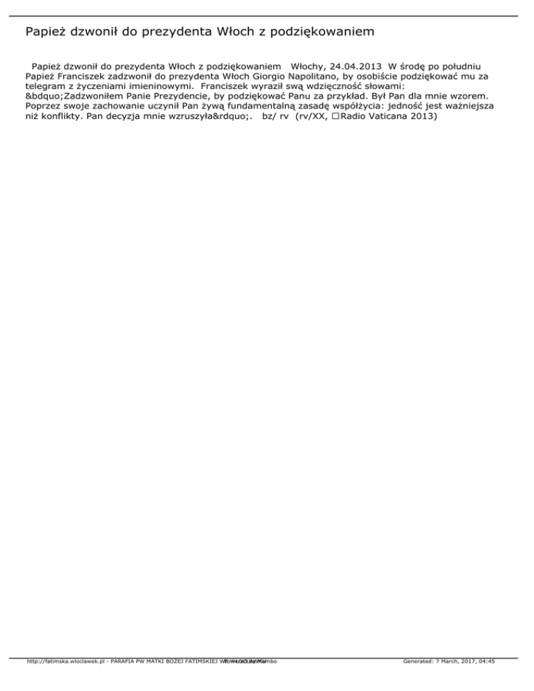 Papież dzwonił do prezydenta Włoch z podziękowaniem Papież dzwonił do prezydenta Włoch z podziękowaniem Włochy, 24.04.2013 W środę po południu Papież Franciszek zadzwonił do prezydenta Włoch Giorgio Napolitano, by osobiście podziękować mu za telegram z życzeniami imieninowymi. Franciszek wyraził swą wdzięczność słowami: „Zadzwoniłem Panie Prezydencie, by podziękować Panu za przykład. Był Pan dla mnie wzorem. Poprzez swoje zachowanie uczynił Pan żywą fundamentalną zasadę współżycia: jedność jest ważniejsza niż konflikty. Pan decyzja mnie wzruszyła”. bz/ rv (rv/XX, © Radio Vaticana 2013) http://fatimska.wloclawek.pl - PARAFIA PW MATKI BOŻEJ FATIMSKIEJ WE Powered WŁOCŁAWKU by Mambo Generated: 7 March, 2017, 04:45