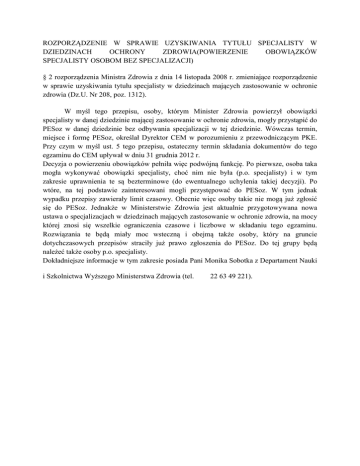 ROZPORZĄDZENIE W SPRAWIE UZYSKIWANIA TYTUŁU SPECJALISTY W DZIEDZINACH OCHRONY ZDROWIA(POWIERZENIE OBOWIĄZKÓW SPECJALISTY OSOBOM BEZ SPECJALIZACJI) § 2 rozporządzenia Ministra Zdrowia z dnia 14 listopada 2008 r. zmieniające rozporządzenie w sprawie uzyskiwania tytułu specjalisty w dziedzinach mających zastosowanie w ochronie zdrowia (Dz.U. Nr 208, poz. 1312). W myśl tego przepisu, osoby, którym Minister Zdrowia powierzył obowiązki specjalisty w danej dziedzinie mającej zastosowanie w ochronie zdrowia, mogły przystąpić do PESoz w danej dziedzinie bez odbywania specjalizacji w tej dziedzinie. Wówczas termin, miejsce i formę PESoz, określał Dyrektor CEM w porozumieniu z przewodniczącym PKE. Przy czym w myśl ust. 5 tego przepisu, ostateczny termin składania dokumentów do tego egzaminu do CEM upływał w dniu 31 grudnia 2012 r. Decyzja o powierzeniu obowiązków pełniła więc podwójną funkcję. Po pierwsze, osoba taka mogła wykonywać obowiązki specjalisty, choć nim nie była (p.o. specjalisty) i w tym zakresie uprawnienia te są bezterminowe (do ewentualnego uchylenia takiej decyzji). Po wtóre, na tej podstawie zainteresowani mogli przystępować do PESoz. W tym jednak wypadku przepisy zawierały limit czasowy. Obecnie więc osoby takie nie mogą już zgłosić się do PESoz. Jednakże w Ministerstwie Zdrowia jest aktualnie przygotowywana nowa ustawa o specjalizacjach w dziedzinach mających zastosowanie w ochronie zdrowia, na mocy której znosi się wszelkie ograniczenia czasowe i liczbowe w składaniu tego egzaminu. Rozwiązania te będą miały moc wsteczną i obejmą także osoby, który na gruncie dotychczasowych przepisów straciły już prawo zgłoszenia do PESoz. Do tej grupy będą należeć także osoby p.o. specjalisty. Dokładniejsze informacje w tym zakresie posiada Pani Monika Sobotka z Departament Nauki i Szkolnictwa Wyższego Ministerstwa Zdrowia (tel. 22 63 49 221).