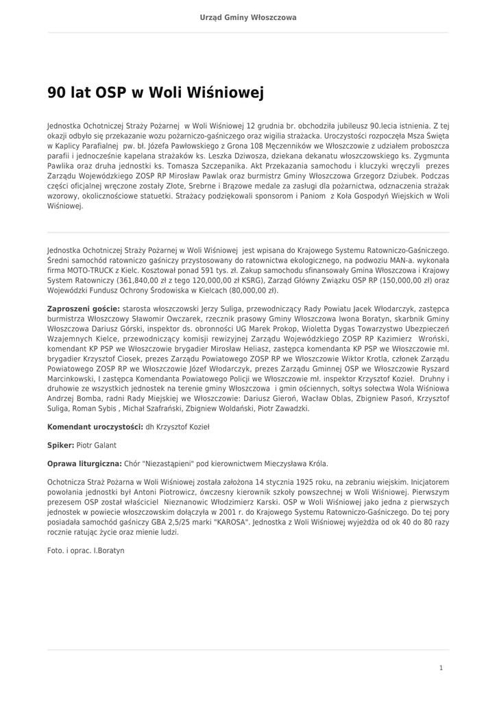 Urząd Gminy Włoszczowa 90 lat OSP w Woli Wiśniowej Jednostka Ochotniczej Straży Pożarnej w Woli Wiśniowej 12 grudnia br. obchodziła jubileusz 90.lecia istnienia. Z tej okazji odbyło się przekazanie wozu pożarniczo-gaśniczego oraz wigilia strażacka. Uroczystości rozpoczęła Msza Święta w Kaplicy Parafialnej pw. bł. Józefa Pawłowskiego z Grona 108 Męczenników we Włoszczowie z udziałem proboszcza parafii i jednocześnie kapelana strażaków ks. Leszka Dziwosza, dziekana dekanatu włoszczowskiego ks. Zygmunta Pawlika oraz druha jednostki ks. Tomasza Szczepanika. Akt Przekazania samochodu i kluczyki wręczyli prezes Zarządu Wojewódzkiego ZOSP RP Mirosław Pawlak oraz burmistrz Gminy Włoszczowa Grzegorz Dziubek. Podczas części oficjalnej wręczone zostały Złote, Srebrne i Brązowe medale za zasługi dla pożarnictwa, odznaczenia strażak wzorowy, okolicznościowe statuetki. Strażacy podziękowali sponsorom i Paniom z Koła Gospodyń Wiejskich w Woli Wiśniowej. Jednostka Ochotniczej Straży Pożarnej w Woli Wiśniowej jest wpisana do Krajowego Systemu Ratowniczo-Gaśniczego. Średni samochód ratowniczo gaśniczy przystosowany do ratownictwa ekologicznego, na podwoziu MAN-a. wykonała firma MOTO-TRUCK z Kielc. Kosztował ponad 591 tys. zł. Zakup samochodu sfinansowały Gmina Włoszczowa i Krajowy System Ratowniczy (361,840,00 zł z tego 120,000,00 zł KSRG), Zarząd Główny Związku OSP RP (150,000,00 zł) oraz Wojewódzki Fundusz Ochrony Środowiska w Kielcach (80,000,00 zł). Zaproszeni goście: starosta włoszczowski Jerzy Suliga, przewodniczący Rady Powiatu Jacek Włodarczyk, zastępca burmistrza Włoszczowy Sławomir Owczarek, rzecznik prasowy Gminy Włoszczowa Iwona Boratyn, skarbnik Gminy Włoszczowa Dariusz Górski, inspektor ds. obronności UG Marek Prokop, Wioletta Dygas Towarzystwo Ubezpieczeń Wzajemnych Kielce, przewodniczący komisji rewizyjnej Zarządu Wojewódzkiego ZOSP RP Kazimierz Wroński, komendant KP PSP we Włoszczowie brygadier Mirosław Heliasz, zastępca komendanta KP PSP we Włoszczowie mł. brygadier Krzysztof Ciosek, prezes Zarządu Powiatowego ZOSP RP we Włoszczowie Wiktor Krotla, członek Zarządu Powiatowego ZOSP RP we Włoszczowie Józef Włodarczyk, prezes Zarządu Gminnej OSP we Włoszczowie Ryszard Marcinkowski, I zastępca Komendanta Powiatowego Policji we Włoszczowie mł. inspektor Krzysztof Kozieł. Druhny i druhowie ze wszystkich jednostek na terenie gminy Włoszczowa i gmin ościennych, sołtys sołectwa Wola Wiśniowa Andrzej Bomba, radni Rady Miejskiej we Włoszczowie: Dariusz Gieroń, Wacław Oblas, Zbigniew Pasoń, Krzysztof Suliga, Roman Sybis , Michał Szafrański, Zbigniew Woldański, Piotr Zawadzki. Komendant uroczystości: dh Krzysztof Kozieł Spiker: Piotr Galant Oprawa liturgiczna: Chór "Niezastąpieni" pod kierownictwem Mieczysława Króla. Ochotnicza Straż Pożarna w Woli Wiśniowej została założona 14 stycznia 1925 roku, na zebraniu wiejskim. Inicjatorem powołania jednostki był Antoni Piotrowicz, ówczesny kierownik szkoły powszechnej w Woli Wiśniowej. Pierwszym prezesem OSP został właściciel Nieznanowic Włodzimierz Karski. OSP w Woli Wiśniowej jako jedna z pierwszych jednostek w powiecie włoszczowskim dołączyła w 2001 r. do Krajowego Systemu Ratowniczo-Gaśniczego. Do tej pory posiadała samochód gaśniczy GBA 2,5/25 marki "KAROSA". Jednostka z Woli Wiśniowej wyjeżdża od ok 40 do 80 razy rocznie ratując życie oraz mienie ludzi. Foto. i oprac. I.Boratyn 1