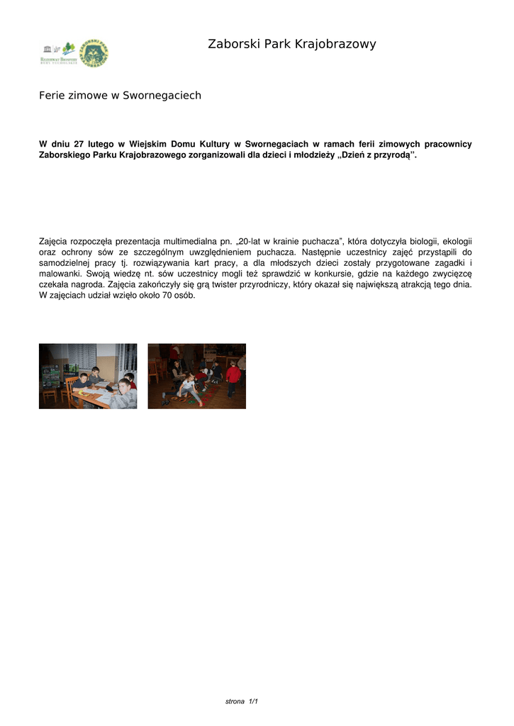 Zaborski Park Krajobrazowy Ferie zimowe w Swornegaciech W dniu 27 lutego w Wiejskim Domu Kultury w Swornegaciach w ramach ferii zimowych pracownicy Zaborskiego Parku Krajobrazowego zorganizowali dla dzieci i młodzieży „Dzień z przyrodą”. Zajęcia rozpoczęła prezentacja multimedialna pn. „20-lat w krainie puchacza”, która dotyczyła biologii, ekologii oraz ochrony sów ze szczególnym uwzględnieniem puchacza. Następnie uczestnicy zajęć przystąpili do samodzielnej pracy tj. rozwiązywania kart pracy, a dla młodszych dzieci zostały przygotowane zagadki i malowanki. Swoją wiedzę nt. sów uczestnicy mogli też sprawdzić w konkursie, gdzie na każdego zwycięzcę czekała nagroda. Zajęcia zakończyły się grą twister przyrodniczy, który okazał się największą atrakcją tego dnia. W zajęciach udział wzięło około 70 osób. strona 1/1 Powered by TCPDF (www.tcpdf.org)