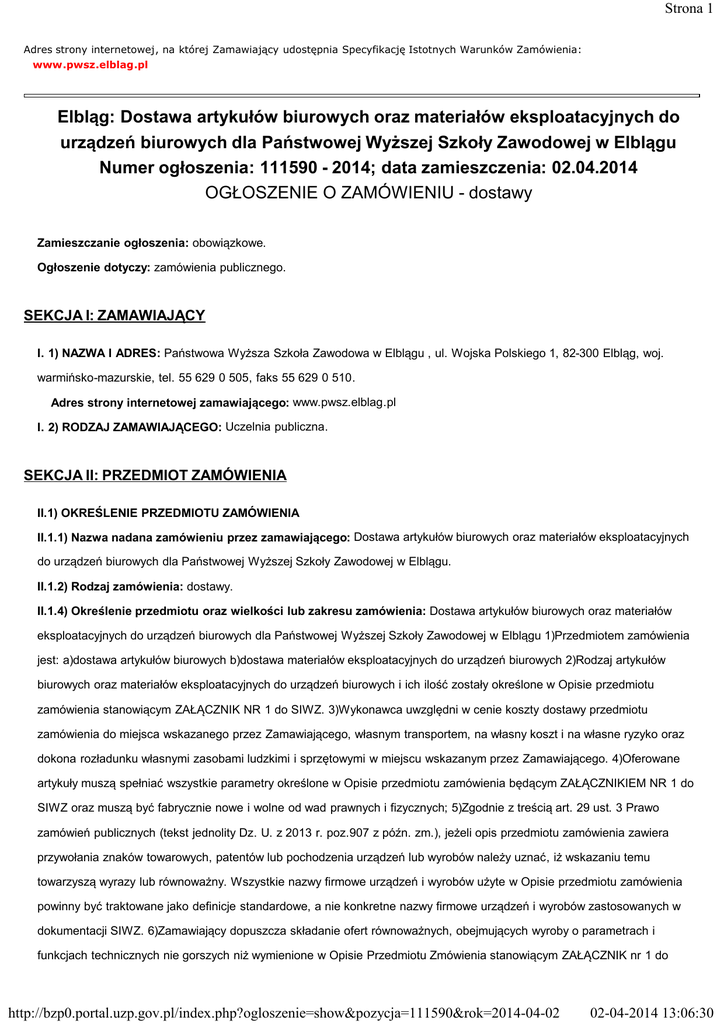 Strona 1 Adres strony internetowej, na której Zamawiający udostępnia Specyfikację Istotnych Warunków Zamówienia: www.pwsz.elblag.pl Elbląg: Dostawa artykułów biurowych oraz materiałów eksploatacyjnych do urządzeń biurowych dla Państwowej Wyższej Szkoły Zawodowej w Elblągu Numer ogłoszenia: 111590 - 2014; data zamieszczenia: 02.04.2014 OGŁOSZENIE O ZAMÓWIENIU - dostawy Zamieszczanie ogłoszenia: obowiązkowe. Ogłoszenie dotyczy: zamówienia publicznego. SEKCJA I: ZAMAWIAJĄCY I. 1) NAZWA I ADRES: Państwowa Wyższa Szkoła Zawodowa w Elblągu , ul. Wojska Polskiego 1, 82-300 Elbląg, woj. warmińsko-mazurskie, tel. 55 629 0 505, faks 55 629 0 510. Adres strony internetowej zamawiającego: www.pwsz.elblag.pl I. 2) RODZAJ ZAMAWIAJĄCEGO: Uczelnia publiczna. SEKCJA II: PRZEDMIOT ZAMÓWIENIA II.1) OKREŚLENIE PRZEDMIOTU ZAMÓWIENIA II.1.1) Nazwa nadana zamówieniu przez zamawiającego: Dostawa artykułów biurowych oraz materiałów eksploatacyjnych do urządzeń biurowych dla Państwowej Wyższej Szkoły Zawodowej w Elblągu. II.1.2) Rodzaj zamówienia: dostawy. II.1.4) Określenie przedmiotu oraz wielkości lub zakresu zamówienia: Dostawa artykułów biurowych oraz materiałów eksploatacyjnych do urządzeń biurowych dla Państwowej Wyższej Szkoły Zawodowej w Elblągu 1)Przedmiotem zamówienia jest: a)dostawa artykułów biurowych b)dostawa materiałów eksploatacyjnych do urządzeń biurowych 2)Rodzaj artykułów biurowych oraz materiałów eksploatacyjnych do urządzeń biurowych i ich ilość zostały określone w Opisie przedmiotu zamówienia stanowiącym ZAŁĄCZNIK NR 1 do SIWZ. 3)Wykonawca uwzględni w cenie koszty dostawy przedmiotu zamówienia do miejsca wskazanego przez Zamawiającego, własnym transportem, na własny koszt i na własne ryzyko oraz dokona rozładunku własnymi zasobami ludzkimi i sprzętowymi w miejscu wskazanym przez Zamawiającego. 4)Oferowane artykuły muszą spełniać wszystkie parametry określone w Opisie przedmiotu zamówienia będącym ZAŁĄCZNIKIEM NR 1 do SIWZ oraz muszą być fabrycznie nowe i wolne od wad prawnych i fizycznych; 5)Zgodnie z treścią art. 29 ust. 3 Prawo zamówień publicznych (tekst jednolity Dz. U. z 2013 r. poz.907 z późn. zm.), jeżeli opis przedmiotu zamówienia zawiera przywołania znaków towarowych, patentów lub pochodzenia urządzeń lub wyrobów należy uznać, iż wskazaniu temu towarzyszą wyrazy lub równoważny. Wszystkie nazwy firmowe urządzeń i wyrobów użyte w Opisie przedmiotu zamówienia powinny być traktowane jako definicje standardowe, a nie konkretne nazwy firmowe urządzeń i wyrobów zastosowanych w dokumentacji SIWZ. 6)Zamawiający dopuszcza składanie ofert równoważnych, obejmujących wyroby o parametrach i funkcjach technicznych nie gorszych niż wymienione w Opisie Przedmiotu Zmówienia stanowiącym ZAŁĄCZNIK nr 1 do http://bzp0.portal.uzp.gov.pl/index.php?ogloszenie=show&pozycja=111590&rok=2014-04-02 02-04-2014 13:06:30 Strona 2 SIWZ, których zastosowanie prowadzić będzie do zakładanego efektu. Zgodnie z art. 30 ust 5 ustawy z dnia 29 stycznia 2004r. Prawo zamówień publicznych, Wykonawca powołujący się na rozwiązania równoważne jest zobowiązany wykazać, że oferowane dostawy spełniają wymagania określone przez Zamawiającego. Parametry równoważności zostały określone w Opisie Przedmiotu Zmówienia. II.1.6) Wspólny Słownik Zamówień (CPV): 30.10.00.00-0, 30.19.00.00-7, 30.12.51.00-2, 30.23.40.00-8, 22.80.00.00-8. II.1.7) Czy dopuszcza się złożenie oferty częściowej: tak, liczba części: 2. II.1.8) Czy dopuszcza się złożenie oferty wariantowej: nie. II.2) CZAS TRWANIA ZAMÓWIENIA LUB TERMIN WYKONANIA: Okres w dniach: 14. SEKCJA III: INFORMACJE O CHARAKTERZE PRAWNYM, EKONOMICZNYM, FINANSOWYM I TECHNICZNYM III.2) ZALICZKI III.4) INFORMACJA O OŚWIADCZENIACH LUB DOKUMENTACH, JAKIE MAJĄ DOSTARCZYĆ WYKONAWCY W CELU POTWIERDZENIA SPEŁNIANIA WARUNKÓW UDZIAŁU W POSTĘPOWANIU ORAZ NIEPODLEGANIA WYKLUCZENIU NA PODSTAWIE ART. 24 UST. 1 USTAWY III.4.1) W zakresie wykazania spełniania przez wykonawcę warunków, o których mowa w art. 22 ust. 1 ustawy, oprócz oświadczenia o spełnianiu warunków udziału w postępowaniu należy przedłożyć: III.4.2) W zakresie potwierdzenia niepodlegania wykluczeniu na podstawie art. 24 ust. 1 ustawy, należy przedłożyć: oświadczenie o braku podstaw do wykluczenia; aktualny odpis z właściwego rejestru lub z centralnej ewidencji i informacji o działalności gospodarczej, jeżeli odrębne przepisy wymagają wpisu do rejestru lub ewidencji, w celu wykazania braku podstaw do wykluczenia w oparciu o art. 24 ust. 1 pkt 2 ustawy, wystawiony nie wcześniej niż 6 miesięcy przed upływem terminu składania wniosków o dopuszczenie do udziału w postępowaniu o udzielenie zamówienia albo składania ofert; wykonawca powołujący się przy wykazywaniu spełniania warunków udziału w postępowaniu na zasoby innych podmiotów, które będą brały udział w realizacji części zamówienia, przedkłada także dokumenty dotyczące tego podmiotu w zakresie wymaganym dla wykonawcy, określonym w pkt III.4.2. III.4.3) Dokumenty podmiotów zagranicznych Jeżeli wykonawca ma siedzibę lub miejsce zamieszkania poza terytorium Rzeczypospolitej Polskiej, przedkłada: III.4.3.1) dokument wystawiony w kraju, w którym ma siedzibę lub miejsce zamieszkania potwierdzający, że: nie otwarto jego likwidacji ani nie ogłoszono upadłości - wystawiony nie wcześniej niż 6 miesięcy przed upływem terminu składania wniosków o dopuszczenie do udziału w postępowaniu o udzielenie zamówienia albo składania ofert; III.4.4) Dokumenty dotyczące przynależności do tej samej grupy kapitałowej http://bzp0.portal.uzp.gov.pl/index.php?ogloszenie=show&pozycja=111590&rok=2014-04-02 02-04-2014 13:06:30 Strona 3 lista podmiotów należących do tej samej grupy kapitałowej w rozumieniu ustawy z dnia 16 lutego 2007 r. o ochronie konkure