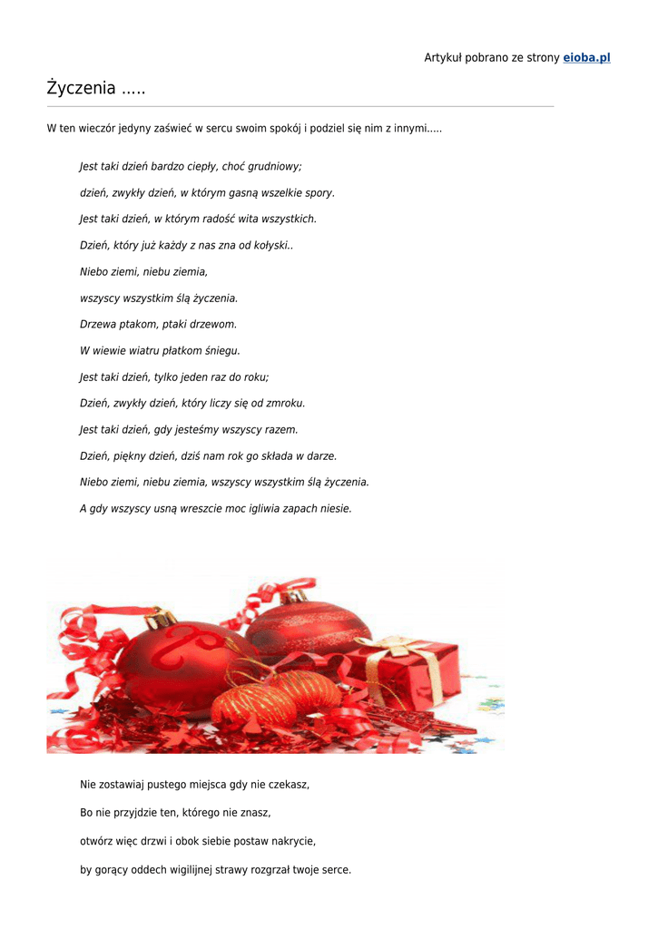 Artykuł pobrano ze strony eioba.pl Życzenia ..... W ten wieczór jedyny zaświeć w sercu swoim spokój i podziel się nim z innymi..... Jest taki dzień bardzo ciepły, choć grudniowy; dzień, zwykły dzień, w którym gasną wszelkie spory. Jest taki dzień, w którym radość wita wszystkich. Dzień, który już każdy z nas zna od kołyski.. Niebo ziemi, niebu ziemia, wszyscy wszystkim ślą życzenia. Drzewa ptakom, ptaki drzewom. W wiewie wiatru płatkom śniegu. Jest taki dzień, tylko jeden raz do roku; Dzień, zwykły dzień, który liczy się od zmroku. Jest taki dzień, gdy jesteśmy wszyscy razem. Dzień, piękny dzień, dziś nam rok go składa w darze. Niebo ziemi, niebu ziemia, wszyscy wszystkim ślą życzenia. A gdy wszyscy usną wreszcie moc igliwia zapach niesie. Nie zostawiaj pustego miejsca gdy nie czekasz, Bo nie przyjdzie ten, którego nie znasz, otwórz więc drzwi i obok siebie postaw nakrycie, by gorący oddech wigilijnej strawy rozgrzał twoje serce. Spójrz w oczy szaleństwu zimy, bo życie twoje to pory Roku jeśli mróz skuł lodem twe serce ,walcz by zło nie odebrało Ci reszty Tej wiosny, która zakwitła w twym sercu. A jeśli już czekasz, czekaj z pokorą, bo nic co ciche nie zapuka głośno do drzwi w taką noc, pomyśl o tych, co nigdy nie spacerują w twych myślach I powiedz im: Wesołych Świat Zgiełk fajerwerków szybko przemija, pozostaje płomyk – twarz odbita w lustrze znajoma od lat, może bardziej zamyślona, weź opłatek: „Życzę Ci by Dobro mieszkało w twym sercu” pościel żłóbek Maleńkiemu i zanuć kolędę, raźniej Wam będzie we dwoje. Przypomnij sobie chłód i ciemność zimowej nocy, byś nigdy nie zapomniał pragnienia, by Wiara, Nadzieja i Miłość biły z twych rąk, nie bój się podnieść z Ziemi liści-wspomnień minionych dni, bo nie wszystko stracone. Nie odmawiaj pomocy, nie gaś świecy, nie noś urazy bo nie zdążysz przeprosić, zbyt ciężko wędruje się pod wiatr bez odpoczynku, w czyichś ramionach bez przyjmowania pomocy - ty dobrze wiesz gdzie jej szukać. Przy wigilijnym stole posadź nieprzyjaciół, oni też mają gorące serca, odwiedź chorych, zaparz im herbatę, opowiadaj ociemniałym o gwieździstym niebie, dla każdego z nich bądź drogowskazem życia, drogą, która prowadzi do Boga. Nie zabijaj Nie okradaj Nie rań Nie omijaj … ale ....Kochaj! To właśnie tego wieczoru,gdy mróz lśni, jak gwiazda na dworze, przy stołach są miejsca dla obcych, bo nikt być samotny nie może. To właśnie tego wieczoru, gdy wiatr zimny śniegiem dmucha, w serca złamane i smutne po cichu wstępuje otucha. To właśnie tego wieczoru zło ze wstydu umiera, widząc, jak silna i piękna jest Miłość, gdy pięści rozwiera. To właśnie tego wieczoru, od bardzo wielu wieków, pod dachem tkliwej kolędy Bóg rodzi się w człowieku. Radość bliskich, biały obrus, na choince złoty anioł. Chcę się z Wami Drodzy moi podzielić się radością Wzrasta ziarno uczciwości na nadziei przebaczenia. Czułe ciepło dobrych wspomnień... Pragnę podziękować wszystkim za codzienne tu marzenia ... za przeżyte z Wami Eiobowy Ludu podczas tego 2012 Roku, chwile wspólnych wzruszeń i bliskości, dni w radości, dniu i w smutku... Chcę Wam szczerze podziękować... życzyć Wszystkim zdrowia, szczęścia i miłości... Oby Wasze serca przemówiły w Wigilijnej ciszy zmroku..... Jest w moim kraju zwyczaj, że w dzień wigilijny, Przy wzejściu pierwszej gwiazdy wieczornej na niebie, Ludzie gniazda wspólnego łamią chleb biblijny Najtkliwsze przekazując uczucia w tym chlebie. Radosnych, zdrowych i spokojnych Świąt ...Gamka Wiersze : Seweryn Krajewski, Anna Woźniak-Kot,Emilia Waśniowska, C.K.Norwid i kilka słów ode mnie :) Autor: Gamka Artykuł pobrano ze strony eioba.pl