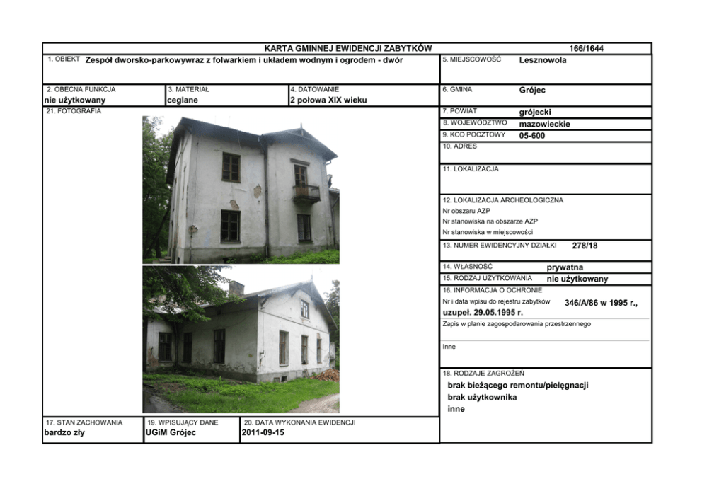 1. OBIEKT KARTA GMINNEJ EWIDENCJI ZABYTKÓW Zespół dworsko-parkowywraz z folwarkiem i układem wodnym i ogrodem - dwór 2. OBECNA FUNKCJA nie użytkowany 3. MATERIAŁ 4. DATOWANIE ceglane 2 połowa XIX wieku 21. FOTOGRAFIA 166/1644 5. MIEJSCOWOŚĆ Lesznowola 6. GMINA Grójec 7. POWIAT grójecki mazowieckie 05-600 8. WOJEWÓDZTWO 9. KOD POCZTOWY 10. ADRES 11. LOKALIZACJA 12. LOKALIZACJA ARCHEOLOGICZNA Nr obszaru AZP Nr stanowiska na obszarze AZP Nr stanowiska w miejscowości 13. NUMER EWIDENCYJNY DZIAŁKI 14. WŁASNOŚĆ 15. RODZAJ UŻYTKOWANIA 278/18 prywatna nie użytkowany 16. INFORMACJA O OCHRONIE Nr i data wpisu do rejestru zabytków 346/A/86 w 1995 r., uzupeł. 29.05.1995 r. Zapis w planie zagospodarowania przestrzennego Inne 18. RODZAJE ZAGROŻEŃ brak bieżącego remontu/pielęgnacji brak użytkownika inne 17. STAN ZACHOWANIA 19. WPISUJĄCY DANE bardzo zły UGiM Grójec 20. DATA WYKONANIA EWIDENCJI 2011-09-15 22. UWAGI Dwór zbudowany w 2 poł. XIX w. dla Bagniewskich. Po 1945 roku przekształcony na mieszkania. Budynek składa się z dwóch części: parterowej (być może wcześniejszy dwór) oraz piętrowej od wschodu. Nieregularny, wzniesiony na planie wydłużonego prostokąta, murowany, otynkowany. Część parterowa z występującym ryzalitowo przedsionkiem od frontu i obszernym tarasem od ogrodu. Część piętrowa z osobnym wejściem od wschodu i ozdobnym żeliwnym balkonem od południa odznacza się skromną dekoracją neorenesansową. Układ wnętrz gruntownie przekształcony. Dachy dwuspadowe z szerokimi okapami.