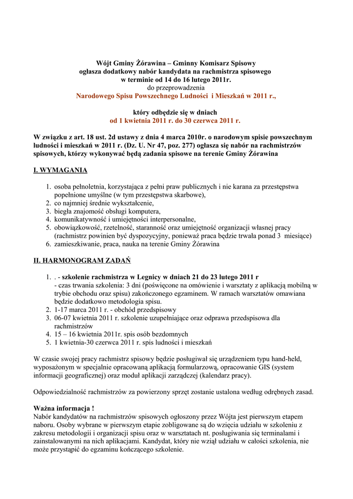 Wójt Gminy Żórawina – Gminny Komisarz Spisowy ogłasza dodatkowy nabór kandydata na rachmistrza spisowego w terminie od 14 do 16 lutego 2011r. do przeprowadzenia Narodowego Spisu Powszechnego Ludności i Mieszkań w 2011 r., który odbędzie się w dniach od 1 kwietnia 2011 r. do 30 czerwca 2011 r. W związku z art. 18 ust. 2d ustawy z dnia 4 marca 2010r. o narodowym spisie powszechnym ludności i mieszkań w 2011 r. (Dz. U. Nr 47, poz. 277) ogłasza się nabór na rachmistrzów spisowych, którzy wykonywać będą zadania spisowe na terenie Gminy Żórawina I. WYMAGANIA 1. osoba pełnoletnia, korzystająca z pełni praw publicznych i nie karana za przestępstwa popełnione umyślne (w tym przestępstwa skarbowe), 2. co najmniej średnie wykształcenie, 3. biegła znajomość obsługi komputera, 4. komunikatywność i umiejętności interpersonalne, 5. obowiązkowość, rzetelność, staranność oraz umiejętność organizacji własnej pracy (rachmistrz powinien być dyspozycyjny, ponieważ praca będzie trwała ponad 3 miesiące) 6. zamieszkiwanie, praca, nauka na terenie Gminy Żórawina II. HARMONOGRAM ZADAŃ 1. . - szkolenie rachmistrza w Legnicy w dniach 21 do 23 lutego 2011 r - czas trwania szkolenia: 3 dni (poświęcone na omówienie i warsztaty z aplikacją mobilną w trybie obchodu oraz spisu) zakończonego egzaminem. W ramach warsztatów omawiana będzie dodatkowo metodologia spisu. 2. 1-17 marca 2011 r. - obchód przedspisowy 3. 06-07 kwietnia 2011 r. szkolenie uzupełniające oraz odprawa przedspisowa dla rachmistrzów 4. 15 – 16 kwietnia 2011r. spis osób bezdomnych 5. 1 kwietnia-30 czerwca 2011 r. spis ludności i mieszkań W czasie swojej pracy rachmistrz spisowy będzie posługiwał się urządzeniem typu hand-held, wyposażonym w specjalnie opracowaną aplikacją formularzową, opracowanie GIS (system informacji geograficznej) oraz moduł aplikacji zarządczej (kalendarz pracy). Odpowiedzialność rachmistrzów za powierzony sprzęt zostanie ustalona według odrębnych zasad. Ważna informacja ! Nabór kandydatów na rachmistrzów spisowych ogłoszony przez Wójta jest pierwszym etapem naboru. Osoby wybrane w pierwszym etapie zobligowane są do wzięcia udziału w szkoleniu z zakresu metodologii i organizacji spisu oraz w warsztatach nt. posługiwania się terminalami i zainstalowanymi na nich aplikacjami. Kandydat, który nie wziął udziału w całości szkolenia, nie może przystąpić do egzaminu kończącego szkolenie. Drugim etapem naboru jest powołanie rachmistrzów przez dyrektora urzędu statystycznego na wniosek Gminnego Komisarza Spisowego po uzyskaniu pozytywnej oceny z egzaminu kończącego szkolenie oraz po złożeniu pisemnego przyrzeczenia o treści określonej w art. 12 ustawy o statystyce publicznej. III. TERMIN SKŁADANIA OFERT: do 16 lutego 2011 r. IV. WYMAGANE DOKUMENTY 1. pisemne zgłoszenie kandydatury z podpisem zawierające następujące dane: - imię i nazwisko, - adres zamieszkania, - telefon, adres e-mail, - data urodzenia, - miejsce zatrudnienia – nazwa i adres zakładu pracy, - w przypadku pobierania renty lub emerytury – numer emerytury lub renty, - w przypadku braku pracy – określenie bezrobotny, 2. dokument poświadczający wykształcenie, 3. oświadczenie o korzystaniu z pełni praw publicznych, 4. oświadczenie o niekaralności za przestępstwa popełnione umyślnie (w tym przestępstwa skarbowe), 5. oświadczenie o wyrażeniu zgody na przetwarzanie danych osobowych zawartych w ofercie pracy dla potrzeb niezbędnych do realizacji procesu rekrutacji zgodnie z ustawą z dnia 29.08.1997 r. o ochronie danych osobowych. V. MIEJSCE SKŁADANIA OFERT Urząd Gminy Żórawina ul.Kolejowa 6 55-020 Żórawina sekretariat Wymagane dokument należy składać w formie pisemnej osobiście lub przesłać pocztą (liczy się data wpływu wniosku do Urzędu) z dopiskiem: „Zgłoszenie kandydata na rachmistrza spisowego w Narodowym Spisie Powszechnym Ludności i Mieszkań w 2011". Dokumenty, które wpłyną do Urzędu po wyżej określonym terminie lub będą niekompletne nie będą rozpatrywane. Informacja dodatkowa! W dniu 17 luty 2011r. O godz. 8.00 zostanie przeprowadzona w Urzędzie Gminy Żórawina rozmowa kwalifikacyjna. WÓJT GMINY ŻÓRAWINA JAN ŻUKOWSKI
