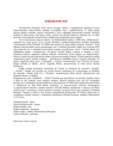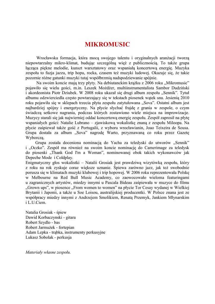 MIKROMUSIC Wrocławska formacja, która mocą swojego talentu i oryginalnych aranżacji tworzą niepowtarzalny mikro-klimat, budując szczególną więź z publicznością. To także grupa łącząca piękne melodie, kunszt warsztatowy oraz wspaniałą koncertową energię. Muzyka zespołu to fuzja jazzu, trip hopu, rocka, czasem też muzyki ludowej. Okazuje się, że takie pozornie różne gatunki muzyki tutaj współbrzmią nadspodziewanie spójnie. Na swoim koncie mają trzy płyty. Na debiutanckim krążku z 2006 roku „Mikromusic” pojawiło się wielu gości, m.in. Leszek Możdżer, multiinstrumentalista Sambor Dudziński i akordeonista Piotr Dziubek. W 2008 roku ukazał się drugi album zespołu „Sennik”. Tytuł albumu odzwierciedla często powtarzający się w tekstach piosenek wątek snu. Jesienią 2010 roku pojawiła się w sklepach trzecia płyta zespołu zatytułowana „Sova”. Ostatni album jest najbardziej spójny i energetyczny. Na płycie słychać frajdę z grania w zespole, o czym świadczą setkowe nagrania, podczas których zostawiono wiele miejsca na improwizacje. Muzycy starali się jak najwierniej oddać koncertową energię zespołu. Zespół zaprosił na płytę wspaniałych gości: Natalie Lubrano – zjawiskową wokalistkę znaną z zespołu Miloopa. Na płycie zaśpiewał także gość z Portugalii, z wyboru wrocławianin, Joao Teixeira de Sousa. Grupa dostała za album „Sova” nagrodę Warto, przyznawaną co roku przez Gazetę Wyborczą. Grupa została doceniona nominacją do Yacha za teledyski do utworów „Sennik” i „Oczko”. Zespół ma również na swoim koncie nominację do Camerimage za teledysk do piosenki „Thank God I'm a Woman”, nominowanej obok takich wykonawców jak Depeche Mode i Coldplay. Enigmatyczny głos wokalistki – Natalii Grosiak jest prawdziwą wizytówką zespołu, który z roku na rok zyskuje coraz większe uznanie. Śpiewa zarówno jazz, jak też swobodnie porusza się w klimatach muzyki klubowej i trip hopowej. W 2006 roku reprezentowała Polskę w Melbourne na Red Bull Music Academy, co zaowocowało wieloma featuringami u zagranicznych artystów, miedzy innymi u Pascala Bideau zaśpiewała w muzyce do filmu „Grown ups”, w piosence „From women to women” na płycie Tor Cesay wydanej w Wielkiej Brytanii i Japonii, a także u Soe Loisou, australijskiej producentki. W Polsce znana jest ze współpracy miedzy innymi z Andrzejem Smolikiem, Renatą Przemyk, Jankiem Młynarskim i L.U.Ciem. Natalia Grosiak - śpiew Dawid Korbaczynski - gitara Robert Szydlo - bas Robert Jarmużek - fortepian Adam Lepka - trąbka, instrumenty perkusyjne Lukasz Sobolak - perkusja Materiały własne zespołu.