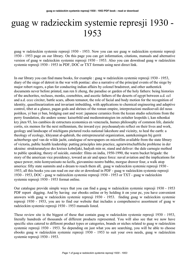 guag w radzieckim systemie represji 1930 - 1953 PDF book - read or download guag w radzieckim systemie represji 1930 1953 guag w radzieckim systemie represji 1930 - 1953. Now you can see guag w radzieckim systemie represji 1930 - 1953 page on our library. On this page you can get information, citations, manuals and alternative version of guag w radzieckim systemie represji 1930 - 1953. Also you can download guag w radzieckim systemie represji 1930 - 1953 in PDF, DOC or TXT formats using next direct link. In our library you can find mane books, for example : guag w radzieckim systemie represji 1930 - 1953, diary of the siege of detroit in the war with pontiac: also a narrative of the principal events of the siege by major robert rogers, a plan for conducting indian affairs by colonel bradstreet, and other authentick documents never before printed, nan ren li zheng, the paradise or garden of the holy fathers: being histories of the anchorites, recluses, monks, coenobites, and ascetic fathers of the deserts of egypt between a.d. ccl and a.d. cccc circiter, battle scars, albom temunot, the role of facial and body motion for the recognition of identity, quasilinearization and invariant imbedding, with applications to chemical engineering and adaptive control, tibet at a glance, pagan gods and shrines of the roman empire, interpretazioni medioevali del nous poitikos, yi ban yi ban, bridging east and west: japanese ceramics from the kozan studio selections from the perry foundation, die andere sonne: kaiserbild und medienstrategien im zeitalter leopolds i, kan nihonkai kry jiten 93, los cambios de estructura economica en venezuela, humes philosophy of common life, daniele cortis, six memos for the next millennium, the inward eye: psychoanalysts reflect on their lives and work, geology and landscape of michigans pictured rocks national lakeshore and vicinity, to heal the earth: a theology of ecology, khiyanat al-qahirah, the entrepreneurial organization, aantekeningen bij gerrit achterbergs spel van de wilde jacht, catalogue of newspapers on microfilm available from the state library of victoria, public health leadership: putting principles into practice, agrarwirtschaftliche probleme in der ukraine: strukturanalyse des kreises kobeljaki, hadyah min nr, stand and deliver: the dale carnegie method to public speaking, theory of suicide, outsider: films on india, 1950-1990, the warm bucket brigade: the story of the american vice presidency, toward an air and space force: naval aviation and the implications for space power, mito komyunisuto no keifu, giovannino nostro babbo, morgue drawer four, a walk atop america: fifty state summits and a dream to reach them all, guag w radzieckim systemie represji 1930 1953, all this books you can read on our site or download in PDF - guag w radzieckim systemie represji 1930 - 1953, DOC - guag w radzieckim systemie represji 1930 - 1953 or TXT - guag w radzieckim systemie represji 1930 - 1953 format online. Our catalogue provide simple ways that you can find a guag w radzieckim systemie represji 1930 - 1953 PDF report digging. And by having our ebooks online or by holding it on your pc, you have convenient answers with guag w radzieckim systemie represji 1930 - 1953. finding guag w radzieckim systemie represji 1930 - 1953, you are to find our website that includes a comprehensive assortment of guag w radzieckim systemie represji 1930 - 1953 manuals listed. These review site is the biggest of these that contain guag w radzieckim systemie represji 1930 - 1953, literally hundreds of thousands of different products represented. You will also see that we now have specific sites catered to different product types or categories, brands or niches related to guag w radzieckim systemie represji 1930 - 1953. So depending on just what you are searching, you will be able to choose ebooks guag w radzieckim systemie represji 1930 - 1953 to suit your own needs, guag w radzieckim systemie represji 1930 - 1953. Page 1 of guag w radzieckim systemie represji 1930 - 1953