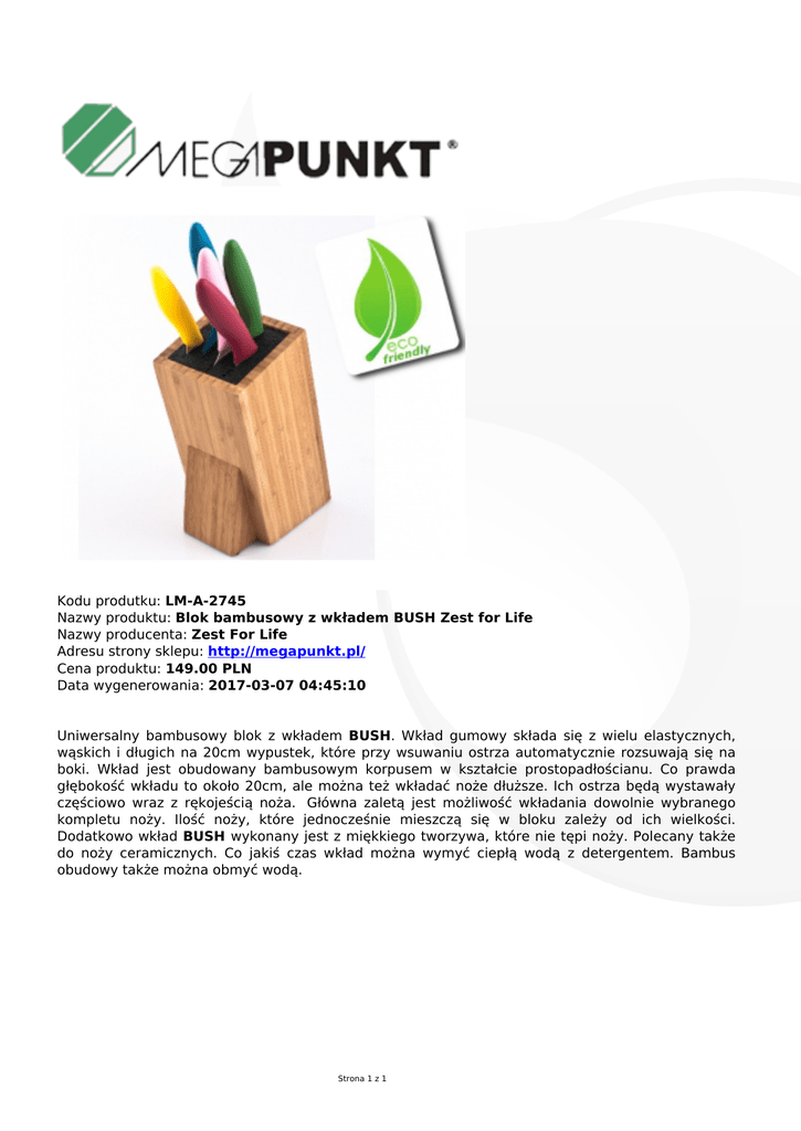 Kodu produtku: LM-A-2745 Nazwy produktu: Blok bambusowy z wkładem BUSH Zest for Life Nazwy producenta: Zest For Life Adresu strony sklepu: http://megapunkt.pl/ Cena produktu: 149.00 PLN Data wygenerowania: 2017-03-07 04:45:10 Uniwersalny bambusowy blok z wkładem BUSH. Wkład gumowy składa się z wielu elastycznych, wąskich i długich na 20cm wypustek, które przy wsuwaniu ostrza automatycznie rozsuwają się na boki. Wkład jest obudowany bambusowym korpusem w kształcie prostopadłościanu. Co prawda głębokość wkładu to około 20cm, ale można też wkładać noże dłuższe. Ich ostrza będą wystawały częściowo wraz z rękojeścią noża. Główna zaletą jest możliwość wkładania dowolnie wybranego kompletu noży. Ilość noży, które jednocześnie mieszczą się w bloku zależy od ich wielkości. Dodatkowo wkład BUSH wykonany jest z miękkiego tworzywa, które nie tępi noży. Polecany także do noży ceramicznych. Co jakiś czas wkład można wymyć ciepłą wodą z detergentem. Bambus obudowy także można obmyć wodą. Strona 1 z 1