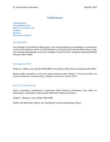 Dr. Przemysław Chojnowski Oktober 2015 Publikationen Monographien Herausgeberschaft Bücher in Vorbereitung Aufsätze Berichte Editorische Arbeiten Monographien Zur Strategie und Poetik des Übersetzens. Eine Untersuchung der Anthologien zur polnischen Lyrik von Karl Dedecius. Reihe TransÜD Arbeiten zur Theorie und Praxis des Übersetzens. Hrsg. von Hartwig Kalverkämper und Larisa Schippel, Frank & Timme. Verlag für wissenschaftliche Literatur, Berlin 2005. Herausgeberschaft Dedecius – Miłosz. Listy / Briefe 1958-2000, Forum Kultury Łódź / Neisse Verlag, Dresden 2011. Bariery i/jako wyzwania w nauczaniu języka polskiego jako obcego. In Zusammenarbeit mit Ksymena Filipowicz-Tokarska (Hg.), Collegium Polonicum, Słubice 2012. Bücher in Vorbereitung Życie w pomiędzy. Liminalność w twórczości Piotra (Petera) Lachmanna / Das Leben im Dazwischen. Liminalität im literarischen Werk Peter (Piotr) Lachmanns. Herbert – Dedecius. Listy / Briefe 1958-1996. Dichter des lächelnden Gottes. Jan Twardowski im deutschsprachigen Raum. Dr. Przemysław Chojnowski Oktober 2015 Aufsätze 2015 Życie w „pomiędzy”. Rys biograficzno-artystyczny Piotra (Petera) Lachmanna, in: „Prace Literaturoznawcze”, Bd. III, 2015, 129–154. Kanon polskiej poezji według Petera i Renate Lachmann, in: „Rocznik Komparatystyczny” 2015 (in Druck). Peter Lachmann. Nicht nur Übersetzer, in: „Oder-Übersetzen. Deutsch-Polnisches Übersetzungsjahrbuch“, 5/2014 (in Druck). Online-Veröffentlichung unter: http://www.uelex.de/artiklar/Peter_(Piotr)_LACHMANN 2014 Aus meinen Reisenotizen, in: Vom Text zum Text. Übersetzungskunst, philologische Präzision und interkulturelle Erfahrung. Festschrift für Andreas F. Kelletat, Julija Boguna, Jürgen Joachimsthaler, Jouko Nikkinen, Ewald Reuter, Detlef Wilske (Hg.), Frank und Timme Berlin, 2014, S. 403-404. Miłosz o tłumaczeniu (swojej) poezji w listach do Karla Dedeciusa, in: „Pamiętnik Literacki” 4/2014, 181-194. Na tropach emigracyjności, in: „Teksty Drugie” 4/2014, 159-166. Entdeckung eines Dichters. Übersetzung im Dienste der Ökumene, in: Religion im transnationalen Raum. Raumbezogene, literarische und theologische Grenzerfahrungen aus deutscher und polnischer Perspektive, Aleksandra Chylewska-Tölle, Alexander Tölle (Hg.), Logos Berlin 2014, S. 159-168. Jan Twardowskis Lyrik in der Nachdichtung der ostdeutschen Übersetzerin Karin Wolff, in: Mäander des Kulturtransfers. Polnischer und deutscher Katholizismus im 20. Jahrhundert, Aleksandra Chylewska-Tölle, Christian Heidrich (Hg.), Logos Berlin 2014, S. 145-162. Das Karl Dedecius Archiv an der Europa-Universität Viadrina. Entstehung und Struktur, in: Übersetzer als Entdecker. Ihr Leben und Werk als Gegenstand translationswissenschaftlicher und literaturgeschichtlicher Forschung, Andreas F. Kelletat; Aleksey Tashinskiy (Hg.), Frank und Timme Berlin, 2014, S. 123-132. 2013 Czesław Miłosz in seinen Briefen an Karl Dedecius über das Übersetzen (nicht nur) seiner Lyrik, in: Czesław Miłosz im Jahrhundert der Extreme, Marek Zybura, Andreas Lawaty (Hg.), 293-311, Fibre, Osnabrück 2013. Dr. Przemysław Chojnowski Oktober 2015 Unterschiedliche Poetiken in polnischen Übersetzungen Johannes Bobrowskis, in: Atem ich sende dich aus. Johannes Bobrowski im Blick seiner Interpreten. Dokumentation der Übersetzer-Werkstatt im Ostseezentrum für Schriftsteller und Übersetzer Visby, Klaus-Jürgen Liedtke (Hg.), 17-21, Saxa, Berlin 2013. Albrecht Lempp (1953-2012) – tłumacz, przyjaciel, człowiek, in: „Rocznik Karla Dedeciusa. Dedeciana – tłumaczenia – recepcja”. Bd. VI, 221-226. (Derselbe Text ohne Bibliografie auch in): „Wiadomości Literackie” 40-41, Nr. 5 2013. 2012 Jak Amerykanie postrzegają Polaków i dlaczego uczą się języka polskiego? in: Bariery i/jako wyzwania w nauczaniu języka polskiego jako obcego. Przemysław Chojnowski, Ksymena Filipowicz-Tokarska (Hg.), 31-42, Collegium Polonicum, Słubice 2012. Das Phänomen der literarischen Zweisprachigkeit. Zu Peter Lachmanns bilingualer Schreibpraxis, in: Kulturelle Grenzgänge. Festschrift für Christa Ebert zum 65. Geburtstag, Agnieszka Brockmann, Jekatherina Lebedewa, Maria Smyshliaeva, Rafał Żytyniec (Hg.), 215224, Frank & Timme, Berlin 2012. Od słownika do „pomnika“, in: Worte und Wendungen. Texte für Erika Worbs Andreas F. Kelletat, Andreas Meger (Hg.), 26-28, SAXA, Berlin 2012. Herbert i jego tłumacz, in: „Postscriptum Polonistyczne” 2012, Nr. 1 (9), 235-241. 2011 Pamięć pierwszego języka [Zur Vielsprachigkeit von Texten Peter Lachmanns am Beispiel des Dramas Hamlet gliwicki], in: „Borussia” 50/2011, 193-208. Za nami XX wiek. O antologia Karla Dedeciusa „Polnische Gedichte des 20. Jahrhunderts“, in: „Rocznik Karla Dedeciusa. Dedeciana – tłumaczenia – recepcja”. Bd. IV. 223-229, 2011. Mickiewicz mniej romantyczny. Z Karla Dedeciusem rozmawia Przemysław Chojnowski, in: „Topos” 11-13, 1/2/2011. Karl Dedecius als Übersetzer religiöser Lyrik Glaubensfragen, in: Religion und Kirche in polnischer Literatur, Ulrike Jekutsch (Hg.), 195-204, Harrasowitz, Wiesbaden 2011. 2010 Wiersze Henryka Bereski – przekłady i recepcja, in: Niezatarte świadectwo. Henryk Bereska – życie i twórczość, Krzysztof Kuczyński, Błażej Kaźmierczak (Hg.), 109-121, Słubice – Włocławek 2010. Das unterbrochene Schweigen. „Lektion der Stille“ fünfzig Jahre später, in: „Rocznik Karla Dedeciusa. Dedeciana – tłumaczenia – recepcja“. Bd. III, 175-207, Łódź 2010. Dr. Przemysław Chojnowski Oktober 2015 2008 Die Bereska-Sammlung am Collegium Polonicum in Słubice, in: Fährmann grenzenlos. Deutsche und Polen im heutigen Europa. Zum Gedenken an Henryk Bereska, Brigitte Helbig-Mischewski, Gabriela Matuszek (Hg.), Schriftenreihe: Westostpassagen Slawische Forschungen und Texte. Literatur, Sprache, Kultur Bd. 9, 325-329, Olms-Verlag, Hildesheim 2008. Polska poezja religijna w Niemczech. 