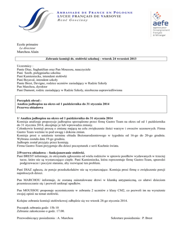 AMBASSADE DE FRANCE EN POLOGNE LYCEE FRANÇAIS DE VARSOVIE René Goscinny Ecole primaire Le directeur Marchou Alain Zebranie komisji ds. stołówki szkolnej - wtorek 24 wrzesień 2013 Uczestnicy : Panie Diaz, Saghatélian oraz Pan Moussou, nauczyciele Pani Szeib, pielęgniarka szkolna Pani Kamieniecka, intendent stołówki Pani Boyaval, intendent szkoły Panie Brest, Devigne, rodzice uczniów zasiadający w Radzie Szkoły Pan Marchou, dyrektor Pani Dumont, rodzic zasiadający w Radzie Szkoły, nieobecna usprawiedliwiona Porządek obrad : Analiza jadłospisu na okres od 1 pażdziernika do 31 stycznia 2014 Przerwa obiadowa 1/ Analiza jadłospisu na okres od 1 pażdziernika do 31 stycznia 2014 Komisja analizuje propozycje jadłospisu sporządzone przez firmę Gastro Team na okres od od 1 pażdziernika do 31 stycznia 2014, akceptuje je lub wprowadza zmiany. Członkowie komisji proszą o zmianę mającą na celu zwiększenie ilości warzyw i owoców sezonowych. Firma Gastro Team weżmie to pod uwagę i dokona zmian. Komisja prosi o ustalenie terminu obiadu Bożonarodzeniowego w tygodniu od 16-go do 20-go grudnia. Wybrana została data 19-go grudnia. Jadłospis został przyjęty przez komisję. Firma Gastro-Team przygotuje dla dzieci poczęstunek z serii Kuchnie świata. 2/Przerwa obiadowa – funkcjonowanie stołówki. Pani BREST informuje, że otrzymała zgłoszenia od wielu rodziców w sprawie posiłków wydawanych w trzeciej turze, które nie są wystarczająco ciepłe. Pani Kamieniecka, która reprezentuje firmę Gastro-Team, sprawdzi podgrzewacze i poczyni starania, aby rozwiązać ten problem. Pani DIAZ zgłasza, że porcje przedszkolaków nie są wystarczające. Komisja prosi firmę o zwiększenie porcji najmłoszych dzieci. Pan MARCHOU informuje, że zostaną zainstalowane drzwi w klamką antypaniczną, co ułatwi dzieciom przemieszczanie się i pozwoli uniknąć upadków. Pan MOUSSOU proponuje uczestniczenie w zebraniu 2 uczniów z klasy CM2, co pozwoli im na wyrażenie swojej opinii na temat stołówki. Kolejne zebranie komisji stołówkowej odbędzie się we wtorek 28-go stycznia 2014. Początek zebrania godz: 15h 10 Zebranie zakończono o godz. 17.00. Przewodniczący posiedzenia : A. Marchou Sekretarz posiedzenia : P. Brest