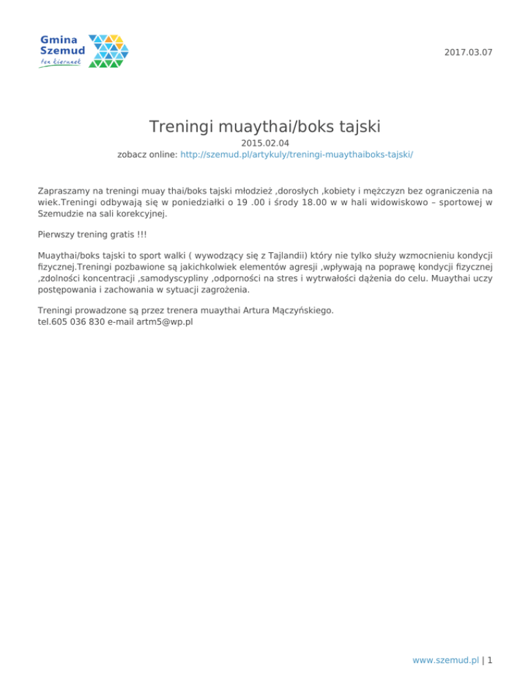 2017.03.07 Treningi muaythai/boks tajski 2015.02.04 zobacz online: http://szemud.pl/artykuly/treningi-muaythaiboks-tajski/ Zapraszamy na treningi muay thai/boks tajski młodzież ,dorosłych ,kobiety i mężczyzn bez ograniczenia na wiek.Treningi odbywają się w poniedziałki o 19 .00 i środy 18.00 w w hali widowiskowo – sportowej w Szemudzie na sali korekcyjnej. Pierwszy trening gratis !!! Muaythai/boks tajski to sport walki ( wywodzący się z Tajlandii) który nie tylko służy wzmocnieniu kondycji fizycznej.Treningi pozbawione są jakichkolwiek elementów agresji ,wpływają na poprawę kondycji fizycznej ,zdolności koncentracji ,samodyscypliny ,odporności na stres i wytrwałości dążenia do celu. Muaythai uczy postępowania i zachowania w sytuacji zagrożenia. Treningi prowadzone są przez trenera muaythai Artura Mączyńskiego. tel.605 036 830 e-mail [email protected] www.szemud.pl | 1