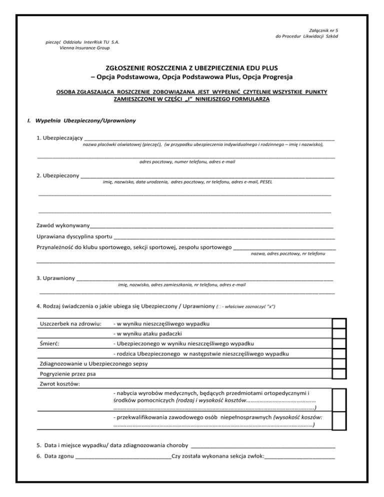 Załącznik nr 5 do Procedur Likwidacji Szkód pieczęć Oddziału InterRisk TU S.A. Vienna Insurance Group ZGŁOSZENIE ROSZCZENIA Z UBEZPIECZENIA EDU PLUS – Opcja Podstawowa, Opcja Podstawowa Plus, Opcja Progresja OSOBA ZGŁASZAJĄCA ROSZCZENIE ZOBOWIĄZANA JEST WYPEŁNIĆ CZYTELNIE WSZYSTKIE PUNKTY ZAMIESZCZONE W CZĘŚCI „I” NINIEJSZEGO FORMULARZA I. Wypełnia Ubezpieczony/Uprawniony 1. Ubezpieczający ______________________________________________________________________________ nazwa placówki oświatowej (pieczęć), (w przypadku ubezpieczenia indywidualnego i rodzinnego – imię i nazwisko), ____________________________________________________________________________________________________________________ adres pocztowy, numer telefonu, adres e-mail 2. Ubezpieczony _______________________________________________________________________________ imię, nazwisko, data urodzenia, adres pocztowy, nr telefonu, adres e-mail, PESEL __________________________________________________________________________________________________________________ __________________________________________________________________________________________________________________ Zawód wykonywany____________________________________________________________________________ Uprawiana dyscyplina sportu _____________________________________________________________________ Przynależność do klubu sportowego, sekcji sportowej, zespołu sportowego ________________________________ nazwa, adres pocztowy, nr telefonu _____________________________________________________________________________________________ 3. Uprawniony ________________________________________________________________________________ imię, nazwisko, adres zamieszkania, nr telefonu, adres e-mail ____________________________________________________________________________________________ 4. Rodzaj świadczenia o jakie ubiega się Ubezpieczony / Uprawniony ( - właściwe zaznaczyć ”x”) Uszczerbek na zdrowiu: - w wyniku nieszczęśliwego wypadku - w wyniku ataku padaczki Śmierć: - Ubezpieczonego w wyniku nieszczęśliwego wypadku - rodzica Ubezpieczonego w następstwie nieszczęśliwego wypadku Zdiagnozowanie u Ubezpieczonego sepsy Pogryzienie przez psa Zwrot kosztów: - nabycia wyrobów medycznych, będących przedmiotami ortopedycznymi i środków pomocniczych (rodzaj i wysokość kosztów…………………………….……….… ……………………………………………………………………………..…………………………………...….) - przekwalifikowania zawodowego osób niepełnosprawnych (wysokość koszów: ………….……………………………………………………………………………………………...…….……) 5. Data i miejsce wypadku/ data zdiagnozowania choroby _____________________________________________ 6. Data zgonu ______________________________Czy została wykonana sekcja zwłok:______________________ 7. 1) W przypadku nieszczęśliwego wypadku: przyczyna, okoliczności i przebieg wypadku, nazwiska i adresy ewentualnych świadków wypadku, rodzaj doznanych obrażeń (podać dokładnie i wyczerpująco)_________ ______________________________________________________________________________________ ______________________________________________________________________________________ ______________________________________________________________________________________ ______________________________________________________________________________________ 2) W przypadku choroby: rozpoznanie, przebieg leczenia, nazwa i adres placówki medycznej ____________ ______________________________________________________________________________________ ______________________________________________________________________________________ ______________________________________________________________________________________ ______________________________________________________________________________________ 8. Czy narząd (-y) opisane w pkt. 7 był (-y) uszkodzony (-e) przed zajściem zdarzenia w wyniku wypadku lub choroby ________________________________________________________________________________ 9. Czy Ubezpieczony był w chwili wypadku pod wpływem alkoholu, narkotyków lub innych środków o podobnym działaniu ______________________________________________________________________ 10. Czy do wypadku doszło w chwili prowadzenia przez Ubezpieczonego pojazdu________________________ samochodu motocyklu roweru inne Proszę podać numer i kategorię uprawnień do ich prowadzenia ____________________________________ 11. Czy w związku z wypadkiem było prowadzone postępowanie organów dochodzeniowych bądź postępowanie karne lub cywilne:_________________________________________________________________________ Jeżeli tak, proszę podać nazwę i adres odpowiedniej jednostki policji, prokuratury lub sądu, nr sprawy_____ ________________________________________________________________________________________ 12. Kto i gdzie udzielił Ubezpieczonemu pierwszej pomocy bezpośrednio po wypadku _____________________ _______________________________________________________________________________________ Jeżeli pierwszej pomocy udzielił lekarz, prosimy o dostarczenie kserokopii dokumentacji medycznej. 13. Czy leczenie (z uwzględnieniem zleconej rehabilitacji) zostało zakończone ____________________________ Jeżeli nie, proszę podać przewidywany termin zakończenia leczenia ________________________________ 14. Czy w związku z wypadkiem lub chorobą Ubezpieczony przebywał w szpitalu __________________________ Jeżeli tak, proszę podać okres pobytu w szpitalu ________________________________________________ 15. Czy Ubezpieczony jest uprawniony do występowania z roszczeniem o świadczenie z tytułu nieszczęśliwego wypadku w ramach innego ubezpieczenia ________________________________________ Jeżeli tak, proszę podać numer polisy ________________________________