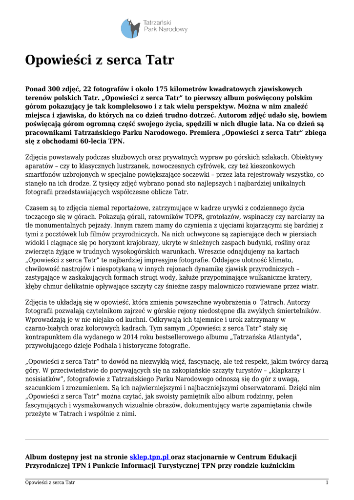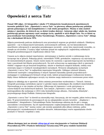 Opowieści z serca Tatr Ponad 300 zdjęć, 22 fotografów i około 175 kilometrów kwadratowych zjawiskowych terenów polskich Tatr. „Opowieści z serca Tatr” to pierwszy album poświęcony polskim górom pokazujący je tak kompleksowo i z tak wielu perspektyw. Można w nim znaleźć miejsca i zjawiska, do których na co dzień trudno dotrzeć. Autorom zdjęć udało się, bowiem poświęcają górom ogromną część swojego życia, spędzili w nich długie lata. Na co dzień są pracownikami Tatrzańskiego Parku Narodowego. Premiera „Opowieści z serca Tatr” zbiega się z obchodami 60-lecia TPN. Zdjęcia powstawały podczas służbowych oraz prywatnych wypraw po górskich szlakach. Obiektywy aparatów – czy to klasycznych lustrzanek, nowoczesnych cyfrówek, czy też kieszonkowych smartfonów uzbrojonych w specjalne powiększające soczewki – przez lata rejestrowały wszystko, co stanęło na ich drodze. Z tysięcy zdjęć wybrano ponad sto najlepszych i najbardziej unikalnych fotografii przedstawiających współczesne oblicze Tatr. Czasem są to zdjęcia niemal reportażowe, zatrzymujące w kadrze urywki z codziennego życia toczącego się w górach. Pokazują górali, ratowników TOPR, grotołazów, wspinaczy czy narciarzy na tle monumentalnych pejzaży. Innym razem mamy do czynienia z ujęciami kojarzącymi się bardziej z tymi z pocztówek lub filmów przyrodniczych. Na nich uchwycone są zapierające dech w piersiach widoki i ciągnące się po horyzont krajobrazy, ukryte w śnieżnych zaspach budynki, rośliny oraz zwierzęta żyjące w trudnych wysokogórskich warunkach. Wreszcie odnajdujemy na kartach „Opowieści z serca Tatr” te najbardziej impresyjne fotografie. Oddające ulotność klimatu, chwilowość nastrojów i niespotykaną w innych rejonach dynamikę zjawisk przyrodniczych – zastygające w zaskakujących formach strugi wody, kałuże przypominające wulkaniczne kratery, kłęby chmur delikatnie opływające szczyty czy śnieżne zaspy malowniczo rozwiewane przez wiatr. Zdjęcia te układają się w opowieść, która zmienia powszechne wyobrażenia o Tatrach. Autorzy fotografii pozwalają czytelnikom zajrzeć w górskie rejony niedostępne dla zwykłych śmiertelników. Wprowadzają je w nie niejako od kuchni. Odkrywają ich tajemnice i urok zatrzymany w czarno-białych oraz kolorowych kadrach. Tym samym „Opowieści z serca Tatr” stały się kontrapunktem dla wydanego w 2014 roku bestsellerowego albumu „Tatrzańska Atlantyda”, przywołującego dzieje Podhala i historyczne fotografie. „Opowieści z serca Tatr” to dowód na niezwykłą więź, fascynację, ale też respekt, jakim twórcy darzą góry. W przeciwieństwie do porywających się na zakopiańskie szczyty turystów – „klapkarzy i nosisiatków”, fotografowie z Tatrzańskiego Parku Narodowego odnoszą się do gór z uwagą, szacunkiem i zrozumieniem. Są ich najwierniejszymi i najbaczniejszymi obserwatorami. Dzięki nim „Opowieści z serca Tatr” można czytać, jak swoisty pamiętnik albo album rodzinny, pełen fascynujących i wysmakowanych wizualnie obrazów, dokumentujący warte zapamiętania chwile przeżyte w Tatrach i wspólnie z nimi. Album dostępny jest na stronie sklep.tpn.pl oraz stacjonarnie w Centrum Edukacji Przyrodniczej TPN i Punkcie Informacji Turystycznej TPN przy rondzie kuźnickim Opowieści z serca Tatr 1 (dostępność zalecamy wcześniej potwierdzić telefonicznie (+48) 18 20 23 300). Zamówienia hurtowe najlepiej kierować bezpośrednio do magazynu Wydawnictw TPN (dane kontaktowe na stronie sklepu). Opowieści z serca Tatr 2