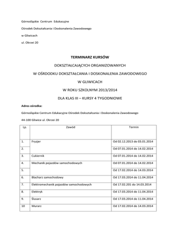 Górnośląskie Centrum Edukacyjne Ośrodek Dokształcania i Doskonalenia Zawodowego w Gliwicach ul. Okrzei 20 TERMINARZ KURSÓW DOKSZTAŁCAJĄCYCH ORGANIZOWANYCH W OŚRDODKU DOKSZTAŁCANIA I DOSKONALENIA ZAWODOWEGO W GLIWICACH W ROKU SZKOLNYM 2013/2014 DLA KLAS III – KURSY 4 TYGODNIOWE Adres ośrodka: Górnośląskie Centrum Edukacyjne Ośrodek Dokształcania i Doskonalenia Zawodowego 44-100 Gliwice ul. Okrzei 20 Lp. 1. Zawód Fryzjer 2. Termin Od 02.12.2013 do 03.01.2014 Od 07.01.2014 do 14.02.2014 3. Cukiernik Od 07.01.2014 do 14.02.2014 4. Mechanik pojazdów samochodowych Od 07.01.2014 do 14.02.2014 5. Od 17.02.2014 do 14.03.2014 6. Blacharz samochodowy Od 17.03.2014 do 11.04.2014 7. Elektromechanik pojazdów samochodowych Od 17.02.201 do 14.03.2014 8. Elektryk Od 17.03.2014 do 11.04.2014 9. Ślusarz Od 17.03.2014 do 11.04.2014 10 Murarz Od 17.02.2014 do 14.03.2014 Kursy o obniżonej liczbie godzin proporcjonalnie do liczby uczestników. W przypadku zwiększenia liczby uczniów na poszczególnych kursach liczba godzin realizowana będzie w całości. 1 Piekarz Od 17.02.2014 do 14.03.2014 2 Kamieniarz Od 17.02.2014 do 14.03.2014 3 Monter instalacji i urządzeń sanitarnych Od 17.02.2014 do 14.03.2014 4 Mechanik monter maszyn i urządzeń Od 17.02.2014 do 14.03.2014 5 Operator obrabiarek skrawających Od 17.02.2014 do 14.03.2014 6 Elektromechanik Od 17.03.2014 do 11.04.2014 Górnośląskie Centrum Edukacyjne Ośrodek Dokształcania i Doskonalenia Zawodowego w Gliwicach informuje, że nie będzie w stanie zorganizować kursów dla trzecich klas w podanych niżej zawodach. W późniejszym terminie podamy, który Ośrodek organizuje kursy w tych zawodach. Lp. Zawód Termin kursu Ośrodek organizujący kurs 1 Złotnik- jubiler Od 17.02.2014 do 16.03.2014 Zielona Góra 2 Rolnik Od 25.11.2013 do 22.12.2013 Zielona Góra 3 Tapicer Od 25.11.2013 do 20.12.2013 Kluczbork (Dobrodzień) 4 Monter - elektronik Od 30.09.2013 do 25.10.2013 Kluczbork (Głubczyce) 5 Stolarz Od 13.01.2014 do 21.02.2014 Olkusz 6 Rzeźnik - wędliniarz Od 04.11.2013 do 29.11.2013 Olkusz TERMINARZ KURSÓW DOKSZTAŁCAJĄCYCH ORGANIZOWANYCH W OŚRDODKU DOKSZTAŁCANIA I DOSKONALENIA ZAWODOWEGO W GLIWICACH W ROKU SZKOLNYM 2013/2014 DLA KLAS II – KURSY 4 TYGODNIOWE Adres ośrodka: Górnośląskie Centrum Edukacyjne Ośrodek Dokształcania i Doskonalenia Zawodowego 44-100 Gliwice ul. Okrzei 20 Lp. 1. Zawód Sprzedawca Termin Od 07.10.2013 do 31.10.2013 2. Od 02.12.2013 do 03.01.2014 3. Od 17.03.2014 do 11.04.2014 4. Kucharz 5. 6. Od 07.01.2014 do 14.02.2014 Od 17.03.2014 do 11.04.2014 Fryzjer Od 09.09.2013 do 04.10.2013 7. Od 07.10.2013 do 31.10.2013 8. Od 04.11.2013 do 29.11.2013 9. Cukiernik 10. Od 07.10.2013 do 31.10.2013 Od 02.12.2013 do 03.01.2014 11. Piekarz Od 04.11.2013 do 29.11.2013 12. Mechanik pojazdów samochodowych Od 07.10.2013 do 31.10.2013 13. Od 04.11.2013 do 29.11.2013 14 . Lakiernik Od 02.12.2013 do 03.01.2014 15. Elektromechanik pojazdów samochodowych Od 09.09.2013 do 04.10.2013 16. Fotograf Od 17.03.2014 do 11.04.2014 17. Ślusarz Od 09.09.2013 do 04.10.2013 18. Mechanik – monter maszyn 18 a Operator obrabiarek skrawających Od 07.10.2013 do 31.10.2013 19 Murarz - tynkarz Od 04.11.2013 do 29.11.2013 19 a Kamieniarz Od 04.11.2013 do 29.11.2013 19 b Monter konstrukcji budowlanych Od 04.11.2013 do 29.11.2013 20 Stolarz Od 09.09.2013 do 04.10.2013 i urządzeń Od 07.10.2013 do 31.10.2013 Kursy o obniżonej liczbie godzin proporcjonalnie do liczby uczestników. W przypadku zwiększenia liczby uczniów na poszczególnych kursach liczba godzin realizowana będzie w całości. 1 Elektromechanik Od 04.11.2013 do 29.11.2013 2 Elektryk Od 04.11.2013 do 29.11.2013 3 Monter sieci instalacji i urządzeń sanitarnych Od 04.11.2013 do 29.11.2013 4 Blacharz samochodowy Od 02.12.2013 do 03.01.2014 5 Cukiernik Od 02.12.2013 do 03.01.2014 Ośrodek Dokształcania i Doskonalenia Zawodowego w Gliwicach informuje, że nie będzie w stanie zorganizować kursów dla drugich klas w podanych niżej zawodach. W późniejszym terminie podamy, który Ośrodek organizuje kursy w tych zawodach. Lp. Zawód Termin kursu Ośrodek organizujący kurs 1 Wędliniarz Od 02.12.2013 do 10.01.2014 Olkusz 2 Pracownik pomocniczy obsługi hotelowej Od 30.09.2013 do 27.10.2013 Zielona Góra 3 Introligator Od 12.05.2014 do 06.06.2014 Mosina 4 Rolnik Od 07.01.2014 do 31.12.2013 Zielona Góra 5 Kominiarz Od 17.02.2014 do 16.03.2014 Zielona Góra 6 Ogrodnik Od 25.11.2013 do 22.12.2013 Zielona Góra 7 Mechanik operator pojazdów i maszyn rolniczych Od 28.10.2013 do 22.11.2013 Kluczbork Monter - elektronik Od 25.11.2013 do 20.12.2013 8 (Dobrodzień) Kluczbork (Głubczyce) 9. Kowal Od 03.09.2013 do 29.09.2013 Zielona Góra 10. Monter zabudowy i robót wykończeniowych w budownictwie Od 07.10.2013 do 31.10.2013 Olkusz TERMINARZ KURSÓW DOKSZTAŁCAJĄCYCH ORGANIZOWANYCH W OŚRDODKU DOKSZTAŁCANIA I DOSKONALENIA ZAWODOWEGO W GLIWICACH W ROKU SZKOLNYM 2013/2014 DLA KLAS I – KURSY 4 TYGODNIOWE Adres ośrodka: Górnośląskie Centrum Edukacyjne Ośrodek Dokształcania i Doskonalenia Zawodowego 44-100 Gliwice ul. Okrzei 20 Lp. 1. 2. Zawód Sprzedawca Termin Od 07.01.2014 do 14.02.2014 Od 12.05.2014 do 06.06.2014 3. 4. Od 17.02.2014 do 14.03.2014 Kucharz 5. 6. Od 17.02.2014 do 14.03.2014 Od 12.05.2014 do 06.06.2014 Fryzjer Od 17.02.2014 do 14.03.2014 7. Od 17.03.2014 do 11.04.2014 8. Od 12.05.2014 do 06.06.2014 9. Cukiernik 10. 11. Od 04.11.2013 do 29.11.2013 Od 12.05.2014 do 06.06.2014 Piekarz 12. Od 07.10.2013 do 31.10.2013 Od 12.05.2014 do 06.06.2014 13. Fotograf Od 07.01.2014 do 14.02.2014 14. Lakiernik Od 04.11.2013 do 29.11.2013 15. Mechanik pojazdów samochodowych Od 17.03.2014 do 11.04.2014 16. Od 12.05.2014 do 06.06.2014 17. Elektromechanik pojazdów samochodowych Od 02.12.2013 do 03.01.2014 18. Ślusarz Od 02.12.2013 do 03.01.2014 18 a Mechanik - monter maszyn i urządzeń Od 02.12.2013 do 03.01.2014 18 b Operator obrabiarek skrawających Od 02.12.2013