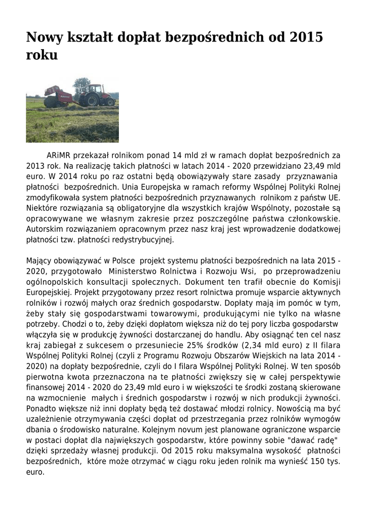 Nowy kształt dopłat bezpośrednich od 2015 roku ARiMR przekazał rolnikom ponad 14 mld zł w ramach dopłat bezpośrednich za 2013 rok. Na realizację takich płatności w latach 2014 - 2020 przewidziano 23,49 mld euro. W 2014 roku po raz ostatni będą obowiązywały stare zasady przyznawania płatności bezpośrednich. Unia Europejska w ramach reformy Wspólnej Polityki Rolnej zmodyfikowała system płatności bezpośrednich przyznawanych rolnikom z państw UE. Niektóre rozwiązania są obligatoryjne dla wszystkich krajów Wspólnoty, pozostałe są opracowywane we własnym zakresie przez poszczególne państwa członkowskie. Autorskim rozwiązaniem opracownym przez nasz kraj jest wprowadzenie dodatkowej płatności tzw. płatności redystrybucyjnej. Mający obowiązywać w Polsce projekt systemu płatności bezpośrednich na lata 2015 2020, przygotowało Ministerstwo Rolnictwa i Rozwoju Wsi, po przeprowadzeniu ogólnopolskich konsultacji społecznych. Dokument ten trafił obecnie do Komisji Europejskiej. Projekt przygotowany przez resort rolnictwa promuje wsparcie aktywnych rolników i rozwój małych oraz średnich gospodarstw. Dopłaty mają im pomóc w tym, żeby stały się gospodarstwami towarowymi, produkującymi nie tylko na własne potrzeby. Chodzi o to, żeby dzięki dopłatom większa niż do tej pory liczba gospodarstw włączyła się w produkcję żywności dostarczanej do handlu. Aby osiągnąć ten cel nasz kraj zabiegał z sukcesem o przesuniecie 25% środków (2,34 mld euro) z II filara Wspólnej Polityki Rolnej (czyli z Programu Rozwoju Obszarów Wiejskich na lata 2014 2020) na dopłaty bezpośrednie, czyli do I filara Wspólnej Polityki Rolnej. W ten sposób pierwotna kwota przeznaczona na te płatności zwiększy się w całej perspektywie finansowej 2014 - 2020 do 23,49 mld euro i w większości te środki zostaną skierowane na wzmocnienie małych i średnich gospodarstw i rozwój w nich produkcji żywności. Ponadto większe niż inni dopłaty będą też dostawać młodzi rolnicy. Nowością ma być uzależnienie otrzymywania części dopłat od przestrzegania przez rolników wymogów dbania o środowisko naturalne. Kolejnym novum jest planowane ograniczone wsparcie w postaci dopłat dla największych gospodarstw, które powinny sobie "dawać radę" dzięki sprzedaży własnej produkcji. Od 2015 roku maksymalna wysokość płatności bezpośrednich, które może otrzymać w ciągu roku jeden rolnik ma wynieść 150 tys. euro. Płatności w ramach wsparcia bezpośredniego od 2015 roku będą składały się z większej liczby elementów niż do tej pory i rolnicy będą mogli ubiegać się o następujące dopłaty: - jednolitą płatność obszarową (JPO) - 44,7% całej koperty finansowej; - płatności z tytułu zazieleniania (tzw. płatność z tytułu praktyk rolniczych korzystnych dla klimatu i środowiska) - 30% całej koperty finansowej; - płatności dla młodych rolników - 2% całej koperty finansowej; - płatności związane z produkcją (tzw. dobrowolne wsparcie powiązane z produkcją) 15% całej koperty finansowej, w tym 2% na dopłaty do uprawy roślin wysokobiałkowych; - płatność dodatkową (tzw. płatność redystrybucyjna) - 8,3 całej koperty finansowej; - przejściowe wsparcie krajowe ( płatność do tytoniu niezwiązana z produkcją). Zasady przyznawania wsparcia w ramach Jednolitej Płatności Obszarowej (JPO) nie zmieniły się w stosunku do obowiązujących wcześniej. Czyli płatność ta przysługuje tym rolnikom, którzy prowadza działalność rolniczą na co najmniej 1 hektarze gruntów. Wyjątek stanowią rolnicy, którzy mają mniej niż 1 ha użytków rolnych, lecz posiadają bydło, krowy, owce czy kozy, a więc przysługuje im płatność związana z produkcją. Przy czym warunkiem jej otrzymania będzie to, że w danym roku należna im łączna kwota płatności wyniesie co najmniej 200 euro. Co roku na realizację JPO będzie przeznaczane ponad 1,5 mld euro, a stawka na 1 ha wyniesie ok. 110 euro. Specjalne rozwiązania w systemie płatności bezpośrednich przygotowano dla rolników gospodarujących na niewielkich areałach. Od 2015 roku mają mieć oni możliwość skorzystania z tzw.uproszczonego systemu wsparcia. Wybierając ten system będą zwolnieni z kontroli norm i wymogów wzajemnej zgodności (Cross Compliance) oraz wypełniania tzw. praktyk zazielenienia. Nie będą też objęci publikowaniem ich nazwisk w wykazach beneficjentów dopłat. Do systemu płatności dla małych gospodarstw będą włączeni automatycznie rolnicy, w przypadku, gdy łączna kwota wsparcia bezpośredniego obliczona dla całego gospodarstwa, nie przekroczy 1250 euro, chyba że nie wyrażą na to zgody. Ważne jest to, że do takiego uproszczonego systemu rolnicy mogą przystąpić tylko w 2015 roku, bowiem zgodnie z obecnym stanem prawnym w kolejnych latach nie będzie to już możliwe. Wysokość płatności w ramach tego systemu będzie obliczana jako suma poszczególnych rodzajów płatności należnych rolnikowi z tym, że maksymalnie nie może być to więcej niż równowartość 1250 euro na gospodarstwo. Rolnicy, którzy kwalifikują się do objęcia systemem płatności dla małych gospodarstw i zdecydują się na przekazanie swojego gospodarstwa innemu rolnikowi, będą mogli ubiegać się, na warunkach określonych w PROW 2014-2020, o specjalną, roczną premię w wysokości 120% rocznej płatności, do otrzymania której rolnik byłby uprawniony pozostając w systemie dla małych gospodarstw. Łączna kwota przewidziana na takie wsparcie w wynosi ok. 130 mln euro. Płatności z tytułu zazieleniania - przeznaczono na ich realizację ok. 1 mld euro, a szacowana stawka wyniesie ok. 74 euro/ha. Takie wsparcie otrzymają rolnicy którzy w swoich gospodarstwach stosują dywersyfikację upraw, utrzymują trwałe użytki zielone (TUZ) oraz zachowują obszary proekologiczne (EFA). Obowiązek dywersyfikacji upraw nie będzie dotyc