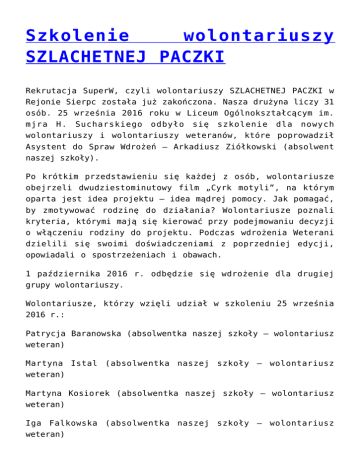 Szkolenie wolontariuszy SZLACHETNEJ PACZKI Rekrutacja SuperW, czyli wolontariuszy SZLACHETNEJ PACZKI w Rejonie Sierpc została już zakończona. Nasza drużyna liczy 31 osób. 25 września 2016 roku w Liceum Ogólnokształcącym im. mjra H. Sucharskiego odbyło się szkolenie dla nowych wolontariuszy i wolontariuszy weteranów, które poprowadził Asystent do Spraw Wdrożeń – Arkadiusz Ziółkowski (absolwent naszej szkoły). Po krótkim przedstawieniu się każdej z osób, wolontariusze obejrzeli dwudziestominutowy film „Cyrk motyli”, na którym oparta jest idea projektu – idea mądrej pomocy. Jak pomagać, by zmotywować rodzinę do działania? Wolontariusze poznali kryteria, którymi mają się kierować przy podejmowaniu decyzji o włączeniu rodziny do projektu. Podczas wdrożenia Weterani dzielili się swoimi doświadczeniami z poprzedniej edycji, opowiadali o spostrzeżeniach i obawach. 1 października 2016 r. odbędzie się wdrożenie dla drugiej grupy wolontariuszy. Wolontariusze, którzy wzięli udział w szkoleniu 25 września 2016 r.: Patrycja Baranowska (absolwentka naszej szkoły – wolontariusz weteran) Martyna Istal (absolwentka naszej szkoły – wolontariusz weteran) Martyna Kosiorek (absolwentka naszej szkoły – wolontariusz weteran) Iga Falkowska (absolwentka naszej szkoły – wolontariusz weteran) Tomasz Budka (absolwent naszej szkoły – wolontariusz weteran) Kamil Hercer (absolwent naszej szkoły – wolontariusz weteran) Monika Kucharska (uczennica kl. III a – nowy wolontariusz) Alicja Gutkowska (uczennica kl. III a – nowy wolontariusz) Elżbieta Pesta (uczennica kl. III a – nowy wolontariusz) Łukasz Budzich (uczeń kl. III e – nowy wolontariusz) Oliwia Linowska (uczennica kl. III d – nowy wolontariusz) Patrycja Majewska (uczennica kl. III d – nowy wolontariusz) Joanna Janiszewska (nauczyciel j. niemieckiego – wolontariusz weteran). Liderem Rejonu Sierpc Projektu SZLACHETNA PACZKA jest pani Joanna Janiszewska. LO Sierpc