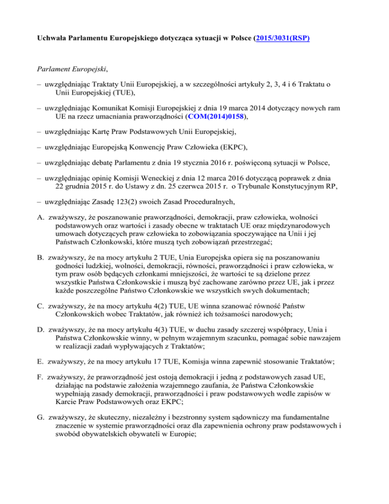 Uchwała Parlamentu Europejskiego dotycząca sytuacji w Polsce (2015/3031(RSP) Parlament Europejski, – uwzględniając Traktaty Unii Europejskiej, a w szczególności artykuły 2, 3, 4 i 6 Traktatu o Unii Europejskiej (TUE), – uwzględniając Komunikat Komisji Europejskiej z dnia 19 marca 2014 dotyczący nowych ram UE na rzecz umacniania praworządności (COM(2014)0158), – uwzględniając Kartę Praw Podstawowych Unii Europejskiej, – uwzględniając Europejską Konwencję Praw Człowieka (EKPC), – uwzględniając debatę Parlamentu z dnia 19 stycznia 2016 r. poświęconą sytuacji w Polsce, – uwzględniając opinię Komisji Weneckiej z dnia 12 marca 2016 dotyczącą poprawek z dnia 22 grudnia 2015 r. do Ustawy z dn. 25 czerwca 2015 r. o Trybunale Konstytucyjnym RP, – uwzględniając Zasadę 123(2) swoich Zasad Proceduralnych, A. zważywszy, że poszanowanie praworządności, demokracji, praw człowieka, wolności podstawowych oraz wartości i zasady obecne w traktatach UE oraz międzynarodowych umowach dotyczących praw człowieka to zobowiązania spoczywające na Unii i jej Państwach Członkowski, które muszą tych zobowiązań przestrzegać; B. zważywszy, że na mocy artykułu 2 TUE, Unia Europejska opiera się na poszanowaniu godności ludzkiej, wolności, demokracji, równości, praworządności i praw człowieka, w tym praw osób będących członkami mniejszości, że wartości te są dzielone przez wszystkie Państwa Członkowskie i muszą być zachowane zarówno przez UE, jak i przez każde poszczególne Państwo Członkowskie we wszystkich swych dokumentach; C. zważywszy, że na mocy artykułu 4(2) TUE, UE winna szanować równość Państw Członkowskich wobec Traktatów, jak również ich tożsamości narodowych; D. zważywszy, że na mocy artykułu 4(3) TUE, w duchu zasady szczerej współpracy, Unia i Państwa Członkowskie winny, w pełnym wzajemnym szacunku, pomagać sobie nawzajem w realizacji zadań wypływających z Traktatów; E. zważywszy, że na mocy artykułu 17 TUE, Komisja winna zapewnić stosowanie Traktatów; F. zważywszy, że praworządność jest ostoją demokracji i jedną z podstawowych zasad UE, działając na podstawie założenia wzajemnego zaufania, że Państwa Członkowskie wypełniają zasady demokracji, praworządności i praw podstawowych wedle zapisów w Karcie Praw Podstawowych oraz EKPC; G. zważywszy, że skuteczny, niezależny i bezstronny system sądowniczy ma fundamentalne znaczenie w systemie praworządności oraz dla zapewnienia ochrony praw podstawowych i swobód obywatelskich obywateli w Europie; H. zważywszy, że Trybunał Konstytucyjny powstał jako jeden z kluczowych elementów zapewniających praworządność i mechanizmy gwarantujące zachowanie równowagi politycznej w demokracji konstytucyjnej w Polsce; I. zważywszy, że ostatnie wydarzenia w Polsce, zwłaszcza dyskusja polityczno-prawna dotycząca składu Trybunału Konstytucyjnego oraz nowych zasad jego funkcjonowania (odnoszące się m.in. do rozpoznawania spraw, ich kolejności, odpowiedniego quorum i większości niezbędnej do podejmowania przez Trybunał decyzji) doprowadziły do powstania obaw dotyczących możliwości Trybunału Konstytucyjnego do stania na straży konstytucji i gwarantowania praworządności; J. zważywszy, że Komisja Wenecka jasno stwierdziła, że Trybunał Konstytucyjny nie jest w stanie spełniać swej funkcji jako gwaranta Konstytucji Polski z uwagi na fakt, że wyrok Trybunału z dnia 9 marca 2016 r. nie został opublikowany, toteż nie może wejść w życie; zważywszy, że Komisja Wenecka ostrzegła, że sparaliżowanie Trybunału podważy demokrację, prawa człowieka i praworządność; K. zważywszy, że działania podjęte przez Rząd Polski i Prezydenta Rzeczypospolitej Polskiej w odniesieniu do Trybunału Konstytucyjnego stanowią zagrożenie dla demokracji konstytucyjnej; L. zważywszy, że po debacie orientacyjnej z dnia 13 stycznia 2016 r., Komisja zdecydowała wszcząć dialog strukturalny na zasadach Ram Praworządności wysyłając pismo do rządu polskiego w celu wyjaśnienia sytuacji w Polsce; M. zważywszy, że Komisja, stojąc na straży Traktatów, będzie obecnie zbierać i analizować wszystkie odnośnie informacje w celu oceny, czy stanowią one wyraźne przesłanki systemowego zagrożenia praworządności; N. zważywszy, że Ramy Praworządności mają na celu zajmowanie się zagrożeniami praworządności mającymi charakter systemowy, zwłaszcza w sytuacjach, których nie można skutecznie rozwiązać w drodze procedur naruszenia prawa i gdy „bezpieczniki praworządności” istniejące na poziomie krajowym nie wydają się być już w stanie poradzić sobie z takimi zagrożeniami. ; O. zważywszy, że aktualna Konstytucja Polski, przyjęta w roku 1997, gwarantuje podział władzy, pluralizm polityczny, wolność prasy i słowa i prawo do informacji; P. zważywszy, że w dodatku do kryzysu konstytucyjnego istnieją inne problemy stanowiące źródło poważnego zaniepokojenia Parlamentu Europejskiego w zakresie takim, że mogą one stanowić przypadki pogwałcenia prawa europejskiego oraz praw podstawowych, w tym praw kobiet; zważywszy, że takie działania polskiego rządu muszą być ściśle monitorowane przez instytucje europejskie: 1. Uznaje za kluczowe zapewnienie, że wspólne europejskie wartości wymienione w artykule 2 TUE są w pełni przestrzegane; 2. Jest przekonany, że wszystkie Państwa Członkowskie muszą w pełni przestrzegać prawa Unii Europejskiej w swych praktykach administracyjnych i ustawodawczych, i że wszelkie ustawodawstwo, w tym prawo pierwotne wszystkich Państw Członkowskich i państw kandydujących winno odzwierciedlać i przestrzegać podstawowych wartości europejskich, w tym zasad demokracji, praworządności i poszanowania praw podstawowych; 3. Jest poważnie zaniepokojony faktem, że faktyczne sparaliżowanie polskiego Trybunału Konstytucyjnego stanowi zagro