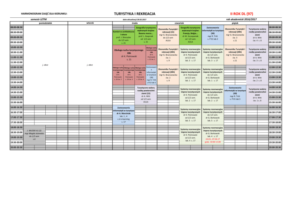 TURYSTYKA I REKREACJA HARMONOGRAM ZAJĘĆ DLA KIERUNKU: semestr LETNI poniedziałek środa czwartek Geografia turystyczna Kamień w architekturze wybranych krajów: Basenu morza... i sztuce prof. L. Kasprzak prof. J. Skoczylas od 1/2 sem do 1/2 sem s. 21 s. 21 08:30‐09:00 09:00‐09:30 09:30‐10:00 10:00‐10:30 Obsługa ruchu turystycznego 20h dr K. Piotrowski s. 21 10:30‐11:00 11:00‐11:30 Obsługa ruchu turystycznego 10h dr K. Piotrowski s. 21 ćw. 1 11:30‐12:00 12:30‐13:00 13:00‐13:30 13:30‐14:00 Turystyczne walory rzeźby powierzchni ziemi (15) dr A. Witt od 1/2 sem AULA 14:30‐15:00 15:00‐15:30 15:30‐16:00 16:00‐16:30 Zastosowania informatyki w turystyce dr A. Marciniak lab. 1 , 4 c.d e‐learning s. 17 16:30‐17:00 17:00‐17:30 17:30‐18:00 18:00‐18:30 19:30‐20:00 20:00‐20:30 Turystyczne walory rzeźby powierzchni ziemi dr A. Witt ćw. 4 s. 8 Ekonomika Turystyki i Systemy rezerwacyjne Systemy rezerwacyjne Ekonomika Turystyki i imprez turystycznych rekreacji (20h) imprez turystycznych rekreacji (20h) dr K. Piotrowski mgr G. Braciszewska do 1/2 sem. mgr G. Braciszewska od 1/2 sem. ćw. 4 dr G. Borkowski ćw. 1 lab. 3 s. 17 s.11 lab. 3 s. 17 s. 9 Turystyczne walory rzeźby powierzchni ziemi dr A. Witt ćw. 3 s. 8 J. WŁOSKI A1 (2) mgr Magda Jeżewska do 1/2 sem s.6 08:00‐08:30 08:30‐09:00 09:00‐09:30 09:30‐10:00 10:00‐10:30 10:30‐11:00 11:00‐11:30 11:30‐12:00 j. obce 14:00‐14:30 19:00‐19:30 piątek Zastosowania Geografia turystyczna Ekonomika Turystyki i Ekonomika Turystyki i wybranych krajów: informatyki w turystyce rekreacji (20h) rekreacji (15) (30) Francja, Belgia... mgr G. Braciszewska mgr G. Braciszewska mgr R. Tritt dr M. Szczepaniak ćw. 3 do 1/2 sem s. P 01 lab 2 od 1/2 sem s.11 AULA AULA Obsługa ruchu Obsługa ruchu Obsługa ruchu Zastosowani Ekonomika Turystyki i Systemy rezerwacyjne Systemy rezerwacyjne a turystycznego turystycznego turystycznego imprez turystycznych imprez turystycznych rekreacji (20h) informatyki 10h 10h 10h dr K. dr K. dr K. w turystyce mgr G. Braciszewska dr K. Piotrowski do 1/2 sem. Piotrowski Piotrowski Piotrowski (30) od 1/2 sem. dr G. Borkowski ćw. 2 s. 19 ćw. 2 s. 19 ćw. 3 s. 19 ćw. 4 mgr R. Tritt lab. 1 s. 17 lab. 1 s. 17 s. 9 s.P13 lab 5 12:00‐12:30 18:30‐19:00 rok akademicki 2016/2017 data aktualizacji 28.02.2017 wtorek 08:00‐08:30 j. obce II ROK DL (97) Zastosowania Systemy rezerwacyjne Systemy rezerwacyjne informatyki w turystyce imprez turystycznych imprez turystycznych (30) dr K. Piotrowski do 1/2 sem. mgr R. Tritt od 1/2 sem. dr G. Borkowski s. P 01 lab 3 lab. 2 s. 17 lab. 2 s. 17 Turystyczne walory rzeźby powierzchni ziemi dr A. Witt ćw. 2 s. 8 Turystyczne walory rzeźby powierzchni ziemi dr A. Witt ćw. 1 s. 8 Systemy rezerwacyjne imprez turystycznych dr G. Borkowski lab. 4 s. 17 24.03., 07.04.17 godz. 10:00‐15:00 12:30‐13:00 13:00‐13:30 13:30‐14:00 14:00‐14:30 14:30‐15:00 15:00‐15:30 15:30‐16:00 16:00‐16:30 Systemy rezerwacyjne Systemy rezerwacyjne imprez turystycznych imprez turystycznych dr K. Piotrowski do 1/2 sem. od 1/2 sem. dr G. Borkowski lab. 5 s. 17 lab. 5 s. 17 Systemy rezerwacyjne imprez turystycznych dr K. Piotrowski od 1/2 sem. lab. 4 s. 17 12:00‐12:30 16:30‐17:00 17:00‐17:30 17:30‐18:00 18:00‐18:30 18:30‐19:00 19:00‐19:30 19:30‐20:00 20:00‐20:30