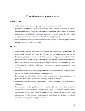 Prawa i obowiązki wolontariusza OBOWIĄZKI • wolontariusz nie pobiera wynagrodzenia za wykonywane czynności; • posiadanie kwalifikacji i spełniania wymagań odpowiednich do rodzaju i zakresu świadczonej pomocy, jeśli prawo tak nakazuje – przykład: kwestowanie nie wymaga dodatkowych kwalifikacji, natomiast zastrzyk wykonać może jedynie osoba z odpowiednimi zaświadczeniami (wykształcenie pielęgniarskie); • osoba niepełnoletnia może zostać wolontariuszem jedynie za pisemną zgodą rodzica lub opiekuna (wzór zgody rodziców) PRAWA • obowiązkowe pisemne porozumienie (umowa), gdy świadczenie wolontariusza na rzecz danej instytucji trwa powyżej 30 dni. W przypadku pierwszych 30 dni korzystający jest zobowiązany potwierdzić na piśmie treść porozumienia tylko wtedy, gdy wolontariusz zażąda takiego potwierdzenia, ale wystarczy również porozumienie ustne. Porozumienie musi zawierać informacje o zakresie, obowiązkach i czasie wykonywanych świadczeń, a także opis możliwości rozwiązania porozumienia (wzór umowy); • na prośbę wolontariusza korzystający potwierdza treść porozumienia, wydaje pisemne zaświadczenie oraz opinię o wykonywaniu świadczeń; • korzystający ma obowiązek informowania wolontariusza o przysługujących mu prawach i obowiązkach oraz zapewnia dostępność tych informacji; • wolontariuszowi przysługuje zaopatrzenie z tytułu wypadku przy wykonywaniu świadczeń. • Wolontariusza trzeba poinformować o ryzyku dla zdrowia i bezpieczeństwa związanym z wykonywanymi świadczeniami oraz o zasadach ochrony przed zagrożeniami. Należy także zapewnić mu higieniczne i bezpieczne warunki pracy oraz odpowiednie środki ochrony indywidualnej uzależnione od rodzaju świadczeń i zagrożeń związanych z ich wykonywaniem; 1 • korzystający ma obowiązek pokrycia kosztów podróży służbowych i diet wolontariusza; • jeżeli wolontariusz wykonuje świadczenia przez okres nie dłuższy niż 30 dni należy mu się ubezpieczenie od następstw nieszczęśliwych wypadków ze strony korzystającego. Powyżej 30 dni – na podstawie umowy pisemnej – wolontariusz jest ubezpieczony przez państwo (więcej w dziale ubezpieczenia). Korzystający może pokryć inne niezbędne koszty ponoszone przez wolontariusza oraz koszty szkoleń. Jednak nie musi tego robić. Materiały źródłowe www.wolontariat.org.pl 2