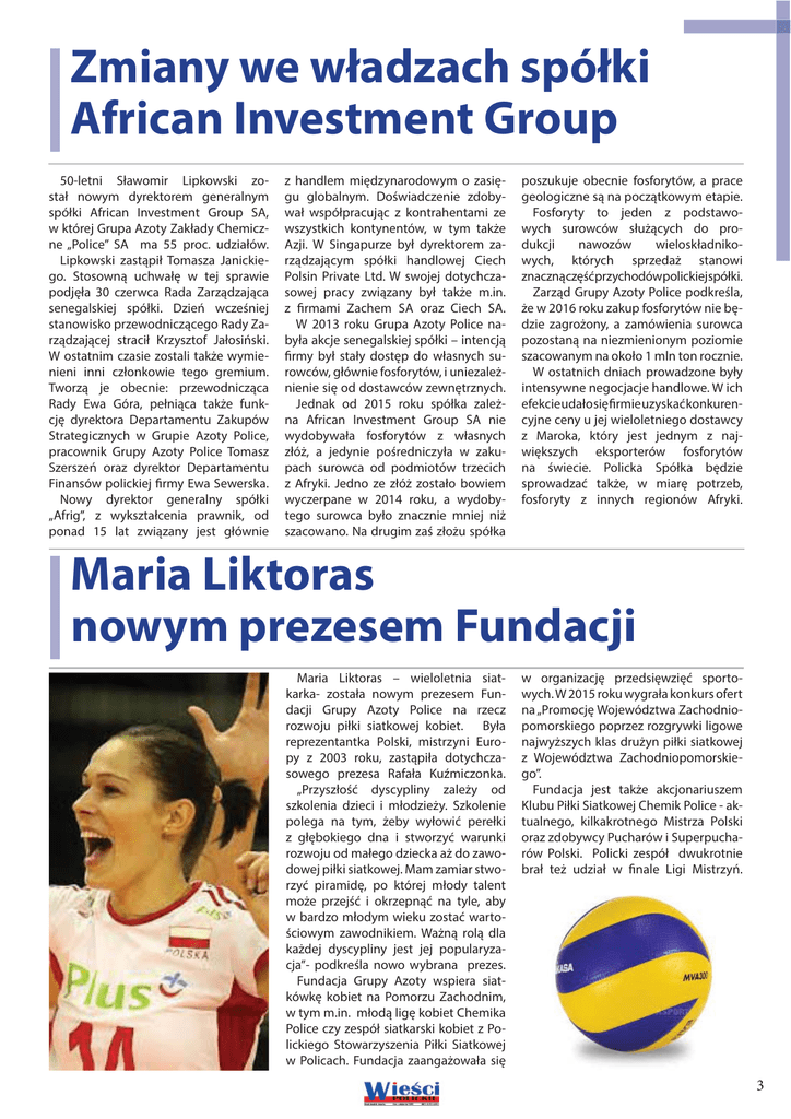Zmiany we władzach spółki African Investment Group 50-letni Sławomir Lipkowski został nowym dyrektorem generalnym spółki African Investment Group SA, w której Grupa Azoty Zakłady Chemiczne „Police” SA ma 55 proc. udziałów. Lipkowski zastąpił Tomasza Janickiego. Stosowną uchwałę w tej sprawie podjęła 30 czerwca Rada Zarządzająca senegalskiej spółki. Dzień wcześniej stanowisko przewodniczącego Rady Zarządzającej stracił Krzysztof Jałosiński. W ostatnim czasie zostali także wymienieni inni członkowie tego gremium. Tworzą je obecnie: przewodnicząca Rady Ewa Góra, pełniąca także funkcję dyrektora Departamentu Zakupów Strategicznych w Grupie Azoty Police, pracownik Grupy Azoty Police Tomasz Szerszeń oraz dyrektor Departamentu Finansów polickiej firmy Ewa Sewerska. Nowy dyrektor generalny spółki „Afrig”, z wykształcenia prawnik, od ponad 15 lat związany jest głównie z handlem międzynarodowym o zasięgu globalnym. Doświadczenie zdobywał współpracując z kontrahentami ze wszystkich kontynentów, w tym także Azji. W Singapurze był dyrektorem zarządzającym spółki handlowej Ciech Polsin Private Ltd. W swojej dotychczasowej pracy związany był także m.in. z firmami Zachem SA oraz Ciech SA. W 2013 roku Grupa Azoty Police nabyła akcje senegalskiej spółki – intencją firmy był stały dostęp do własnych surowców, głównie fosforytów, i uniezależnienie się od dostawców zewnętrznych. Jednak od 2015 roku spółka zależna African Investment Group SA nie wydobywała fosforytów z własnych złóż, a jedynie pośredniczyła w zakupach surowca od podmiotów trzecich z Afryki. Jedno ze złóż zostało bowiem wyczerpane w 2014 roku, a wydobytego surowca było znacznie mniej niż szacowano. Na drugim zaś złożu spółka poszukuje obecnie fosforytów, a prace geologiczne są na początkowym etapie. Fosforyty to jeden z podstawowych surowców służących do produkcji nawozów wieloskładnikowych, których sprzedaż stanowi znacznączęśćprzychodówpolickiejspółki. Zarząd Grupy Azoty Police podkreśla, że w 2016 roku zakup fosforytów nie będzie zagrożony, a zamówienia surowca pozostaną na niezmienionym poziomie szacowanym na około 1 mln ton rocznie. W ostatnich dniach prowadzone były intensywne negocjacje handlowe. W ich efekcie udało się firmie uzyskać konkurencyjne ceny u jej wieloletniego dostawcy z Maroka, który jest jednym z największych eksporterów fosforytów na świecie. Policka Spółka będzie sprowadzać także, w miarę potrzeb, fosforyty z innych regionów Afryki. Maria Liktoras nowym prezesem Fundacji Maria Liktoras – wieloletnia siatkarka- została nowym prezesem Fundacji Grupy Azoty Police na rzecz rozwoju piłki siatkowej kobiet. Była reprezentantka Polski, mistrzyni Europy z 2003 roku, zastąpiła dotychczasowego prezesa Rafała Kuźmiczonka. „Przyszłość dyscypliny zależy od szkolenia dzieci i młodzieży. Szkolenie polega na tym, żeby wyłowić perełki z głębokiego dna i stworzyć warunki rozwoju od małego dziecka aż do zawodowej piłki siatkowej. Mam zamiar stworzyć piramidę, po której młody talent może przejść i okrzepnąć na tyle, aby w bardzo młodym wieku zostać wartościowym zawodnikiem. Ważną rolą dla każdej dyscypliny jest jej popularyzacja”- podkreśla nowo wybrana prezes. Fundacja Grupy Azoty wspiera siatkówkę kobiet na Pomorzu Zachodnim, w tym m.in. młodą ligę kobiet Chemika Police czy zespół siatkarski kobiet z Polickiego Stowarzyszenia Piłki Siatkowej w Policach. Fundacja zaangażowała się w organizację przedsięwzięć sportowych. W 2015 roku wygrała konkurs ofert na „Promocję Województwa Zachodniopomorskiego poprzez rozgrywki ligowe najwyższych klas drużyn piłki siatkowej z Województwa Zachodniopomorskiego”. Fundacja jest także akcjonariuszem Klubu Piłki Siatkowej Chemik Police - aktualnego, kilkakrotnego Mistrza Polski oraz zdobywcy Pucharów i Superpucharów Polski. Policki zespół dwukrotnie brał też udział w finale Ligi Mistrzyń. 3 Grupa Azoty i PKP Cargo zacieśniają współpracę W czwartek 23 czerwca w siedzibie Giełdy Papierów Wartościowych w Warszawie prezesi Grupy Azoty i PKP CARGO podpisali dwuletni kontrakt na przewozy ponad 4 mln ton produktów nawozowych i chemicznych oraz surowców dla spółek z Grupy Azoty. Szacunkowa łączna wartość kontraktu wynosi blisko 200 mln zł. Współpracę między PKP CARGO a Grupą Azoty regulują umowa ramowa oraz oddzielne umowy wolumenowe z pięcioma spółkami chemiczno-nawozowego potentata. Jest to kontynuacja dotychczasowej współpracy pomiędzy tymi podmiotami. Podpisanie kontraktu nastąpiło w obecności Dawida Jackiewicza, Ministra Skarbu Państwa. W ramach nowego kontraktu PKP CARGO będzie świadczyć kompleksowe usługi transportowe na rzecz Grupy Azoty. Największy w Polsce przewoźnik dostarczy m.in. nawozy, wyroby chemiczne oraz ładunki w kontenerach do odbiorców w kraju oraz obsłuży połączenia w ruchu międzynarodowym. Te ostatnie dotyczą m.in. połączeń z polskimi portami. Część transportów obejmie przewozy pomiędzy spółkami w ramach Grupy Azoty. Na podstawie nowego kontraktu przez dwa lata PKP CARGO będzie obsługiwać pięć następujących spółek: Grupa Azoty Zakłady Azotowe „Puławy” S.A., Grupa Azoty Zakłady Azotowe Kędzierzyn S.A., Grupa Azoty Zakłady Chemiczne „Police” S.A., Grupa Azoty Kopalnie oraz Zakłady Chemiczne Siarki „SIARKOPOL” S.A. z siedzibą w Grzybowie. - Współpraca spółek kluczowych dla polskiej gospodarki jest wyraźnym sygnałem, wskazującym na realizację sta- 4 wianych przez Ministerstwo Skarbu Państwa założeń wzmacniania patriotyzmu gospodarczego. Cieszę się, że PKP Cargo i Grupa Azoty nawiązują ścisłą kooperację i jestem przekonany, że przyczyni się ona do wzmocnienia ich rynkowej pozycji nie tylko w Polsce, ale też w Europie. Odbudowanie silnej i niezależnej rodzi