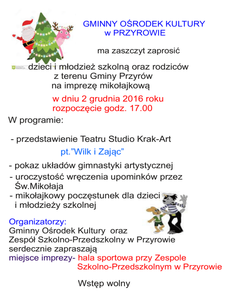 GMINNY OŚRODEK KULTURY w PRZYROWIE ma zaszczyt zaprosić dzieci i młodzież szkolną oraz rodziców z terenu Gminy Przyrów na imprezę mikołajkową w dniu 2 grudnia 2016 roku rozpoczęcie godz. 17.00 W programie: - przedstawienie Teatru Studio Krak-Art pt.”Wilk i Zając” - pokaz układów gimnastyki artystycznej - uroczystość wręczenia upominków przez Św.Mikołaja - mikołajkowy poczęstunek dla dzieci i młodzieży szkolnej Organizatorzy: Gminny Ośrodek Kultury oraz Zespół Szkolno-Przedszkolny w Przyrowie serdecznie zapraszają miejsce imprezy- hala sportowa przy Zespole Szkolno-Przedszkolnym w Przyrowie Wstęp wolny