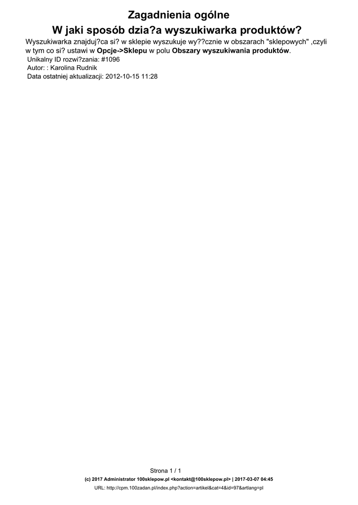Zagadnienia ogólne W jaki sposób dzia?a wyszukiwarka produktów? Wyszukiwarka znajduj?ca si? w sklepie wyszukuje wy??cznie w obszarach "sklepowych" ,czyli w tym co si? ustawi w Opcje->Sklepu w polu Obszary wyszukiwania produktów. Unikalny ID rozwi?zania: #1096 Autor: : Karolina Rudnik Data ostatniej aktualizacji: 2012-10-15 11:28 Strona 1 / 1 (c) 2017 Administrator 100sklepow.pl <[email protected]> | 2017-03-07 04:45 URL: http://cpm.100zadan.pl/index.php?action=artikel&cat=4&id=97&artlang=pl Powered by TCPDF (www.tcpdf.org)
