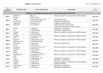 Rejestr rzeczoznawców Nr legitymacji Rzeczoznawcy Nazwisko i imię Adres zamieszkania stan - 01 listopada 2016 Specjalność Nr uprawnień Okręgowy Ośrodek Rzeczoznawstwa i Doradztwa SITR OLSZTYN 001/11 002/11 004/11 005/11 006/11 007/11 008/11 009/11 010/11 011/11 012/11 013/11 014/11 015/11 Borkowski Roman Dubas Jan, Wiesław Grabowski Kazimierz Słupy 16 10-381 Olsztyn ul. Wyczółkowskiego 39/2 58-500 Jelenia Góra ul Karnickiej 14 10-772 Olsztyn Grycko Jan Jaroniec Marian Jacuński Karol Frąszczak Zbigniew, Jerzy Kowalczyk Paweł Kozłowski Mirosław Płoski Marek Napiórkowski Jerzy Prejs Barbara Potapiuk Alfred Przestrzelski Marian ul. Makowa 8 11-010 Barczewo ul. Brzozowa 4 13-230 Lidzbark ul. 1-Maja 35 m 29 14-202 Iława ul. Warszawska 5A/15 11-040 Dobre Miasto ul. Herdera 4/5 10-691 Olsztyn ul. Jeziołowicza 15 m 10 10-690 Olsztyn ul. Klonowa 2 13-200 Działdowo ul. Iwaszkiewicza 30/15 10-089 Olsztyn ul. Piłsudskiego 3A/7 14-100 Ostróda ul. Rataja 5/12 13-100 Nidzica ul. Malinowa 13 11-001 Dywity Maszyny, urządzenia, wyposażenie i środki transportu. Energia odnawialna; Organizacja i zarządzanie. Produkcja i hodowla roślin; Chemia rolnicza i ochrona roślin; Środowisko naturalne, przyroda i łowiectwo. Organizacja i zarządzanie; Ekonomika i rachunkowość. Maszyny, urządzenia, wyposażenie i środki transportu. Maszyny, urządzenia, wyposażenie i środki transportu. Maszyny, urządzenia, wyposażenie i środki transportu. Inwestycje i budownictwo. Maszyny, urządzenia, wyposażenie i środki transportu. Maszyny, urządzenia, wyposażenie i środki transportu. Maszyny, urządzenia, wyposażenie i środki transportu. Organizacja i zarządzanie; Ekonomika i rachunkowość. Maszyny, urządzenia, wyposażenie i środki transportu; Energia odnawialna. Organizacja i zarządzanie; Ekonomika i rachunkowość. 1/OL/2011 2/OL/2011 4/OL/2011 5/OL/2011 6/OL/2011 7/OL/2011 8/OL/2011 9/OL/2011 10/OL/2011 11/OL/2011 12/OL/2011 13/OL/2011 14/OL/2011 15/OL/2011 1 017/11 018/11 021/11 022/11 024/11 245/12 276 /13 277 /13 278 /13 279/13 280/13 281/13 282/13 283/13 288/14 Skwarzec Stanisław Sańko Witold ul. Wrzosowa 5/1 11-015 Olsztynek Marcinkowo 56 11-700 Mrągowo Tatarczuk Władysław Wacewicz Wojciech Zysk Zbigniew Brandt Barbara ul. Staszica 5 14-500 Braniewo ul. Pawła Sowy 14, Kieźliny 10-371 Olsztyn-Dywity ul. Żeromskiego 23A 10-354 Olsztyn ul. Płk. Dobka 100/II/15 82-300 Elbląg Bieniek Arkadiusz Janusz Piotr ul. Olszewskiego 5 10-757 Olsztyn ul. Kopernika 3/8 13-100 Nidzica Kłębukowski Grzegorz Krzebietke Sławomir ul. Dworcowa 71/27 10-437 Olsztyn ul. W. Witosa 1i/13 10-688 Olsztyn Kwit Krystian Markuszewski Bogumił Sowiński Paweł Mićko Jerzy Marcinkowski Tadeusz Gnęcla 2 11-230 Bisztynek Tuszewo 94 14-260 Lubawa ul. Naterska 11 11-036 Gronity Kłębowo 66 11-100 Lidzbark Warmiński Ul. Leśmiana 9/0 82-300 Elbląg Maszyny, urządzenia, wyposażenie i środki transportu. Organizacja i zarządzanie; Ekonomika i rachunkowość; Dywersyfikacja działalności i kapitału. Maszyny, urządzenia, wyposażenie i środki transportu. Organizacja i zarządzanie; Ekonomika i rachunkowość. Inwestycje i budownictwo. Produkcja i hodowla roślin; Środowisko naturalne, przyroda i łowiectwo; Ekonomika i rachunkowość. Środowisko naturalne, przyroda i łowiectwo; Chemia rolnicza i ochrona roślin. Produkcja i hodowla roślin; Środowisko naturalne, przyroda i łowiectwo; Chemia rolnicza i ochrona roślin. Środowisko naturalne, przyroda i łowiectwo. 17/OL/2011 18/OL/2011 21/OL/2011 22/OL/2011 24/OL/2011 245/OL/2012 276/OL/2013 277/OL/2013 278/OL/2013 Środowisko naturalne, przyroda i łowiectwo; Chemia rolnicza i ochrona roślin; Produkcja i hodowla roślin. Chemia rolnicza i ochrona roślin. 279/OL/2013 Chemia rolnicza i ochrona roślin; Produkcja i hodowla roślin. Środowisko naturalne, przyroda i łowiectwo. 281/OL/2013 Energia odnawialna. 283/OL/2013 Chemia rolnicza i ochrona roślin; Środowisko naturalne, przyroda i łowiectwo. 280/OL/2013 282/OL/2013 288//OL/2014 2 Osiński Andrzej Ul. Osiedlowa 12/4 82-335 Gronowo Elbląskie 290/14 Terlikowski Jerzy Ul. Chopina 2m1 82-300 Elbląg 291/14 Terlikowska Krystyna Ul. Chopina 2m1 82-300 Elbląg 292/14 Liziński Tadeusz Gronowo Górne Ul. Rusinowa 1/6 82-300 Elbląg Zwierzewo 74 14-100 Ostróda 289/14 301/14 Szczyglak Piotr Organizacja i zarządzanie; Produkcja i hodowla roślin; Chów i hodowla zwierząt; Ekonomika i rachunkowość. Produkcja i hodowla roślin; Środowisko naturalne, przyroda i łowiectwo; Chemia rolnicza i ochrona roślin. Produkcja i hodowla roślin; Środowisko naturalne, przyroda i łowiectwo; Chów i hodowla zwierząt. Organizacja i zarządzanie; Produkcja i hodowla roślin. Maszyny, urządzenia, wyposażenie i środki transportu. 289/OL/2014 290/OL/2014 291/OL/2014 292/OL/2014 301/OL/2014 Okręgowy Ośrodek Rzeczoznawstwa i Doradztwa Technicznego SITR WROCŁAW 028/11 Gleba Janusz Gorzelany Piotr Chełstówek 22A 56-416 Twardogóra ul. Powstańców Śląskich 120 m 41 53-333 Wrocław 029/11 030/11 032/11 033/11 034/11 035/11 Huczyński Bogusław Jakubowski Bartłomiej Karczewski Maciej Kiestra Daniel Klonowski Tomisław ul. Pugeta 14/1 51-628 Wrocław ul. Zdrojowa 16/14/4 57-350 Kudowa Zdrój ul. Bł. E.Stein 12/2 50-322 Wrocław 48-321 Niwnica 23 Smardzów 76 56-400 Oleśnica Produkcja i hodowla roślin; Maszyny, urządzenia wyposażenie i środki transportu. Produkcja i hodowla roślin; Chemia rolnicza i ochrona roślin; Środowisko naturalne, przyroda i łowiectwo; Maszyny, urządzenia, wyposażenie i środki transportu; Systemy jakości produkcji żywności. Produkcja i hodowla roślin; Środowisko naturalne, przyroda, łowiectwo. Środowisko naturalne, przyroda, łowiectwo. Produkcja i hodowla roślin; Środowisko naturalne, przyroda, łowiectwo. Ekonomika i rachunkowość; Organizacja i zarządzanie. Produkcja i hodowla roślin; Chów i hodowla zwierząt; Środowisko naturalne, przyroda, łowie