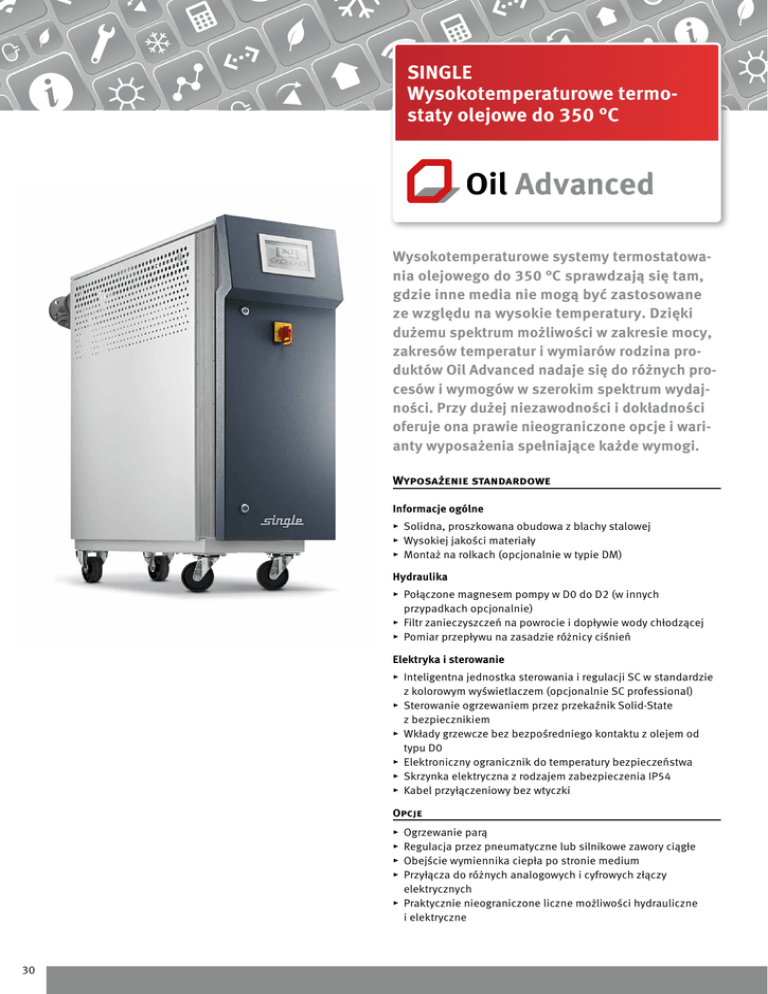 i SINGLE Wysokotemperaturowe termostaty olejowe do 350 °C i Oil Advanced Wysokotemperaturowe systemy termostatowania olejowego do 350 °C sprawdzają się tam, gdzie inne media nie mogą być zastosowane ze względu na wysokie temperatury. Dzięki dużemu spektrum możliwości w zakresie mocy, zakresów temperatur i wymiarów rodzina produktów Oil Advanced nadaje się do różnych procesów i wymogów w szerokim spektrum wydajności. Przy dużej niezawodności i dokładności oferuje ona prawie nieograniczone opcje i warianty wyposażenia spełniające każde wymogi. Wyposażenie standardowe Informacje ogólne ▸ Solidna, proszkowana obudowa z blachy stalowej ▸ Wysokiej jakości materiały ▸ Montaż na rolkach (opcjonalnie w typie DM) Hydraulika ▸ Połączone magnesem pompy w D0 do D2 (w innych przypadkach opcjonalnie) ▸ Filtr zanieczyszczeń na powrocie i dopływie wody chłodzącej ▸ Pomiar przepływu na zasadzie różnicy ciśnień Elektryka i sterowanie ▸ Inteligentna jednostka sterowania i regulacji SC w standardzie z kolorowym wyświetlaczem (opcjonalnie SC professional) ▸ Sterowanie ogrzewaniem przez przekaźnik Solid-State z bezpiecznikiem ▸ Wkłady grzewcze bez bezpośredniego kontaktu z olejem od typu D0 ▸ Elektroniczny ogranicznik do temperatury bezpieczeństwa ▸ Skrzynka elektryczna z rodzajem zabezpieczenia IP54 ▸ Kabel przyłączeniowy bez wtyczki Opcje ▸ ▸ ▸ ▸ Ogrzewanie parą Regulacja przez pneumatyczne lub silnikowe zawory ciągłe Obejście wymiennika ciepła po stronie medium Przyłącza do różnych analogowych i cyfrowych złączy elektrycznych ▸ Praktycznie nieograniczone liczne możliwości hydrauliczne i elektryczne 30 i Kontrola poziomu Czujnik temperatury Wymiennik ciepła Zbiornik T T Zbiornik odgazowujący Czujnik temperatury T Powrót Zawór magnetyczny chłodzenia Podgrzewacz T Pompa Czujnik temperatury Dopływ Separator zanieczyszczeń Odpływ wody chłodzącej Separator zanieczyszczeń Przepływomierz Dopływ wody chłodzącej Oil Advanced Podzespół D1 D2 D3 D4 D5 Maks. zakres temperatury °C 300 300/350 300/350 300/350 300/350 Maks. pojemność zewn. l 16 86/66 157/121 142/106 92/65 Moc grzewcza kW 9/20 9/18/27/36 36/54 36/72/108 72/108/144 Moc chłodzenia (150 °C dopływ/15 °C woda chłodząca) kW 50 50/116 116 116/232 116/232 Maks. wydajność pompy l/min 60/80* 100/150*/180* 360/325*/340* 530/550*/600* 1050/1080*/950* Maks. ciśnienie tłoczne (maks. wartości charakterystyki) bar 6/11* 8/11* 4,2/4,8*/5,8* 4,2/4,7*/6,2* 3,5/4,5*/6,2 Moc silników pomp kW 1/2,8* 2,8/4* 3/4*/5,5* 4/5,5*/7,5* 5,5/7,5*/11* Zewnętrzna objętość medium Przyłącze wody chłodzącej Wewnętrzna objętość Wymiary (bez przyłączy) Ciężar ok * Pompa specjalna G 1/2" AG AD 28-L DN 32 DN 40 DN 65 GZ G 3/8" bis G 1/2" G 1/2" G 1/2" G 1/2" l 8 22 40 55 105 D mm 805 1125 1330 1780 1925 S mm 345 395 580 730 730 W mm 970 1210 1680 1780 2230 kg 120 225 460 650 900 Zmiany techniczne zastrzeżone 31