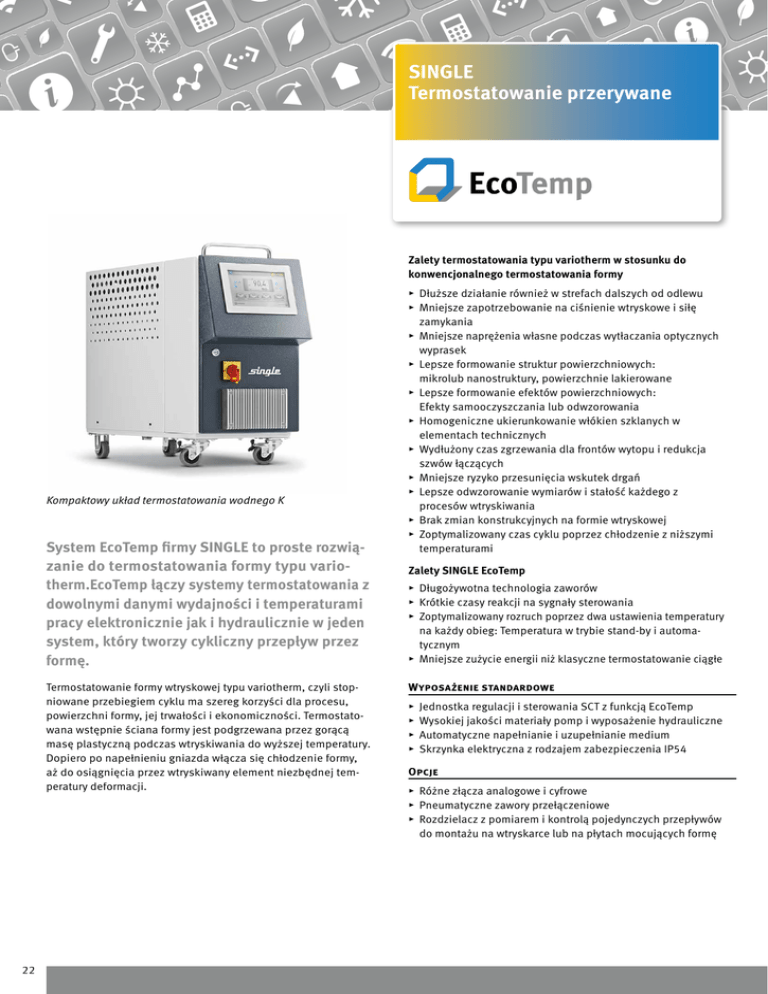 i i SINGLE Termostatowanie przerywane Zalety termostatowania typu variotherm w stosunku do konwencjonalnego termostatowania formy Kompaktowy układ termostatowania wodnego K System EcoTemp firmy SINGLE to proste rozwiązanie do termostatowania formy typu variotherm.EcoTemp łączy systemy termostatowania z dowolnymi danymi wydajności i temperaturami pracy elektronicznie jak i hydraulicznie w jeden system, który tworzy cykliczny przepływ przez formę. Termostatowanie formy wtryskowej typu variotherm, czyli stopniowane przebiegiem cyklu ma szereg korzyści dla procesu, powierzchni formy, jej trwałości i ekonomiczności. Termostatowana wstępnie ściana formy jest podgrzewana przez gorącą masę plastyczną podczas wtryskiwania do wyższej temperatury. Dopiero po napełnieniu gniazda włącza się chłodzenie formy, aż do osiągnięcia przez wtryskiwany element niezbędnej temperatury deformacji. 22 ▸ Dłuższe działanie również w strefach dalszych od odlewu ▸ Mniejsze zapotrzebowanie na ciśnienie wtryskowe i siłę zamykania ▸ Mniejsze naprężenia własne podczas wytłaczania optycznych wyprasek ▸ Lepsze formowanie struktur powierzchniowych: mikrolub nanostruktury, powierzchnie lakierowane ▸ Lepsze formowanie efektów powierzchniowych: Efekty samooczyszczania lub odwzorowania ▸ Homogeniczne ukierunkowanie włókien szklanych w elementach technicznych ▸ Wydłużony czas zgrzewania dla frontów wytopu i redukcja szwów łączących ▸ Mniejsze ryzyko przesunięcia wskutek drgań ▸ Lepsze odwzorowanie wymiarów i stałość każdego z procesów wtryskiwania ▸ Brak zmian konstrukcyjnych na formie wtryskowej ▸ Zoptymalizowany czas cyklu poprzez chłodzenie z niższymi temperaturami Zalety SINGLE EcoTemp ▸ Długożywotna technologia zaworów ▸ Krótkie czasy reakcji na sygnały sterowania ▸ Zoptymalizowany rozruch poprzez dwa ustawienia temperatury na każdy obieg: Temperatura w trybie stand-by i automatycznym ▸ Mniejsze zużycie energii niż klasyczne termostatowanie ciągłe Wyposażenie standardowe ▸ ▸ ▸ ▸ Jednostka regulacji i sterowania SCT z funkcją EcoTemp Wysokiej jakości materiały pomp i wyposażenie hydrauliczne Automatyczne napełnianie i uzupełnianie medium Skrzynka elektryczna z rodzajem zabezpieczenia IP54 Opcje ▸ Różne złącza analogowe i cyfrowe ▸ Pneumatyczne zawory przełączeniowe ▸ Rozdzielacz z pomiarem i kontrolą pojedynczych przepływów do montażu na wtryskarce lub na płytach mocujących formę i Sposób działania EcoTemp Systemy termostatowania dla EcoTemp EcoTemp steruje czas startu i zatrzymania przepływu medium chłodzącego za pomocą zależnych od cyklu sygnałów wtryskarki. W fazie wtryskiwania przez formę nie jest tłoczone medium chłodzące. Wskutek ciepła tworzywa sztucznego wzrasta temperatura na ścianie formy. W fazie wtryskiwania przez formę nie jest tłoczone medium termostatowania. Do zastosowania w EcoTemp nadają się wszystkie systemy termostatowania firmy SINGLE. W praktyce najczęściej stosowane są lekkie i kompaktowe systemy wodne do temperatur do 90 °C lub 150 °C. Temperatura medium chłodzącego jest regulowana. Ze względu na cykliczny przepływ EcoTemp może chłodzić nawet z mniejszymi temperaturami medium niż konwencjonalne urządzenie ze stałą temperaturą. Testy praktyczne pokazały, że EcoTemp osiąga optymalizacje czasu cyklu przeważnie w dwucyfrowym zakresie procentowym przy co najmniej takiej samej jakości wypraski. EcoTemp pracuje powtarzalnie i niezawodnie oraz jest łatwy w obsłudze. EcoTemp z wkładami formowymi dla chłodzenia przy zarysach Warunkiem dla optymalnej wydajności i ekonomiczności EcoTemp są formy z korzystnymi właściwościami przewodzeni ciepła, dobrym przenoszeniem ciepła do gniazda oraz niewielką masą do termostatowania. Aby ograniczyć tą masę często teromostatowane są tylko małe wkłady. Mogą być one tworzone za pomocą generatywnej metody produkcji jak cięcie laserowe ze proszku stalowego w ten sposób, aby zawarte w niej kanały chłodzące były wzdłuż zarysu powierzchni i bardzo blisko chłodzonej ściany formy. EcoTemp może znacznie skrócić cykl wtryskiwania Temperatura formy Temperatura odkształcania brak przepływu Przepływ Standardowy czas chłodzenia Czas chłodzenia EcoTemp Skracanie czasu cyklu przez EcoTemp Czas Otwieranie formy Wyjmowanie wypraski Zamykanie formy Wtryskiwanie Utrzymanie ciśnienia Otwieranie formy (EcoTemp) Otwieranie formy (konwencjonalne) 23