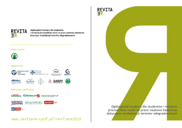 Ogólnopolski konkurs dla studentów i młodych pracowników nauki na prace naukowo badawcze dotyczące rewitalizacji terenów zdegradowanych Zapewniamy Atrakcyjne nagrody, promocję laureatów Ogólnopolski konkurs dla studentów i młodych pracowników nauki na prace naukowo badawcze dotyczące rewitalizacji terenów zdegradowanych REVITARE ma zwrócić uwagę młodych ludzi na tereny zdegradowane w procesie industrializacji i urbanizacji. Do udziału w konkursie zapraszamy studentów i młodych pracowników nauki, których interesuje proces rewitalizacji terenów zdegradowanych. REVITARE to konkurs dla osób, które chcą skonfrontować swoje dotychczasowe osiągnięcia z dokonaniami innych, będących na podobnym etapie rozwoju zawodowego, a jednocześnie podnieść swoją wartość na rynku pracy. Prace konkursowe mogą uwzględniać następujące aspekty odnowy terenów zdegradowanych: Udział i prezentację nagrodzonych prac na VII Międzynarodowej Konferencji „Innowacyjne Rozwiązania Rewitalizacji Terenów Zdegradowanych” Publikację 5 nagrodzonych prac w monografii Wstępne zgłoszenie udziału w konkursie do 30 kwietnia 2013 r. za pośrednictwem strony internetowej Prace konkursowe powinny zostać przesłane do 31 maja 2013 r. Regulamin i szczegółowe informacje dostępne są na stronie internetowej: www.revitare-conf.pl/revitare2013 Zgłoś się do Konkursu REVITARE Wygraj udział w Konferencji i atrakcyjne nagrody
