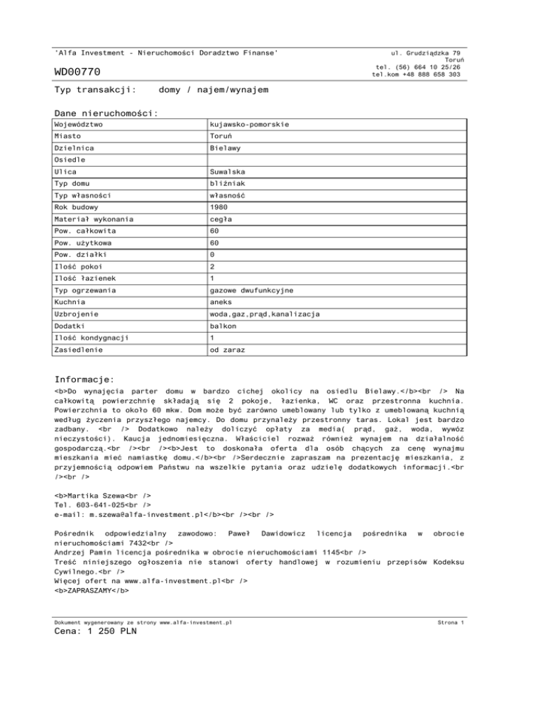 'Alfa Investment - Nieruchomości Doradztwo Finanse' WD00770 Typ transakcji: ul. Grudziądzka 79 Toruń tel. (56) 664 10 25/26 tel.kom +48 888 658 303 domy / najem/wynajem Dane nieruchomości: Województwo kujawsko-pomorskie Miasto Toruń Dzielnica Bielawy Osiedle Ulica Suwalska Typ domu bliźniak Typ własności własność Rok budowy 1980 Materiał wykonania cegła Pow. całkowita 60 Pow. użytkowa 60 Pow. działki 0 Ilość pokoi 2 Ilość łazienek 1 Typ ogrzewania gazowe dwufunkcyjne Kuchnia aneks Uzbrojenie woda,gaz,prąd,kanalizacja Dodatki balkon Ilość kondygnacji 1 Zasiedlenie od zaraz Informacje: <b>Do wynajęcia parter domu w bardzo cichej okolicy na osiedlu Bielawy.</b><br /> Na całkowitą powierzchnię składają się 2 pokoje, łazienka, WC oraz przestronna kuchnia. Powierzchnia to około 60 mkw. Dom może być zarówno umeblowany lub tylko z umeblowaną kuchnią według życzenia przyszłego najemcy. Do domu przynależy przestronny taras. Lokal jest bardzo zadbany. <br /> Dodatkowo należy doliczyć opłaty za media( prąd, gaż, woda, wywóz nieczystości). Kaucja jednomiesięczna. Właściciel rozważ również wynajem na działalność gospodarczą.<br /><br /><b>Jest to doskonała oferta dla osób chących za cenę wynajmu mieszkania mieć namiastkę domu.</b><br />Serdecznie zapraszam na prezentację mieszkania, z przyjemnością odpowiem Państwu na wszelkie pytania oraz udzielę dodatkowych informacji.<br /><br /> <b>Martika Szewa<br /> Tel. 603-641-025<br /> e-mail: [email protected]</b><br /><br /> Pośrednik odpowiedzialny zawodowo: Paweł Dawidowicz licencja pośrednika w obrocie nieruchomościami 7432<br /> Andrzej Pamin licencja pośrednika w obrocie nieruchomościami 1145<br /> Treść niniejszego ogłoszenia nie stanowi oferty handlowej w rozumieniu przepisów Kodeksu Cywilnego.<br /> Więcej ofert na www.alfa-investment.pl<br /> <b>ZAPRASZAMY</b> Dokument wygenerowany ze strony www.alfa-investment.pl Cena: 1 250 PLN Strona 1