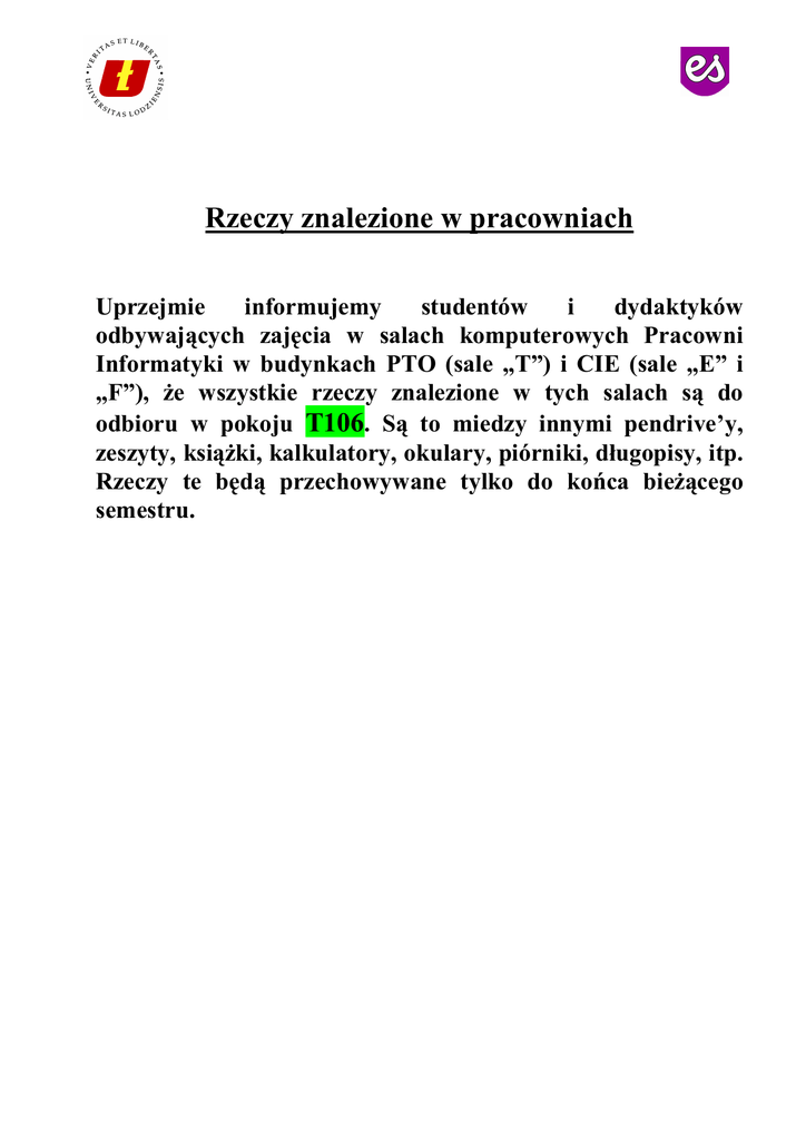 Rzeczy znalezione w pracowniach Uprzejmie informujemy studentów i dydaktyków odbywających zajęcia w salach komputerowych Pracowni Informatyki w budynkach PTO (sale „T”) i CIE (sale „E” i „F”), że wszystkie rzeczy znalezione w tych salach są do odbioru w pokoju T106. Są to miedzy innymi pendrive’y, zeszyty, książki, kalkulatory, okulary, piórniki, długopisy, itp. Rzeczy te będą przechowywane tylko do końca bieżącego semestru.