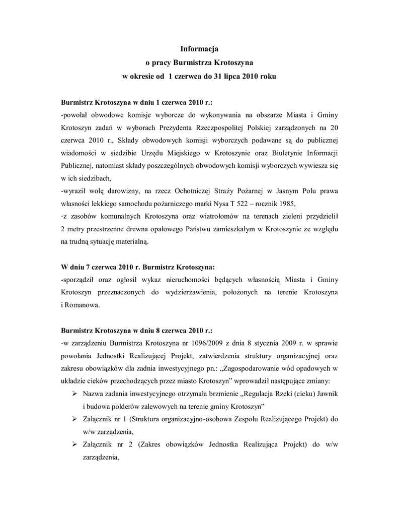 Informacja o pracy Burmistrza Krotoszyna w okresie od 1 czerwca