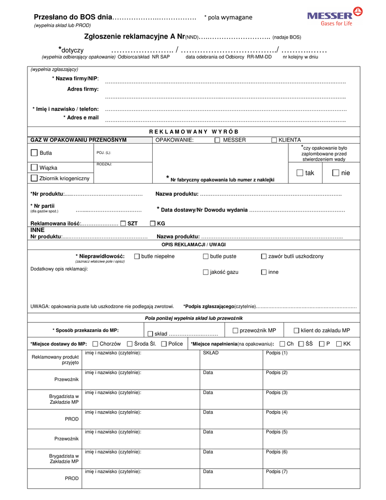 Przesłano do BOS dnia………………..……………. * pola wymagane (wypełnia skład lub PROD) Zgłoszenie reklamacyjne A Nr(NND)…..…………………….. (nadaje BOS) *dotyczy ………………….. / ……………………………../ ………..…… (wypełnia odbierający opakowanie) Odbiorca/skład NR SAP data odebrania od Odbiorcy RR-MM-DD nr kolejny w dniu (wypełnia zgłaszający) * Nazwa firmy/NIP: ……………………………..………………………………………………………………………………….……. Adres firmy: ………………………………………………………..…………………………………………………………….. * Imię i nazwisko / telefon: ………………………………………………………………………………………………………………………. * Adres e mail ………………………………………………………………………………………………………..…………….. REKLAMOWANY WYRÓB GAZ W OPAKOWANIU PRZENOŚNYM OPAKOWANIE: MESSER KLIENTA *czy opakowanie było Butla POJ. (L): zaplombowane przed stwierdzeniem wady RODZAJ: Wiązka tak * Nr fabryczny opakowania lub numer z naklejki Zbiornik kriogeniczny nie *Nr produktu:.....…………….…………………… Nazwa produktu: …………………………………………………………………….. * Nr partii * Data dostawy/Nr Dowodu wydania ……………………………………………… (dla gazów spoż.) ….....………………………… Reklamowana ilość:………………… SZT KG INNE Nr produktu:.....…………….………………………. Nazwa produktu: …………………………………………………………………….. OPIS REKLAMACJI / UWAGI * Nieprawidłowość: butle niepełne butle puste zawór butli uszkodzony jakość gazu inne (zaznacz właściwe pole i opisz) Dodatkowy opis reklamacji: UWAGA: opakowania puste lub uszkodzone nie podlegają zwrotowi. *Podpis zgłaszającego(czytelnie)…….………………………………………………… Pola poniżej wypełnia skład lub przewoźnik * Sposób przekazania do MP: *Miejsce dostawy do MP: Reklamowany produkt przyjęto Chorzów skład ……………….……… Środa Śl. Police przewoźnik MP *Miejsce napełnienia(na opakowaniu): klient do zakładu MP Ch imię i nazwisko (czytelnie): SKŁAD Podpis (1) imię i nazwisko (czytelnie): Data Podpis (2) imię i nazwisko (czytelnie): Data Podpis (3) imię i nazwisko (czytelnie): Data Podpis (4) imię i nazwisko (czytelnie): Data Podpis (5) imię i nazwisko (czytelnie): Data Podpis (6) imię i nazwisko (czytelnie): Data Podpis (7) Przewoźnik Brygadzista w Zakładzie MP PROD Przewoźnik Brygadzista w Zakładzie MP PROD ŚŚ P KK