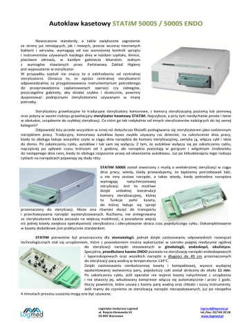 Autoklaw kasetowy STATIM 5000S / 5000S ENDO Nowoczesne standardy, a także zwiększone zagrożenie ze strony już istniejących, jak i nowych, jeszcze wczoraj nieznanych bakterii i wirusów, wymagają od nas wzmożonej kontroli sprzętu i instrumentów używanych każdego dnia w każdym szpitalu, klinice, placówce zdrowia, w każdym gabinecie lekarskim. Jednym z wymogów stawianych przez Paostwowy Zakład Higieny jest wyposażenie w sterylizator. W przypadku szpitali nie znaczy to o odchodzeniu od centralnej sterylizatorni. Oznacza to, że oprócz centralnej sterylizatorni odpowiedzialnej za przygotowywania instrumentarium potrzebnego do przeprowadzenia zaplanowanych operacji czy zabiegów, poszczególne gabinety, aby działad szybko i skutecznie, powinny dysponowad podręcznymi sterylizatorami używanymi w miarę potrzeby. Sterylizatory grawitacyjne to tradycyjne sterylizatory komorowe, z komorą sterylizacyjną poziomą lub pionową oraz jedyny w swoim rodzaju grawitacyjny sterylizator kasetowy STATIM. Najszybsze, a przy tym niesłychanie proste i tanie w obsłudze, urządzenie do szybkiej sterylizacji. Co różni go tak radykalnie od innych sterylizatorów należących do tej samej kategorii? Odpowiedź leży przede wszystkim w innej niż dotychczas filozofii posługiwania się sterylizatorem jako codziennym narzędziem pracy. Tradycyjny, komorowy autoklaw bywa zwykle używany raz dziennie, na zakooczenie dnia pracy, kiedy to obsługa ładuje wszystkie użyte w ciągu dnia narzędzia do komory sterylizacyjnej, zamyka ją, włącza cykl i idzie do domu. Po zakooczeniu cyklu, autoklaw i tak sam się wyłączy. Z tym, że autoklaw wyłączy się po zakooczeniu cyklu, najczęściej po upływie czasu krótszym od 1 godziny, ale narzędzia pozostają w gorącym i wilgotnym środowisku do następnego dnia rano, kiedy to obsługa rozpocznie pracę od otworzenia autoklawu. Już po kilkudziesięciu tego rodzaju cyklach na narzędziach pojawiają się ślady rdzy. STATIM 5000S został stworzony z myślą o wielokrotnej sterylizacji w ciągu dnia pracy, wtedy, kiedy przewidujemy, że będziemy potrzebowali taki, a nie inny zestaw narzędzi, a także wtedy, kiedy potrzebne narzędzia wymagają natychmiastowej sterylizacji. Jest to możliwe dzięki unikalnej konstrukcji komory sterylizacyjnej, której to funkcje pełni kaseta, do której ładuje się sprzęt przeznaczony do sterylizacji. Może ona również służyd do transportu i przechowywania narzędzi wysterylizowanych. Ruchoma, nie zintegrowana ze sterylizatorem kaseta pozwala na większą mobilnośd, a posiadanie więcej niż jednej kasety zwiększa operatywnośd sterylizatora i zdecydowanie skraca czas pojedyoczego cyklu. Dokompletowanie w kasety dodatkowe jest praktycznie standardem. STATIM pierwotnie był przeznaczony dla stomatologii, jednak dzięki zastosowaniu odpowiednich rozwiązao technologicznych stał się urządzeniem, które z powodzeniem można wykorzystad w szeroko pojętej medycynie ogólnej do sterylizacji narzędzi stosowanych w ginekologii, endoskopii, okulistyce. Specjalna, przedłużona kaseta ENDO pozwala na sterylizację narzędzi endoskopowych i laparoskopowych oraz wszelkich narzędzi o długości do 49 cm przeznaczonych do sterylizacji parą wodną w temperaturze 134°C. Dzięki zastosowaniu cienkościennej kasety i kompaktowej, wysoce wydajnej opatentowanej wytwornicy pary, pojedyoczy cykl został skrócony do około 11 min. Po zakooczeniu cyklu, jeśli operator nie wyjmie kasety natychmiast z urządzenia i nie otworzy jej, wbudowany kompresor włącza się automatycznie i przez 1 godz. tłoczy powietrze, które usuwa z kasety parę wodną oraz chłodzi i suszy instrumenty. Jeśli mamy do czynienia ze sterylizacją narzędzi niezapakowanych, już po niespełna 4 minutach procesu suszenia mogą one byd używane. Logistyka medyczna Logmed ul. Księcia Ziemowita 53 03-885 Warszawa [email protected] tel./fax: 22/744 20 28 www.logmed.pl Kolejnym, niezwykle ważnym parametrem, różniącym urządzenia STATIM od tradycyjnych autoklawów komorowych, jest zdolnośd usuwania z komory sterylizacyjnej powietrza. W autoklawie tradycyjnym, w momencie rozpoczęcia cyklu sterylizacji w komorze pozostaje do 35% nieusuniętego powietrza. Wiadomo, że powietrze, ze względu na swoje zdolności izolacyjne, jest gorszym o około 1000 razy przewodnikiem ciepła niż para i tam, gdzie jest powietrze, nie ma sterylizacji. Piętnaście procent zawartości powietrza w komorze sterylizacyjnej powoduje, że cykl sterylizacji wydłuża się dwukrotnie, a przy 30% nieusuniętego powietrza, może byd trzykrotnie dłuższy od planowanego. Obecnośd powietrza to nie tylko przedłużony proces sterylizacji, czy też brak sterylizacji, to także przyśpieszony proces rdzewienia. Kiedy dodamy do tego istnienie w komorze autoklawu tradycyjnego typowych, przegrzanych miejsc, w których temperatura sięga 180°C, jest zrozumiałe, dlaczego proces niszczenia instrumentarium sterylizowanego w takich warunkach może postępowad niezwykle szybko. Proces całego cyklu sterylizacji jest zapisywany na wydruku drukarki zintegrowanej będącej na wyposażeniu STATIM 5000S. Zapis odbywa się na papierze termicznym, a więc dającym możliwośd archiwizacji bez obawy o utratę danych. Wielkośd rolki papieru pozwala na potwierdzenie 80-ciu cykli. Sam przebieg cyklu jest również wyświetlany na wyświetlaczu ciekłokrystalicznym. Urządzenia STATIM zostały wyprodukowane zgodnie z obowiązującym stanem wiedzy i techniki, przy użyciu najlepszych materiałów i zapewniają lata rzetelnej, wydajnej i szybkiej realizacji procedur sterylizacyjnych, zgodnie z dyrektywami obowiązującymi w krajach Unii Europejskiej. Wymagania spełniane przez urządzenia to w szczególności: PN-EN 13060 – Norma Małe sterylizatory parowe PN-EN 61010-1 - Zasady bezpieczeostwa dla urządzeo laboratoryjnych - Częśd 1 Zasady ogólne. PN-EN 61010-2-041 - Wymagania bezpieczeostwa ele