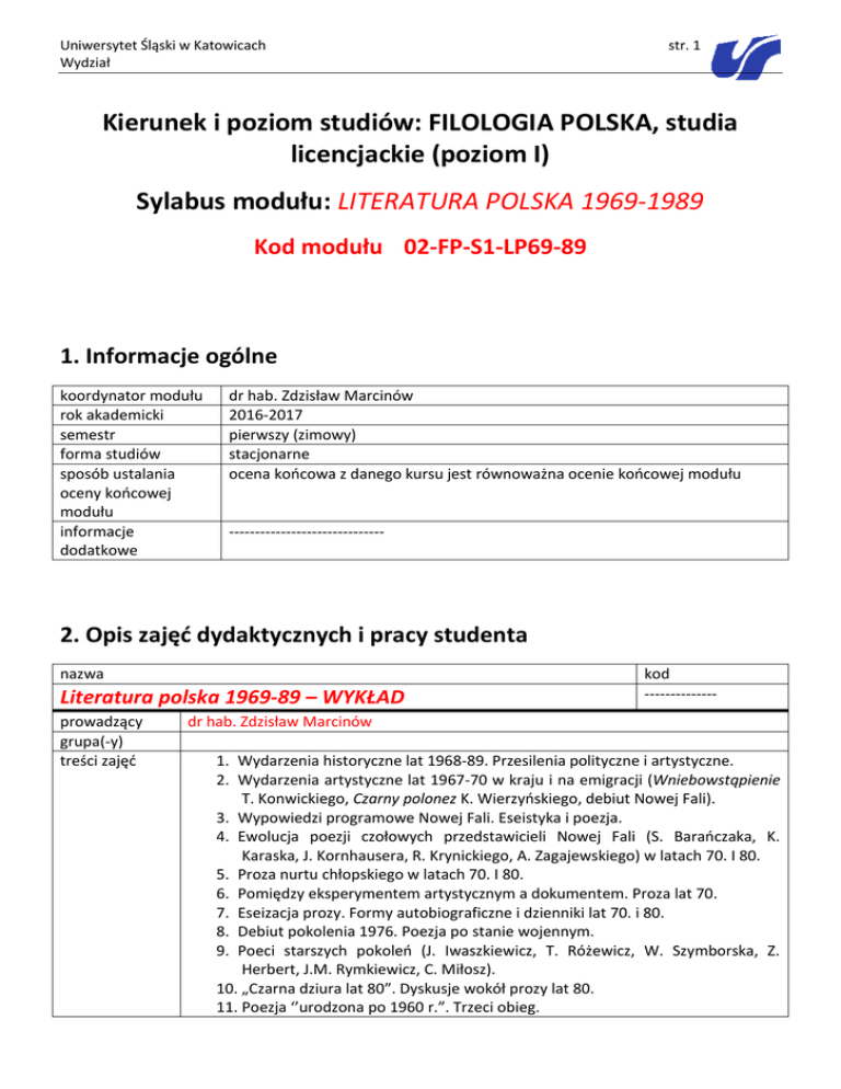 Uniwersytet Śląski w Katowicach Wydział str. 1 Kierunek i poziom studiów: FILOLOGIA POLSKA, studia licencjackie (poziom I) Sylabus modułu: LITERATURA POLSKA 1969-1989 Kod modułu 02-FP-S1-LP69-89 1. Informacje ogólne koordynator modułu rok akademicki semestr forma studiów sposób ustalania oceny końcowej modułu informacje dodatkowe dr hab. Zdzisław Marcinów 2016-2017 pierwszy (zimowy) stacjonarne ocena końcowa z danego kursu jest równoważna ocenie końcowej modułu ------------------------------ 2. Opis zajęć dydaktycznych i pracy studenta nazwa Literatura polska 1969-89 – WYKŁAD prowadzący grupa(-y) treści zajęć kod -------------- dr hab. Zdzisław Marcinów 1. Wydarzenia historyczne lat 1968-89. Przesilenia polityczne i artystyczne. 2. Wydarzenia artystyczne lat 1967-70 w kraju i na emigracji (Wniebowstąpienie T. Konwickiego, Czarny polonez K. Wierzyńskiego, debiut Nowej Fali). 3. Wypowiedzi programowe Nowej Fali. Eseistyka i poezja. 4. Ewolucja poezji czołowych przedstawicieli Nowej Fali (S. Barańczaka, K. Karaska, J. Kornhausera, R. Krynickiego, A. Zagajewskiego) w latach 70. I 80. 5. Proza nurtu chłopskiego w latach 70. I 80. 6. Pomiędzy eksperymentem artystycznym a dokumentem. Proza lat 70. 7. Eseizacja prozy. Formy autobiograficzne i dzienniki lat 70. i 80. 8. Debiut pokolenia 1976. Poezja po stanie wojennym. 9. Poeci starszych pokoleń (J. Iwaszkiewicz, T. Różewicz, W. Szymborska, Z. Herbert, J.M. Rymkiewicz, C. Miłosz). 10. „Czarna dziura lat 80”. Dyskusje wokół prozy lat 80. 11. Poezja ‘’urodzona po 1960 r.”. Trzeci obieg. Uniwersytet Śląski w Katowicach Wydział metody prowadzenia zajęć liczba godzin dydaktycznych (kontaktowych) liczba godzin pracy własnej studenta opis pracy własnej studenta organizacja zajęć literatura obowiązkowa str. 2 1/ wykłady (15 godz.) 15 Przygotowanie do zajęć i egzaminu, obejmujące zalecone lektury literackie i opracowania. Kurs obejmuje zajęcia o charakterze konwersatorium oraz dedykowany im wykład. Wymaga się udziału studenta w obu składowych kursu. PROZA 1. K. Brandys, Wariacje pocztowe. 2. W. Odojewski, Zasypie wszystko, zawieje. 3. T. Konwicki, Mała apokalipsa. 4. W. Myśliwski, Kamień na kamieniu. 5. E. Redliński, Konopielka. 6. H. Krall, Zdążyć przed Panem Bogiem. 7. J. M. Rymkiewicz, Rozmowy polskie latem 1983. 8. R. Kapuściński, Cesarz (BN). 9. H. Grynberg, Kadisz. 10. P. Huelle: Weiser Dawidek. POEZJA 1. S. Barańczak, Wiersze zebrane. 2. R. Krynicki, Wiersze wybrane. 3. A. Zagajewski, Wiersze wybrane. 4. E. Lipska, Utwory wybrane (1967–1984). 5. W. Szymborska, Wiersze wybrane. 6. R. Wojaczek, Utwory zebrane (wstęp T. Karpowicz) 7. A. Świrszczyńska, Jestem baba: wiersze z różnych lat. 8. J. Polkowski, Wiersze (1977–1984). 9. J. Twardowski, Wiersze wybrane. 10. S. Czycz, Wybór wierszy. 11. J. Kornhauser, 148 wierszy (1968–1979) lub Wiersze z lat osiemdziesiątych. 12. Określona epoka. Nowa Fala 1968-1993. Wiersze i komentarze. Oprac. T. Nyczek. DRAMAT 1. S. Mrożek, Emigranci. 2. T. Różewicz, Do piachu. OPRACOWANIA 1. Z. Jarosiński: Literatura lat 1945-1975. 2. A. Nasiłowska: Literatura okresu przejściowego 1975-1996. Uniwersytet Śląski w Katowicach Wydział literatura uzupełniająca str. 3 3. A. Legeżyńska, P. Śliwiński: Poezja polska po 1968 roku. 4. J. Głowiński, W. Tomasik: Powieść. W: Słownik literatury polskiej XX wieku. Red. A. Brodzka i in. Wrocław 1992. 5. J. Sławiński: Rzut oka na ewolucję poezji polskiej w latach 1956-1980. W: Tegoż: Teksty i teksty. Warszawa 1990, s. 95-120 (uwaga: artykuł ten jest tylko w tym I wydaniu!) lub w: Tegoż: Przypadki poezji. Kraków 2001, s. 306-334. 6. E. Balcerzan: Przygoda druga: żywioły prozy w PRL. W: Tegoż: Przygody człowieka książkowego (ogólne i szczególne). Warszawa 1990, s. 20-31. 1. T. Drewnowski: Literatura polska lat 1944-1989. Próba scalenia. Obiegi – wzorce - style. Kraków 2004. 2. P. Czapliński, P. Śliwiński: Literatura polska 1976-1998. Przewodnik po prozie i poezji. Kraków 1999. adres strony www zajęć informacje dodatkowe 3. Opis sposobów weryfikacji efektów kształcenia modułu nazwa LITERATURA POLSKA 1969-1989 – Wykład kod zajęć osoba przeprowadzająca weryfikację grupa wymagania merytoryczne kryteria oceny przebieg procesu weryfikacji informacje dodatkowe kod ------------------------- --------------------dr hab. Zdzisław Marcinów Egzamin będzie miał charakter ustny i będzie weryfikował znajomość zagadnień poruszanych na wykładzie, ćwiczeniach oraz wiedzy zdobytej podczas pracy własnej. Ocena końcowa kursu będzie wypadkową oceny z ćwiczeń i oceny z egzaminu. 2. Opis zajęć dydaktycznych i pracy studenta nazwa Literatura polska 1969-89 - ćwiczenia prowadzący grupa(-y) treści zajęć Kod -------------- dr hab. Beata Nowacka 1. „Próba porządkowania doświadczeń”: orientacje poetyckie i prozatorskie. 2. Poezja Pokolenia ‘68 (m.in. R. Krynicki, J. Kornhauser, E. Lipska, R. Wojaczek, A. Zagajewski). Uniwersytet Śląski w Katowicach Wydział metody prowadzenia zajęć liczba godzin dydaktycznych (kontaktowych) liczba godzin pracy własnej studenta opis pracy własnej studenta organizacja zajęć literatura obowiązkowa str. 4 3. Twórczość Stanisława Barańczaka. 4. M. Brandys: Wariacje pocztowe. 5. E. Redliński: Konopielka. 6. T. Różewicz: Do piachu. 7. R. Kapuściński: Cesarz. 8. J. M. Rymkiewicz, Rozmowy polskie latem 1983. 9. H. Grynberg: Kadisz. Ćwiczenia – 30 h 30 60 Przygotowanie do zajęć, obejmujące zalecone lektury literackie i krytycznoliterackie; udział w przygotowaniu referatu. Kurs obejmuje zajęcia o charakterze konwersatorium. Organizacja zajęć według harmonogramu. „Próba porządkowania doświadczeń”: orientacje poetyckie i prozatorskie. J. Sławiński: Rzut oka na ewolucję poezji polskiej w latach 1956-1980. W: Idem: Teksty i teksty. Warszawa 1990, s. 95-120. E. Balcerzan: Przygoda drug