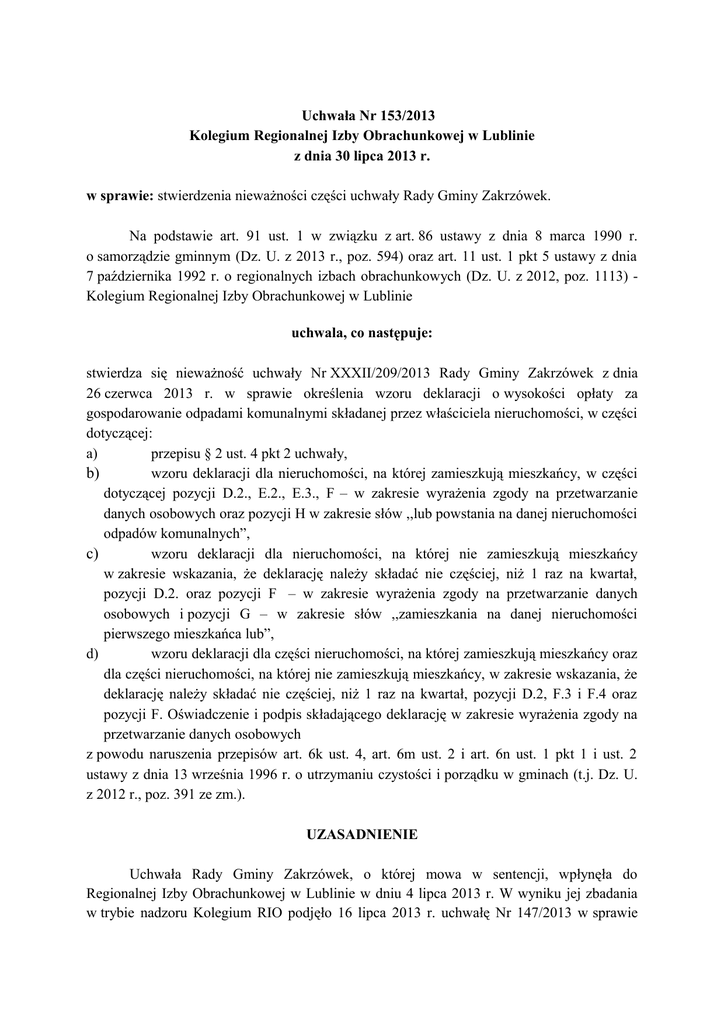 Uchwała Nr 153/2013 Kolegium Regionalnej Izby Obrachunkowej w Lublinie z dnia 30 lipca 2013 r. w sprawie: stwierdzenia nieważności części uchwały Rady Gminy Zakrzówek. Na podstawie art. 91 ust. 1 w związku z art. 86 ustawy z dnia 8 marca 1990 r. o samorządzie gminnym (Dz. U. z 2013 r., poz. 594) oraz art. 11 ust. 1 pkt 5 ustawy z dnia 7 października 1992 r. o regionalnych izbach obrachunkowych (Dz. U. z 2012, poz. 1113) Kolegium Regionalnej Izby Obrachunkowej w Lublinie uchwala, co następuje: stwierdza się nieważność uchwały Nr XXXII/209/2013 Rady Gminy Zakrzówek z dnia 26 czerwca 2013 r. w sprawie określenia wzoru deklaracji o wysokości opłaty za gospodarowanie odpadami komunalnymi składanej przez właściciela nieruchomości, w części dotyczącej: a) przepisu § 2 ust. 4 pkt 2 uchwały, b) wzoru deklaracji dla nieruchomości, na której zamieszkują mieszkańcy, w części dotyczącej pozycji D.2., E.2., E.3., F – w zakresie wyrażenia zgody na przetwarzanie danych osobowych oraz pozycji H w zakresie słów ,,lub powstania na danej nieruchomości odpadów komunalnych”, c) wzoru deklaracji dla nieruchomości, na której nie zamieszkują mieszkańcy w zakresie wskazania, że deklarację należy składać nie częściej, niż 1 raz na kwartał, pozycji D.2. oraz pozycji F – w zakresie wyrażenia zgody na przetwarzanie danych osobowych i pozycji G – w zakresie słów ,,zamieszkania na danej nieruchomości pierwszego mieszkańca lub”, d) wzoru deklaracji dla części nieruchomości, na której zamieszkują mieszkańcy oraz dla części nieruchomości, na której nie zamieszkują mieszkańcy, w zakresie wskazania, że deklarację należy składać nie częściej, niż 1 raz na kwartał, pozycji D.2, F.3 i F.4 oraz pozycji F. Oświadczenie i podpis składającego deklarację w zakresie wyrażenia zgody na przetwarzanie danych osobowych z powodu naruszenia przepisów art. 6k ust. 4, art. 6m ust. 2 i art. 6n ust. 1 pkt 1 i ust. 2 ustawy z dnia 13 września 1996 r. o utrzymaniu czystości i porządku w gminach (t.j. Dz. U. z 2012 r., poz. 391 ze zm.). UZASADNIENIE Uchwała Rady Gminy Zakrzówek, o której mowa w sentencji, wpłynęła do Regionalnej Izby Obrachunkowej w Lublinie w dniu 4 lipca 2013 r. W wyniku jej zbadania w trybie nadzoru Kolegium RIO podjęło 16 lipca 2013 r. uchwałę Nr 147/2013 w sprawie 2 wszczęcia postępowania nadzorczego w celu stwierdzenia nieważności części ocenianej uchwały uznając, że jej postanowienia w istotny sposób naruszają prawo. Badaną uchwałą Rada Gminy ustaliła wzór deklaracji określony załącznikiem do uchwały o wysokości opłaty za gospodarowanie odpadami komunalnymi składanej przez właścicieli nieruchomości, odrębnie: dla nieruchomości, na której zamieszkują mieszkańcy, dla części nieruchomości, na której zamieszkują mieszkańcy oraz dla części nieruchomości, na której nie zamieszkują mieszkańcy (zwanej dalej mieszaną) i dla nieruchomości, na której nie zamieszkują mieszkańcy. W § 2 ust. 4 pkt 2 uchwały Rada Gminy zobowiązała właścicieli nieruchomości, na której nie zamieszkują mieszkańcy do dołączenia, w przypadku zawieszenia działalności lub likwidacji działalności, dokumentu potwierdzającego ten fakt. Określając taki dokument Rada Gminy w istotny sposób przekroczyła delegację zawartą w art. 6n ust. 2 ustawy z dnia 13 września 1996r. o utrzymaniu czystości i porządku w gminach (t.j. Dz. U. z 2012 r., poz. 391 ze zm.), który daje radzie gminy prawo określenia wykazu dokumentów, którymi składający deklarację o wysokości opłaty za gospodarowanie odpadami komunalnymi będzie mógł potwierdzić dane zawarte w tej deklaracji. Udokumentowanie faktu zawieszenia lub likwidacji działalności w oczywisty sposób nie potwierdza i nie dotyczy danych objętych deklaracją przeznaczoną dla właścicieli nieruchomości niezamieszkałych. Identyczny zarzut należy postawić też wobec zapisów powtarzających się we wszystkich deklaracjach, a zobowiązujących właściciela nieruchomości do określenia sposobu magazynowania odpadów (poz. D.2.): pojemniki przeznaczone wyłącznie dla nie więcej niż dwóch lokali mieszkalnych (np. budynki jednorodzinne), boks śmietnikowy, altana śmietnikowa , plac (np. budynki wielorodzinne), adres, lokalizacja boksu, altany, placu. Nałożony na właściciela nieruchomości wymóg wskazania powyższych informacji nie ma związku z koniecznością uwzględnienia przy określaniu wzoru deklaracji o wysokości opłaty za gospodarowanie odpadami zapewnienia prawidłowego obliczenia opłaty przez składającego deklarację, ani z ułatwieniem jej składania, do czego radę gminy obligują postanowienia art. 6n ust.1 pkt 1 ustawy o utrzymaniu czystości i porządku w gminach. Niezgodne z prawem jest także – znajdujące się w nagłówkach deklaracji dla właścicieli nieruchomości mieszanych i niezamieszkałych (poz. Termin składania deklaracji) – postanowienie Rady Gminy o obowiązku składania deklaracji w terminie 14 dni od dnia, w którym nastąpiły zmiany danych określonych w deklaracji, nie częściej niż 1 raz na kwartał. Zapis ten nie znajduje oparcia w przepisie art. 6m ust. 2 ustawy, z którego wynika, że w przypadku zmiany danych, właściciel nieruchomości jest obowiązany złożyć deklarację w terminie 14 dni od dnia nastąpienia zmiany, a opłatę w zmienionej wysokości uiścić za miesiąc, w którym nastąpiła zmiana. Pominięto przy tym termin złożenia deklaracji od dnia zamieszkania na danej nieruchomości pierwszego mieszkańca lub powstania na danej nieruchomości odpadów komunalnych (zgodnie z art. 6m ust. 1), ograniczając się do podania terminu złożenia deklaracji od dnia, w którym nastąpiły zmiany danych będących podstawą ustalenia wysokości należnej opłaty za gospodarowanie odpadami komunalnymi lub określonej w deklaracji ilości odpadów komunalnych (zgodnie z art