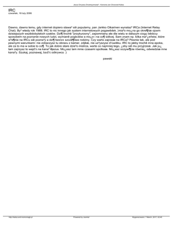 Jezus Chrystus Zmartwychwsta³ - Koinonia Jan Chrzciciel Kalisz IRC czwartek, 16 luty 2006 Dawno, dawno temu, gdy internet dopiero stawa³ siê popularny, pan Jarkko Oikarinen wynalaz³ IRCa (Internet Relay Chat). By³ wtedy rok 1988. IRC to nic innego jak system internetowych pogawêdek. ¦mia³o mo¿na go okre¶liæ ojcem dzisiejszych wszêdobylskich czatów. Dzi¶ trochê "przykurzony", zapomniany ale dla wielu w dalszym ci±gu bêd±cy sposobem na poznanie nowych ludzi, wymianê pogl±dów a mo¿e i na co¶ wiêcej. Sam znam np. kilka ma³¿eñstw, które w³a¶nie na IRCu siê pozna³y a dzi¶ tworz± szczê¶liwe rodziny. Czy warto zajrzeæ na IRCa? Pewnie tak, ale pod pewnymi warunkami: nie zobaczysz tu obrazu z kamer, zdjêæ, nie us³yszysz d¼wiêku. IRC to jakby trochê inna epoka, ale za to ma w sobie to co¶. To jak dobre stare dzie³o mistrza, warte co najmniej tego, ¿eby siê mu przyjrzeæ. Jak ju¿ tam zajrzysz to wejd¼ na kana³ #jezus. Mo¿esz tam mnie czasami spotkaæ. Mo¿esz oczywi¶cie równie¿ odwiedziæ inne kana³y. Szukaj, poznawaj, b±d¼ odkrywc± :) pawski http://kalisz-arch.koinoniagb.pl Powered by Joomla! Wygenerowano: 7 March, 2017, 02:45