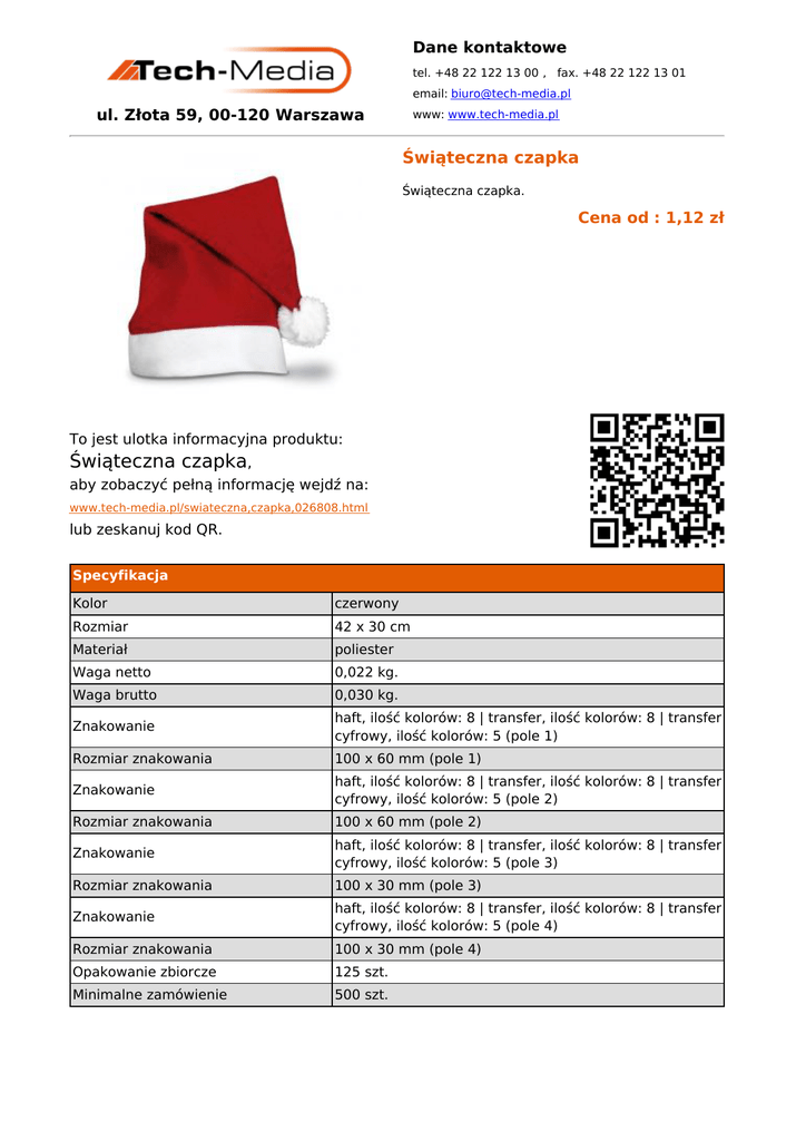 Dane kontaktowe tel. +48 22 122 13 00 , fax. +48 22 122 13 01 email: [email protected] ul. Złota 59, 00-120 Warszawa www: www.tech-media.pl Świąteczna czapka Świąteczna czapka. Cena od : 1,12 zł To jest ulotka informacyjna produktu: Świąteczna czapka, aby zobaczyć pełną informację wejdź na: www.tech-media.pl/swiateczna,czapka,026808.html lub zeskanuj kod QR. Specyfikacja Kolor czerwony Rozmiar 42 x 30 cm Materiał poliester Waga netto 0,022 kg. Waga brutto 0,030 kg. Znakowanie haft, ilość kolorów: 8 | transfer, ilość kolorów: 8 | transfer cyfrowy, ilość kolorów: 5 (pole 1) Rozmiar znakowania 100 x 60 mm (pole 1) Znakowanie haft, ilość kolorów: 8 | transfer, ilość kolorów: 8 | transfer cyfrowy, ilość kolorów: 5 (pole 2) Rozmiar znakowania 100 x 60 mm (pole 2) Znakowanie haft, ilość kolorów: 8 | transfer, ilość kolorów: 8 | transfer cyfrowy, ilość kolorów: 5 (pole 3) Rozmiar znakowania 100 x 30 mm (pole 3) Znakowanie haft, ilość kolorów: 8 | transfer, ilość kolorów: 8 | transfer cyfrowy, ilość kolorów: 5 (pole 4) Rozmiar znakowania 100 x 30 mm (pole 4) Opakowanie zbiorcze 125 szt. Minimalne zamówienie 500 szt.