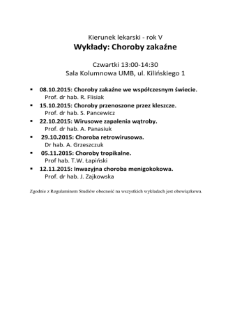 Kierunek lekarski - rok V Wykłady: Choroby zakaźne Czwartki 13:00-14:30 Sala Kolumnowa UMB, ul. Kilińskiego 1 08.10.2015: Choroby zakaźne we współczesnym świecie. Prof. dr hab. R. Flisiak 15.10.2015: Choroby przenoszone przez kleszcze. Prof. dr hab. S. Pancewicz 22.10.2015: Wirusowe zapalenia wątroby. Prof. dr hab. A. Panasiuk 29.10.2015: Choroba retrowirusowa. Dr hab. A. Grzeszczuk 05.11.2015: Choroby tropikalne. Prof hab. T.W. Łapiński 12.11.2015: Inwazyjna choroba menigokokowa. Prof. dr hab. J. Zajkowska Zgodnie z Regulaminem Studiów obecność na wszystkich wykładach jest obowiązkowa.