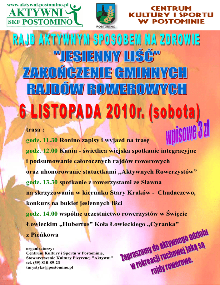 trasa : godz. 11.30 Ronino zapisy i wyjazd na trasę godz. 12.00 Kanin - świetlica wiejska spotkanie integracyjne i podsumowanie całorocznych rajdów rowerowych oraz uhonorowanie statuetkami „Aktywnych Rowerzystów” godz. 13.30 spotkanie z rowerzystami ze Sławna na skrzyżowaniu w kierunku Stary Kraków - Chudaczewo, konkurs na bukiet jesiennych liści godz. 14.00 wspólne uczestnictwo rowerzystów w Święcie Łowieckim „Hubertus” Koła Łowieckiego „Cyranka” z Pieńkowa organizatorzy: Centrum Kultury i Sportu w Postominie, Stowarzyszenie Kultury Fizycznej "Aktywni" tel. (59) 810-89-23 [email protected]