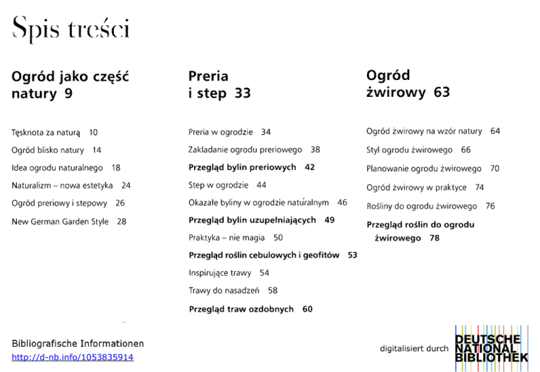 Spis treści Ogród jako część natury 9 Preria i step 33 Tęsknota za naturą Preria w ogrodzie Ogród blisko natury 10 Ogród żwirowy na wzór natury 34 Zakładanie ogrodu preriowego 14 Idea ogrodu naturalnego Ogród żwirowy 63 Przegląd bylin preriowych 18 Naturalizm - nowa estetyka 24 Step w ogrodzie 38 Styl ogrodu żwirowego 42 Ogród żwirowy w praktyce Ogród preriowy i stepowy 26 Okazale byliny w ogrodzie naturalnym New German Garden Style 28 Przegląd bylin uzupełniających Praktyka - nie magia 46 Trawy do nasadzeń żwirowego 54 58 Przegląd traw ozdobnych http://d-nb.info/1053835914 Przegląd roślin do ogrodu 50 60 53 78 70 74 Rośliny do ogrodu żwirowego 49 Przegląd roślin cebulowych i geofitów Inspirujące trawy 66 Planowanie ogrodu żwirowego 44 64 76 Staw i brzeg stawu 81 Las i jego brzeg 99 Pramateria - woda W obronie drzew w ogrodzie 82 Woda - źródło życia Wszystko ptynie 84 90 Przegląd roślin stawowych Architektura i woda 96 100 94 Liście i kwiaty 92 Rośliny dla zmystów 112 110 116 118 Przegląd roślin o kwiatach 122 Przegląd ziół 108 Przegląd bylin cieniolubnych Mobilne cieniste ogrody 104 pachnących 106 Ulubione zakątki w cieniu Ogród dla odkrywców 102 Struktura liści w zacienionym ogrodzie 88 Rośliny nad stawem Przyjemna kąpiel Nowoczesny ogród leśny Ogród dla ludzi i zwierząt 115 126 Ogród dla fauny 128 Przegląd roślin dla owadów i ptaków 134 Ogród na pokolenia Indeks 138 136
